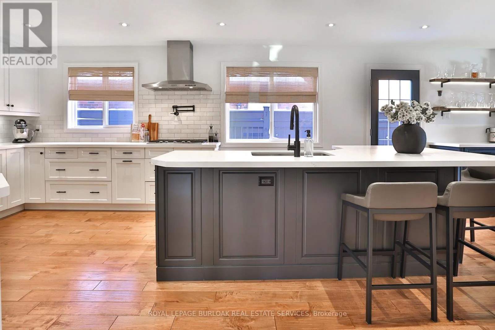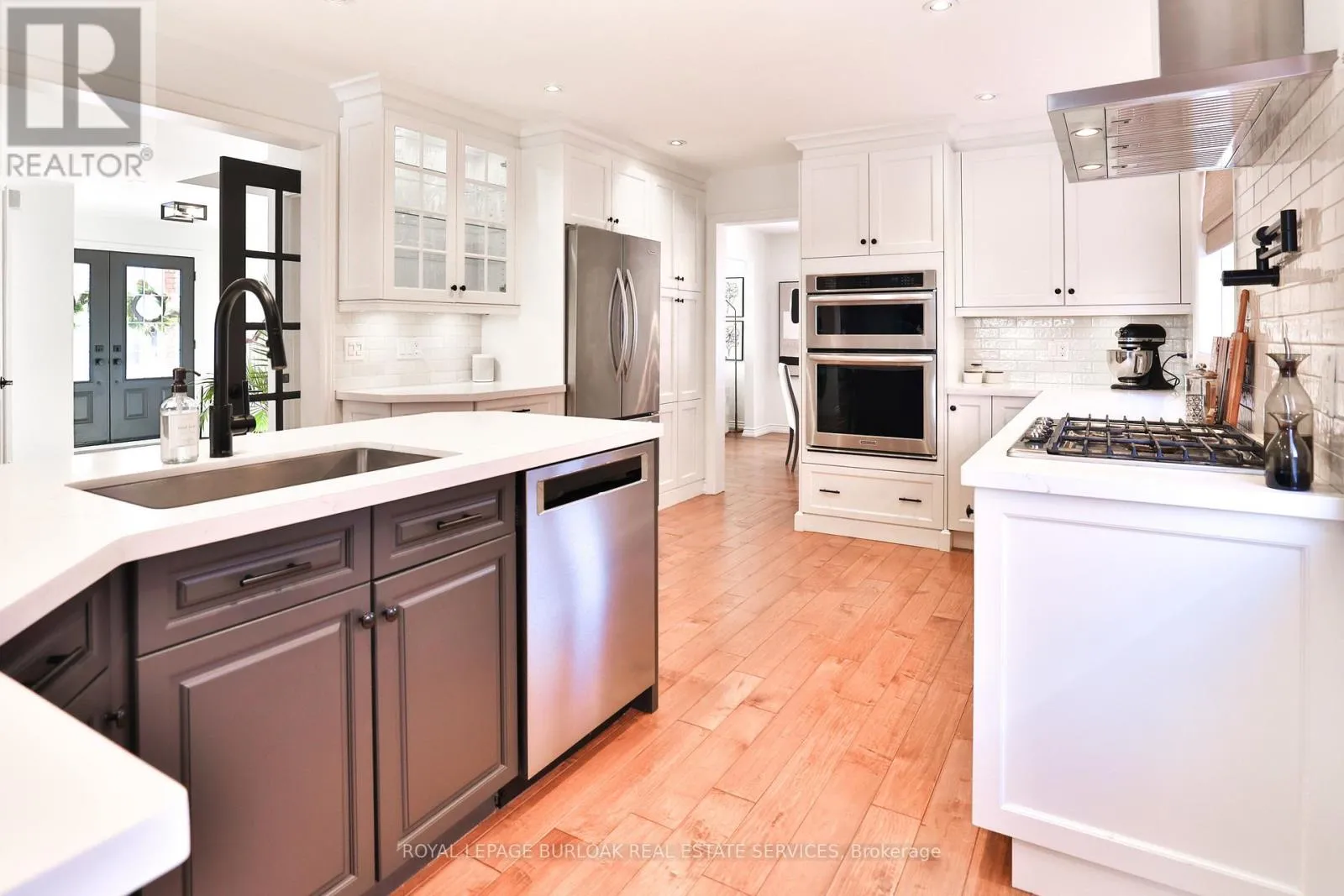 Cross Streets: RYERSON. ** Directions: WOODVIEW/RYERSON/HARMONY. Welcome to a must-see fully upgraded home siding onto a quiet, family-friendly court in one of Dynes' most sought-after neighbourhoods within the Tuck Nelson school district and just mins to DT Burlington & Oakville. Offering an exceptional blend of luxury and timeless charm, this residence delivers 3,927sf of living space and an in-ground pool designed for comfort & entertaining. Upon arrival, the home impresses w/ manicured landscaping, & an interlock walkway. Inside, find hardwood floors throughout and a functional layout ideal for family living. A spacious living room w/ a large picture window invites quiet mornings, while the dining room shines w/ designer lighting. At the heart of the home, the chef's kitchen is both stunning & practical-complete w/ quartz countertops, subway tile backsplash, SS appliances, wall oven, gas range w/ pot filler & hood, custom cabinetry, valence lighting, coffee bar, beverage fridge, walk-in pantry & an oversized island w/ breakfast bar. Walkouts from both the kitchen & family room create seamless indoor-outdoor flow. The family room is warm and inviting w/ a rustic stone gas fireplace, wood mantle, & custom built-ins-perfect for movie nights. A stylish powder room and home office complete this level. Upstairs, the expansive primary retreat features a walk-in closet, wall-to-wall built-in wardrobe, and a spa-inspired ensuite w/ dual vanity & oversized glass shower w/ bench. 3 additional bedrooms & a beautifully finished 5pc main bath provide ample space for a growing family. The fully finished lower level offers versatility w/ premium vinyl flooring, generous storage, laundry room, additional bedroom, glass-enclosed exercise room, sleek 4pc bath, a rec room w/ wetbar & a striking stone gas fireplace. Step outside to a private, south-facing backyard oasis-fully fenced and designed for entertaining w/ an in-ground pool, interlock patio, cabana w/ lighting, hot tub, & landscaping. This is family living at its finest, inside and out. (id:27476)