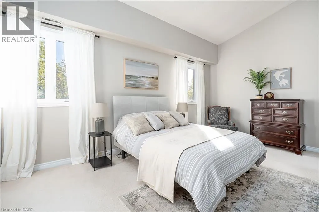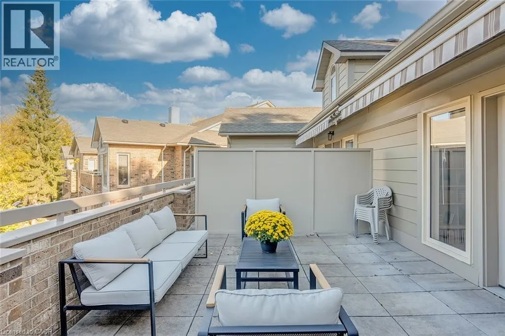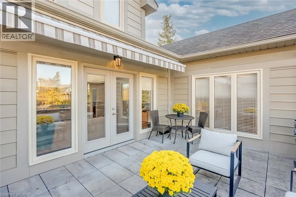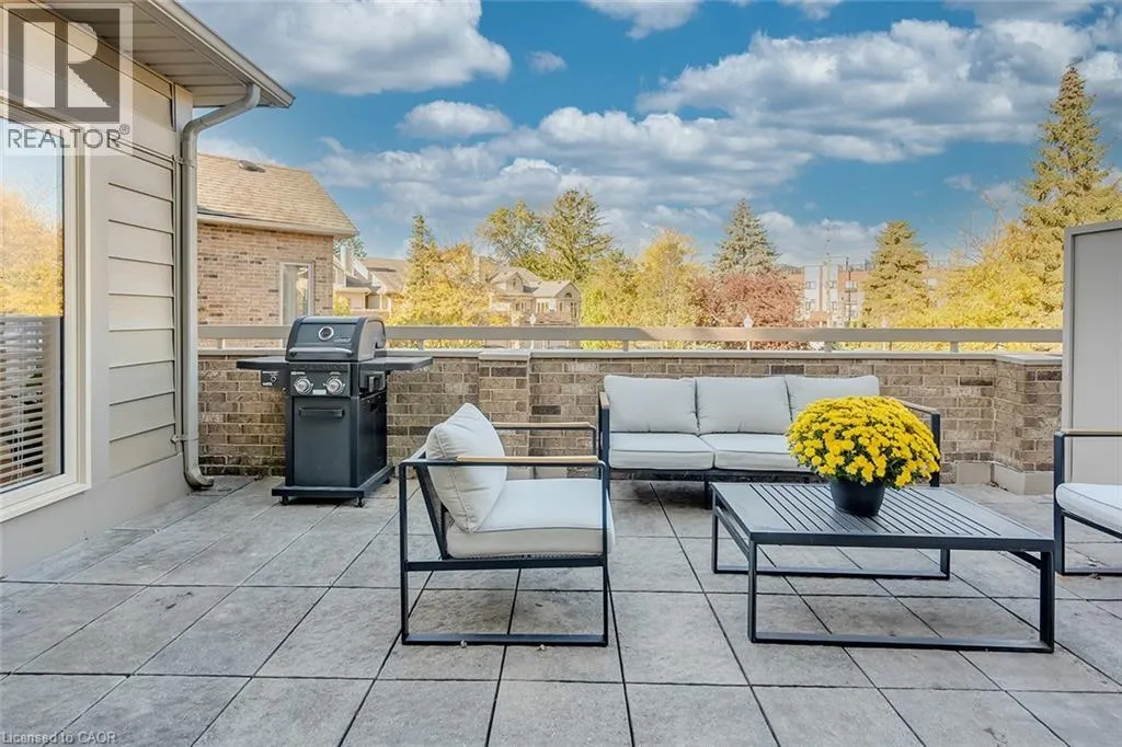 Lakeshore Road to Pine Cove Road to New Street Welcome to The Terraces, a prestigious and seldom-offered enclave nestled in one of Burlingtonâs most desirable neighbourhoods; Roseland. This bright end-unit townhome offers just over 1,900 sq. ft. of beautifully finished living space, featuring 2 bedrooms, 2 bathrooms, and an open-concept layout that blends comfort with timeless style. The spacious living and dining room is filled with natural light and highlighted by soaring vaulted ceilings, rich walnut flooring, and a cozy gas fireplace. French doors lead to your private terrace with an awning â an ideal spot to unwind outdoors, whether enjoying a quiet morning or a peaceful evening. The cheerful kitchen provides ample counter space and storage, while the main-floor primary suite is a true retreat with a 4-piece ensuite and generous his-and-hers closets. A second bedroom with a walk-in closet offers flexible space for guests or a home office, with convenient access to the main 3-piece bath. Main floor laundry further enhances the ease of everyday living. Downstairs, the fully finished basement adds valuable bonus space with a recreation room, den, and rough-in for an additional bathroom. Inside entry from the attached garage and plenty of visitor parking complete the package. With snow removal right to your door, landscaping, and exterior maintenance all taken care of, this home offers the ultimate in worry-free living â perfect for those seeking a simplified lifestyle without giving up space or quality. Ideally located close to downtown Burlington, the waterfront, parks and trails, shopping, and highway access, this immaculate home delivers exceptional comfort, convenience, and community in an unbeatable Roseland setting. (id:27476)