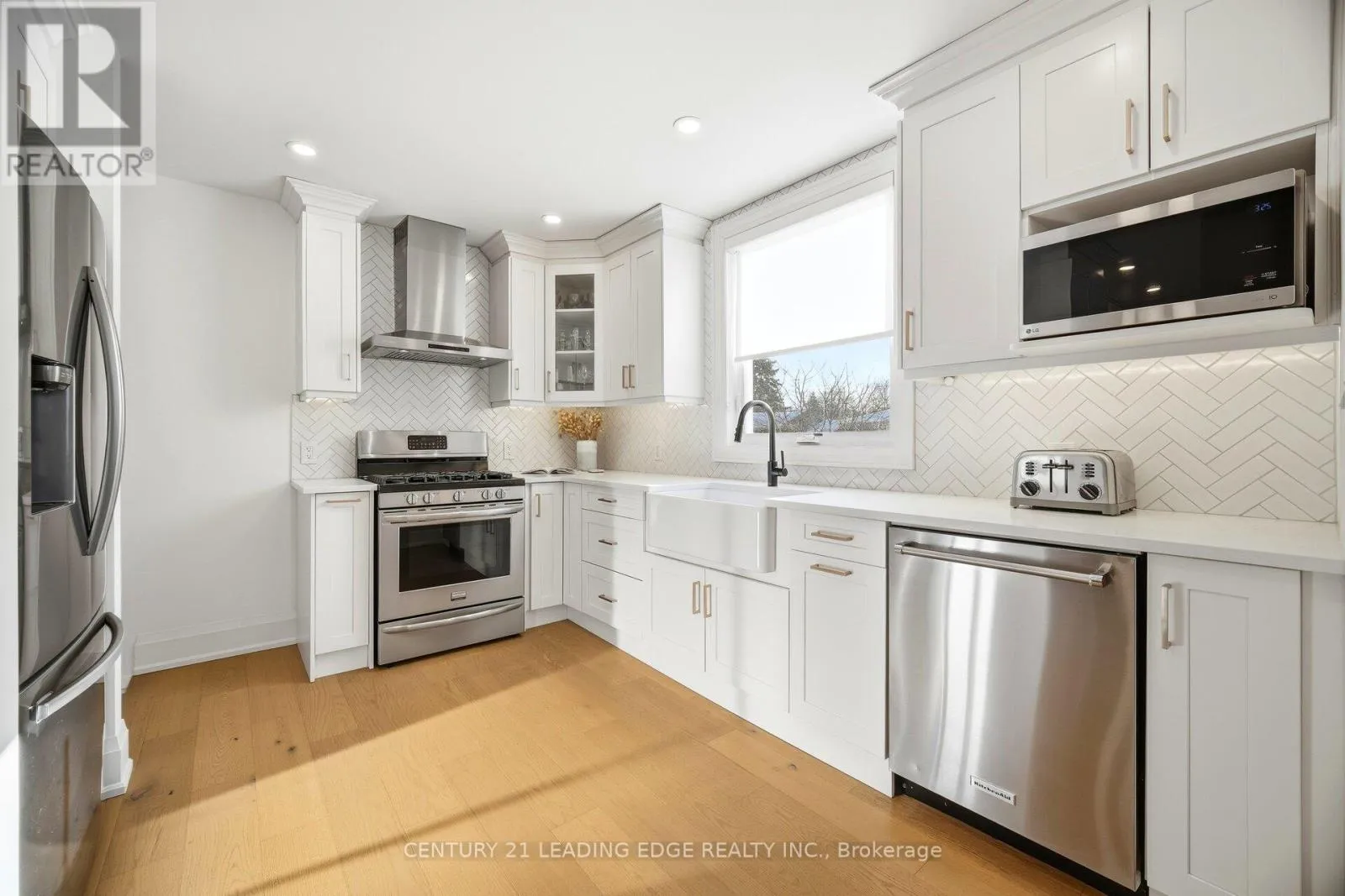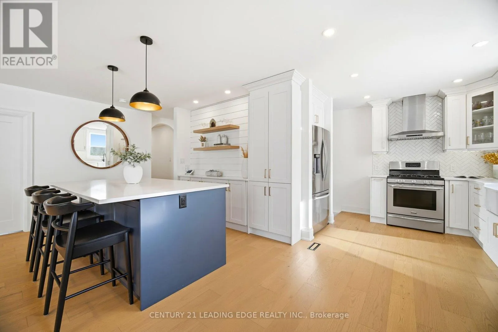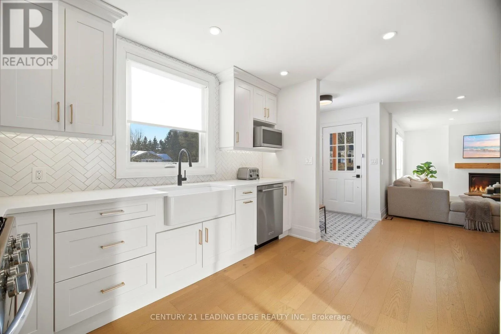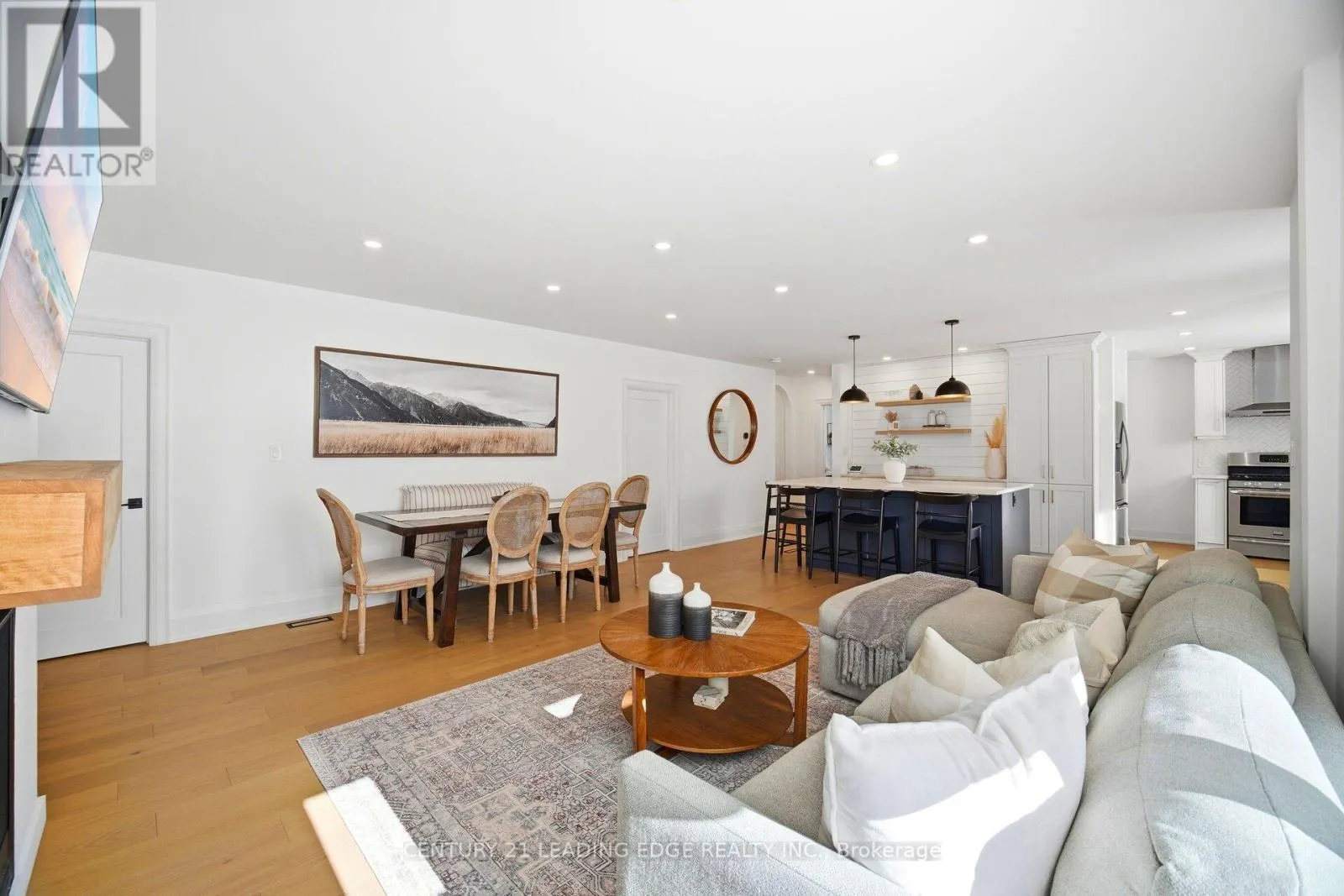 Kingsway and Townsend Welcome to 979 Kingsway Drive - a fully renovated, custom-finished bungalow nestled in one of Burlington's most sought-after pockets of Aldershot.Completely transformed in 2023, this home blends modern elegance with thoughtful functionality. Wide-plank engineered hardwood floors flow throughout the main level, complemented by upgraded trims, new interior doors, and designer lighting. The open-concept layout is centred around a stunning custom kitchen featuring premium Caesarstone quartz countertops, stainless steel appliances, a spacious island with double storage, and seamless sightlines into the living and dining areas - perfect for entertaining or everyday family living.The inviting living room is anchored by a new gas fireplace (B-Vent), adding warmth and character to the space.The primary bedroom retreat offers a beautifully finished ensuite and a custom built-in closet, complete with blackout blinds for added comfort and privacy. Additional bedrooms are generously sized, ideal for family, guests, or home office use. Bathrooms have been fully renovated with new fixtures, modern vanities, upgraded tile work, and timed exhaust fans.Major upgrades provide peace of mind:All new electrical and plumbing (2023) Furnace (2023) & Air Conditioning (2024)Windows (Upstairs 2023 / Basement 2019)Insulation (2022)Ecobee Smart Thermostat (2023)New driveway (2025)The exterior is equally impressive. Professionally landscaped grounds feature new sod (2024-2025), a refinished powered shed (2025), updated outdoor lighting with sensor garage lights, and a new deck extension with wrap-around stairs (2024). A backyard gas line (2022) makes outdoor cooking effortless.Situated in the highly desirable Aldershot/LaSalle community, this home offers quick access to parks, Burlington Golf & Country Club, Lake Ontario, top-rated schools, the GO Station, and major highways - making commuting simple while enjoying a mature, established neighbourhood (id:27476)