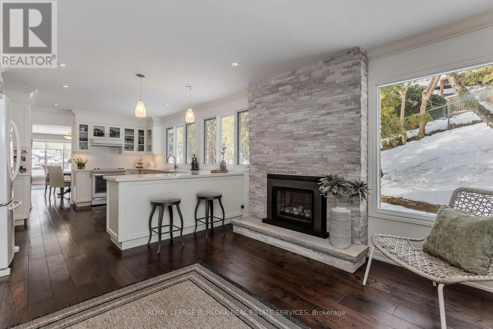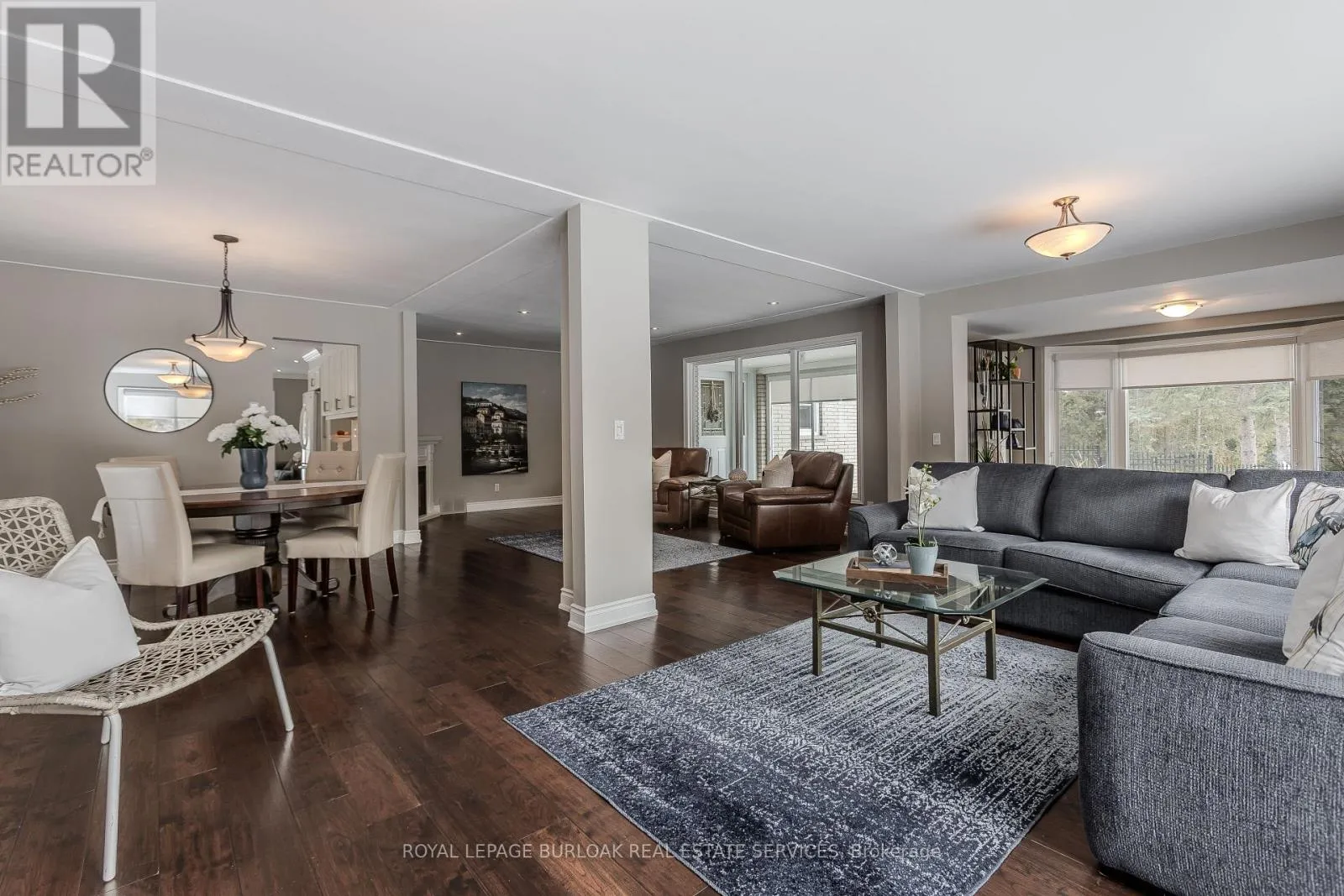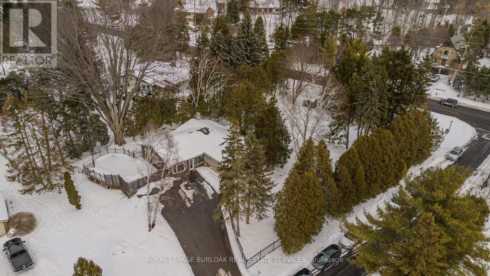 Cross Streets: Waterdown Road. ** Directions: Waterdown Road to Ireson Road. Key location for nature lovers, minutes from Smoky Hollow waterfalls, and countless trails to enjoy. This custom corner-lot ranch-style bungalow offers the perfect blend of nature and everyday convenience for families. With 3291sf of living space, this home delivers comfort and functionality, all surrounded by mature trees and peaceful scenery while still being close to daily amenities, GO Station, Hwys, Waterdown, Burlington and Hamilton. Beautiful curb appeal welcomes you with manicured gardens, glass-enclosed front porch, and large side yard w/ a wrought iron fence. Rare 9-car parking provides incredible flexibility for families or guests. Inside, an open-concept layout showcases hardwood flooring, large windows, and tons of natural light throughout. The living room features a fireplace, while the dining room offers a walkout to the yard. A den w/ a bay window creates an ideal reading nook or workspace. The spacious kitchen is designed for family life with tile backsplash, granite countertops, custom cabinetry, breakfast bar, and Whirlpool appliances, flowing seamlessly into a warm sitting room w/ a stone-surround gas fireplace. The main level features a spacious primary retreat w/ walk-in closet and private 4pc ensuite with dual vanity, along with three additional well-sized bedrooms and a modern 3pc bath with walk-in shower - ideal for busy family mornings. The finished basement expands your living space with laminate flooring, a large rec room with fireplace, dedicated home gym, and an additional bedroom - perfect for teens, guests, or multi-generational living. Step outside to an expansive backyard designed for making memories, featuring endless green space, a shed, and a large wood deck with pergola for relaxing or entertaining. The fenced above-ground pool with surrounding deck creates the ultimate summer hangout for kids and family gatherings. A rare opportunity to enjoy privacy, and nature - all while staying connected to everything your family needs. (id:27476)