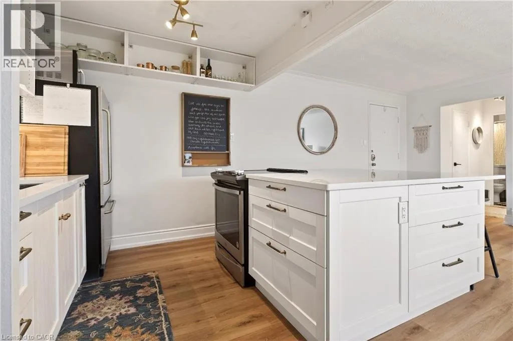BRANT / BLAIRHOLM NEWLY RENOVATED! Offered at $2250/month unfurnished and $2350/month furnished, this bright and stylish condo in the heart of Downtown Burlington offers large windows, natural light, and a welcoming place to call home. The open-concept layout features a newly renovated kitchen with a huge island, quartz countertops, and modern finishes, flowing seamlessly into the living area. The unit is freshly painted, carpet-free, and finished with new flooring throughout, updated lighting, and neutral tones. The updated 4-piece bathroom includes a new vanity and shower faucet. Window A/C units are installed in both the living room and bedroom. Three spacious closets provide ample storage, and one parking space is conveniently located beside the rear entrance. Walking distance to the waterfront, Spencer Smith Park, restaurants, shopping, and the GO Station, deal for tenants seeking comfort, natural light, and an unbeatable downtown lifestyle. (id:27476)