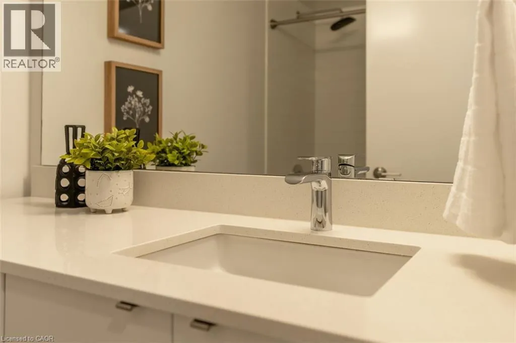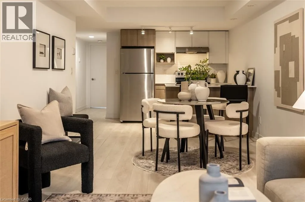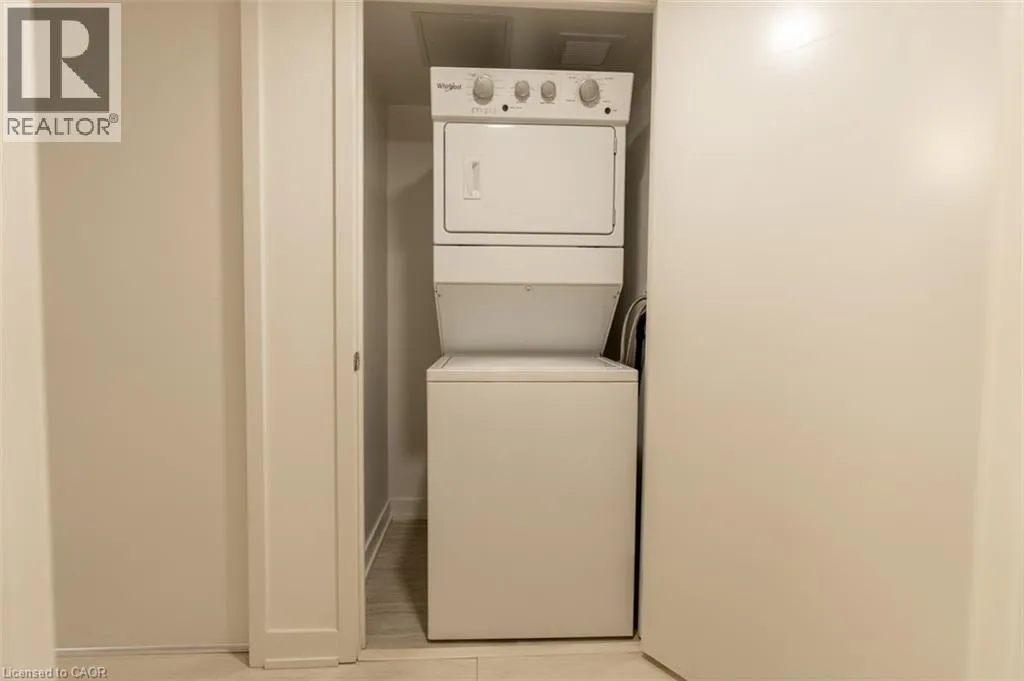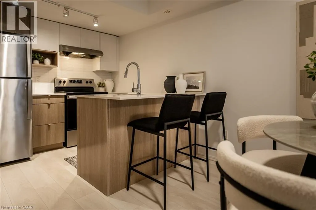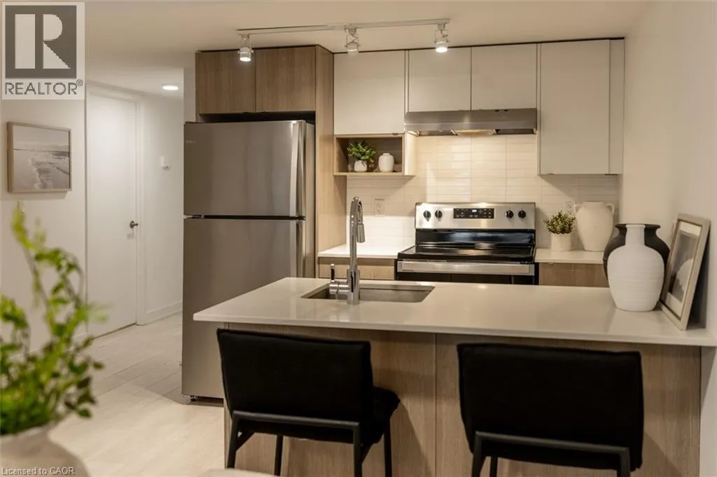 Waterdown Rd - Masonry Crt - Cooke Blvd Welcome to stylish, low-maintenance living in sought-after Stationwest. This bright 2-bedroom, 1-bath condo features an open-concept layout with wide-plank flooring and a walkout to a private balconyâperfect for morning coffee or evening relaxation. The modern kitchen offers quartz countertops, a stacked tile backsplash, stainless steel appliances, and an island with seating for casual dining or entertaining. Both bedrooms are spacious with large closets and oversized windows, while the spa-inspired bathroom includes quartz counters, porcelain tile floors, and a deep soaker tub with full-height tile surround. Complete with in-suite laundry and one underground parking space, this well-built condo is just steps to the GO station, major highways, shopping, dining, and the waterfrontâideal for commuters and those seeking convenience and comfort. (id:27476)