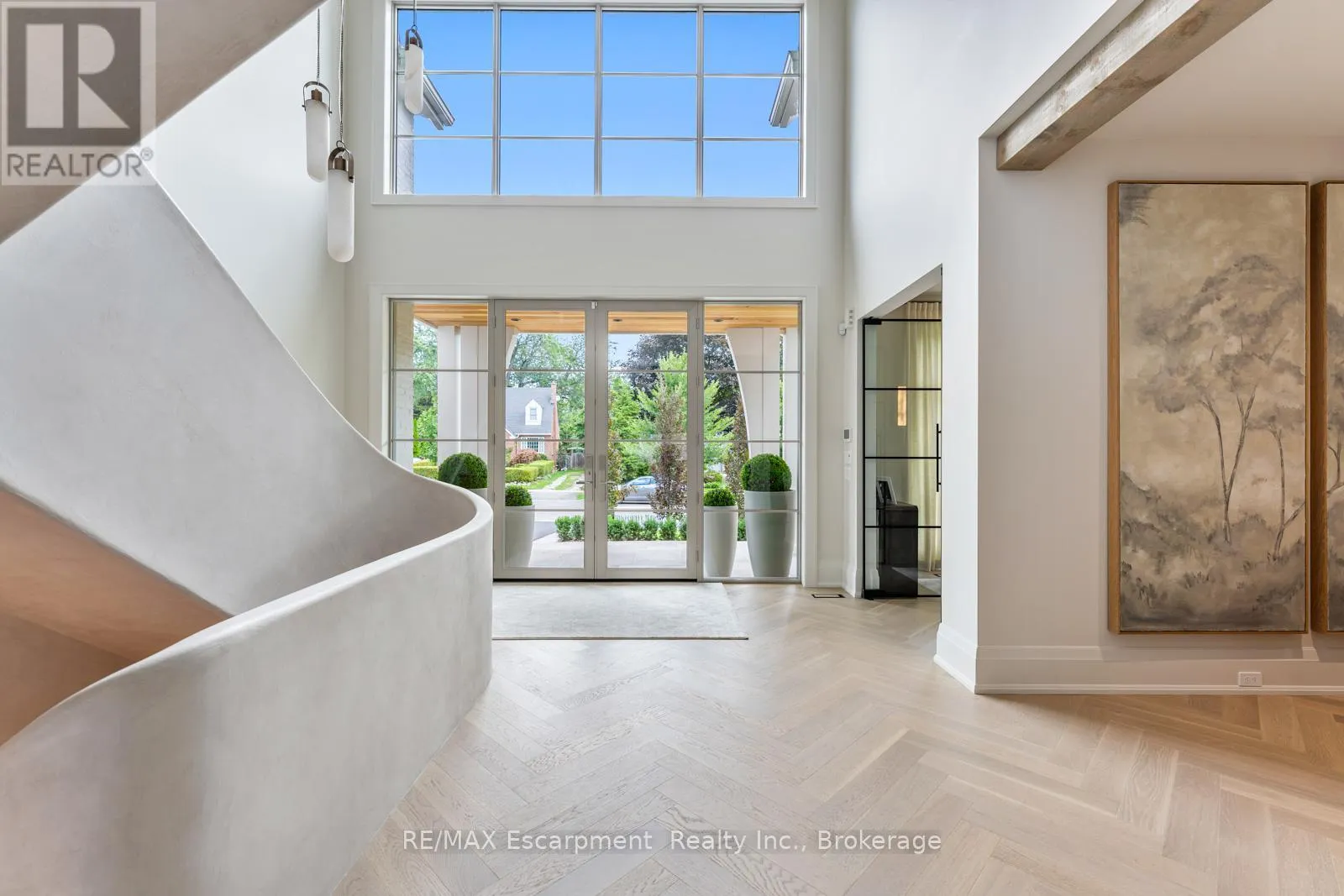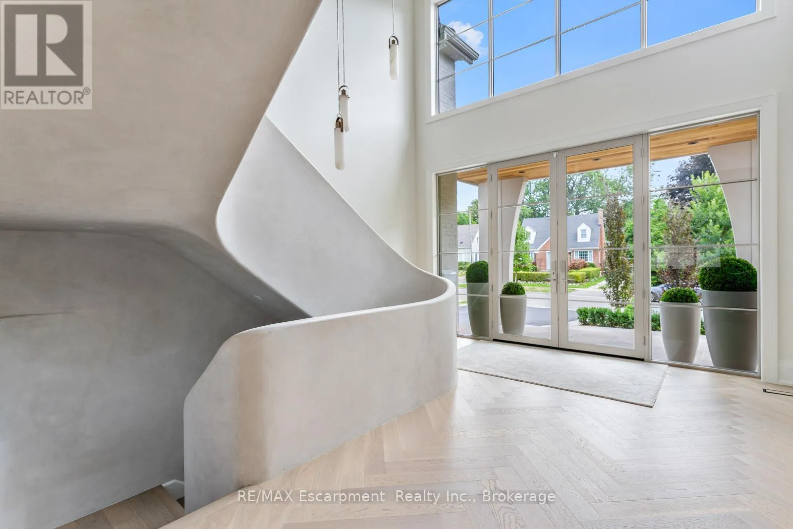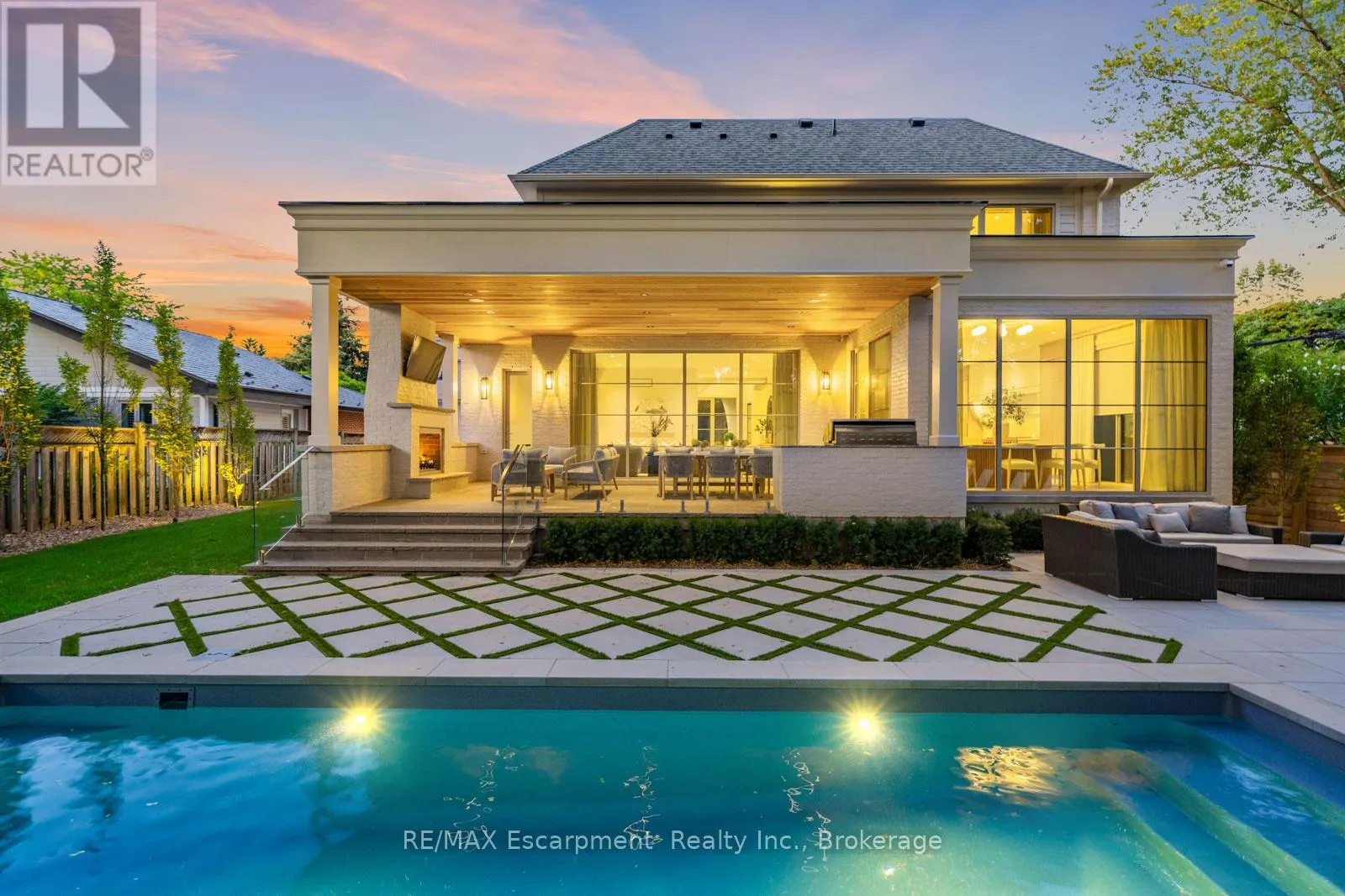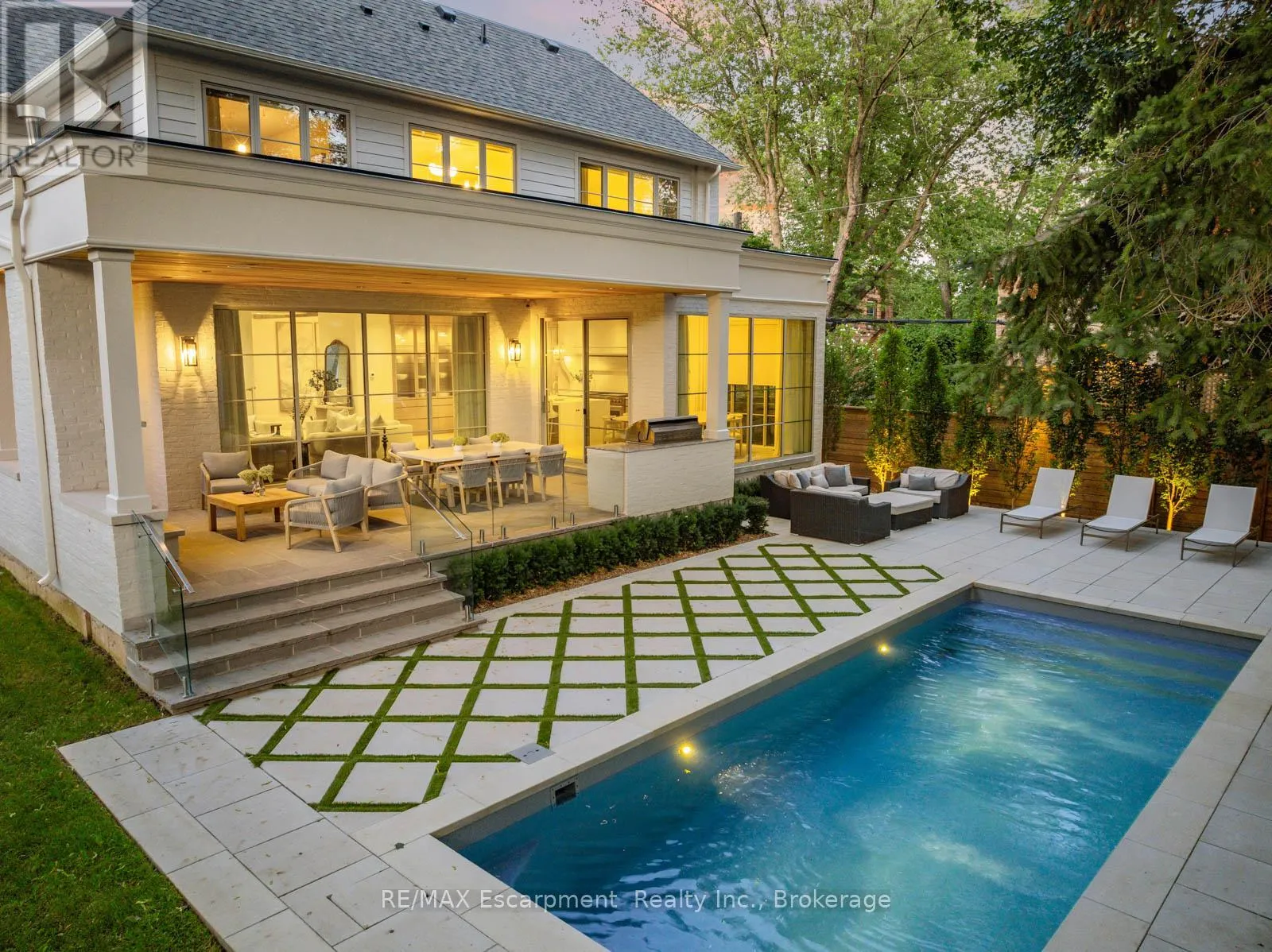 Cross Streets: Rossmore and South. ** Directions: Lakeshore to Pomona. Welcome to 304 Pomona Avenue, a truly magnificent newly built home in Burlington's highly coveted Roseland community. Step inside and you're greeted by an incredible hand-carved plaster staircase rising through all three levels that's perfectly paired with rift-cut white oak herringbone floors that set an elevated tone. A formal dining room makes a statement with decorative ceiling beams, a glass wine display, and a marble wet bar. The private library draws you in, finished with oak panelled walls and a reading nook with floor-to-ceiling corner windows that flood the room with natural light. The living room completes the main level's gathering spaces with its plaster fireplace, oak shelving with integrated lighting, and full in-ceiling speakers. At the heart of the home, the kitchen offers a large custom plaster hood, oversized waterfall island, porcelain counters, and top-tier appliances including a 60" Wolf double oven, Sub-Zero fridge and freezer, and Bosch dishwasher. Pantry storage with reeded glass cabinetry and a walk-through servery extends the workspace. Just beyond, the breakfast area opens to a beautiful and serene covered terrace with a built-in BBQ, outdoor fridge, fireplace, and cedar-lined ceiling-overlooking the saltwater pool and landscaped gardens. Upstairs, four bedrooms each include private ensuites. The primary suite features a spacious walk-in closet and a spa-like bath with dual vanities, soaker tub, heated floors, and oversized shower. A full laundry room with custom cabinetry completes this level. The lower level expands the living space with a second kitchen, home theatre, gym, fifth bedroom, full bath, and radiant heated floors. Outside, stone patios, mature landscaping, irrigation, and a hydrangea wall create a welcoming backdrop. With 4+1 bedrooms, 7 bathrooms, and over 6,000 sq. ft. of living space, this Roseland residence combines thoughtful design with everyday comfort. Move in and enjoy! Luxury Certified. (id:27476)