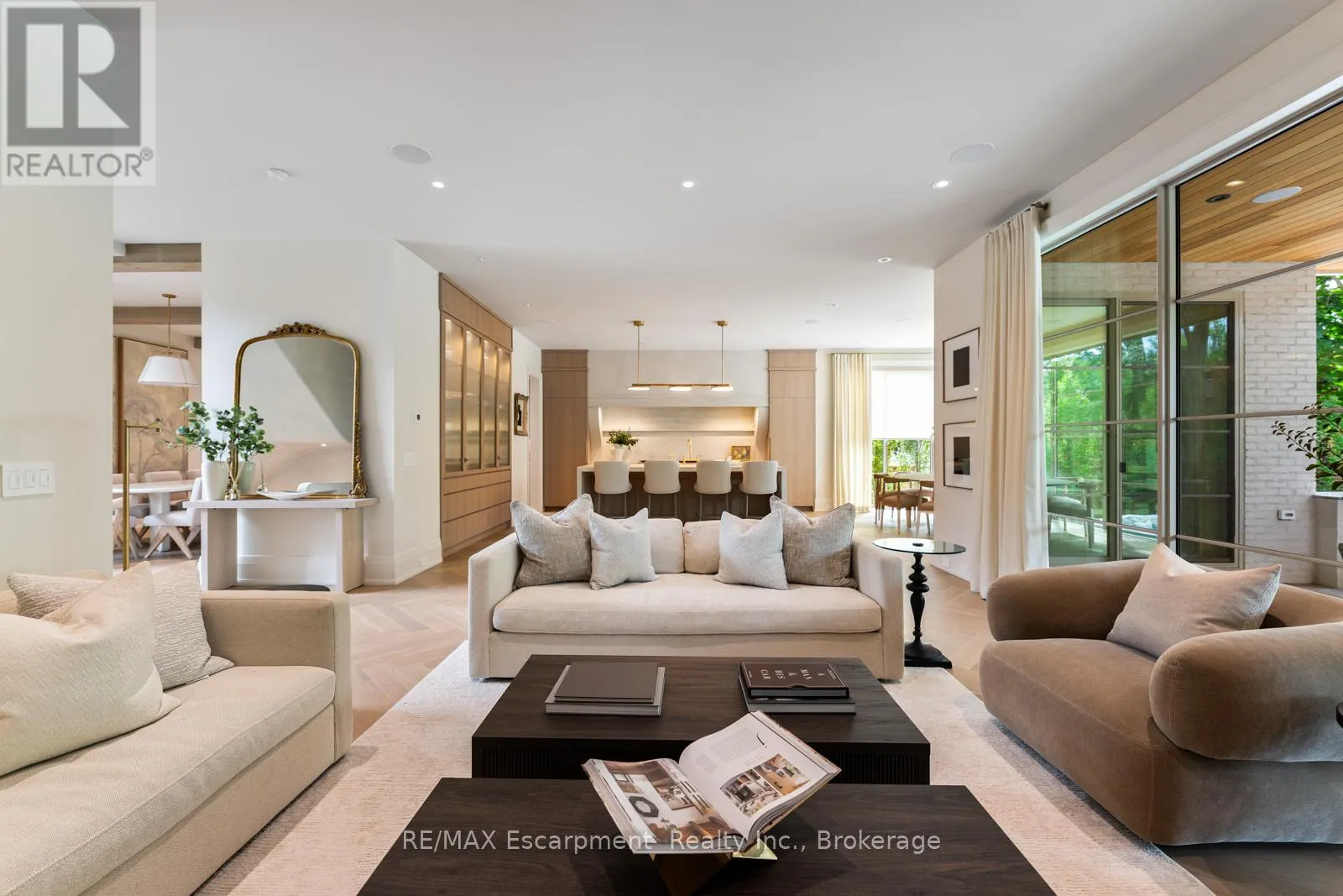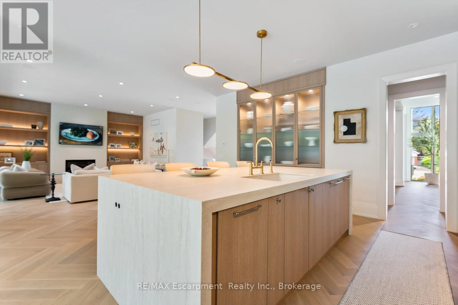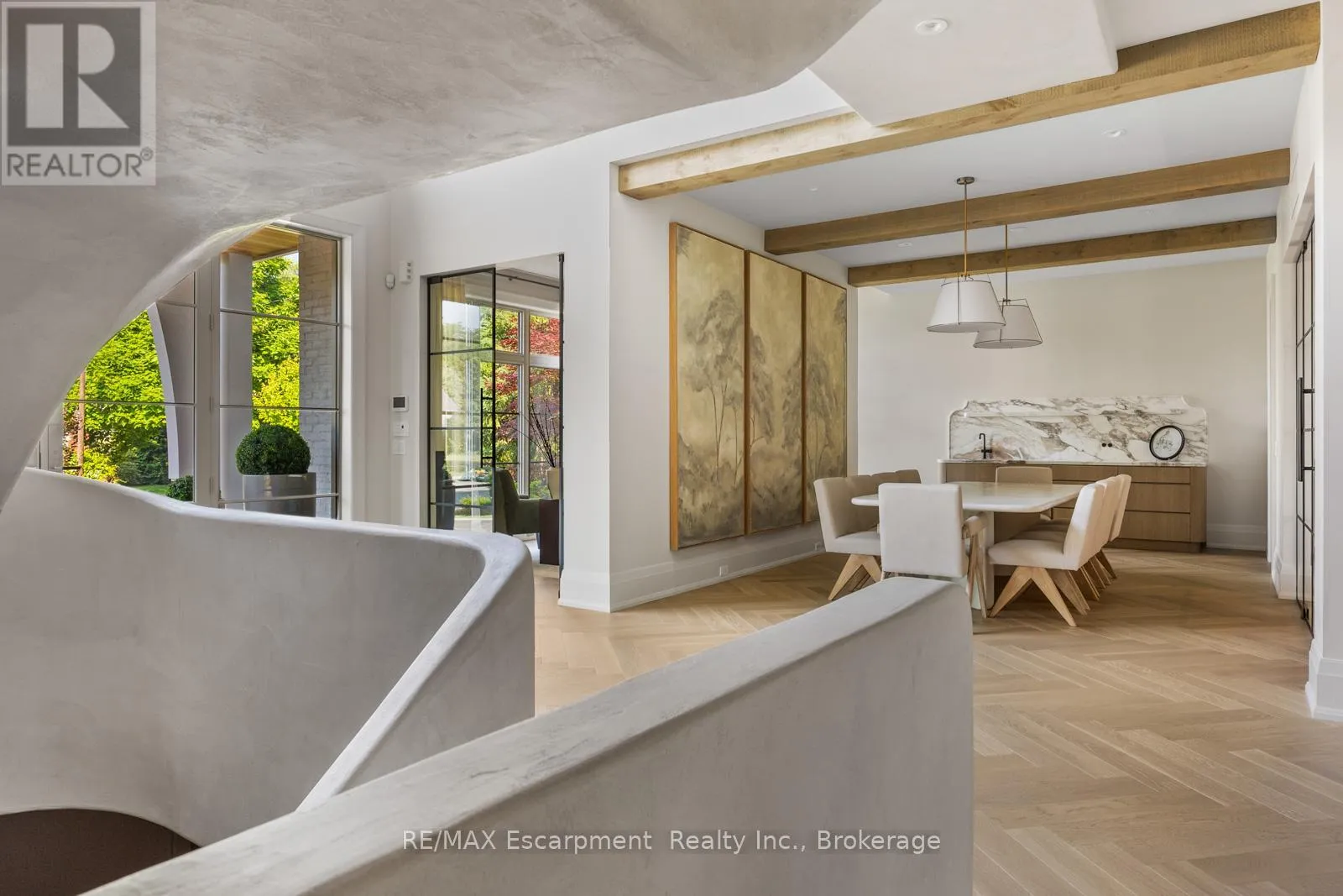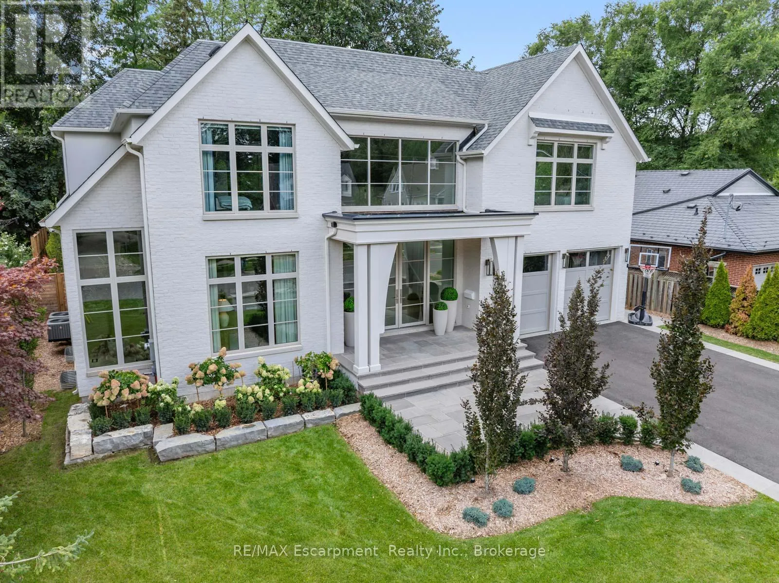 Cross Streets: Rossmore and South. ** Directions: Lakeshore to Pomona. Welcome to 304 Pomona Avenue, a truly magnificent newly built home in Burlington's highly coveted Roseland community. Step inside and you're greeted by an incredible hand-carved plaster staircase rising through all three levels that's perfectly paired with rift-cut white oak herringbone floors that set an elevated tone. A formal dining room makes a statement with decorative ceiling beams, a glass wine display, and a marble wet bar. The private library draws you in, finished with oak panelled walls and a reading nook with floor-to-ceiling corner windows that flood the room with natural light. The living room completes the main level's gathering spaces with its plaster fireplace, oak shelving with integrated lighting, and full in-ceiling speakers. At the heart of the home, the kitchen offers a large custom plaster hood, oversized waterfall island, porcelain counters, and top-tier appliances including a 60" Wolf double oven, Sub-Zero fridge and freezer, and Bosch dishwasher. Pantry storage with reeded glass cabinetry and a walk-through servery extends the workspace. Just beyond, the breakfast area opens to a beautiful and serene covered terrace with a built-in BBQ, outdoor fridge, fireplace, and cedar-lined ceiling-overlooking the saltwater pool and landscaped gardens. Upstairs, four bedrooms each include private ensuites. The primary suite features a spacious walk-in closet and a spa-like bath with dual vanities, soaker tub, heated floors, and oversized shower. A full laundry room with custom cabinetry completes this level. The lower level expands the living space with a second kitchen, home theatre, gym, fifth bedroom, full bath, and radiant heated floors. Outside, stone patios, mature landscaping, irrigation, and a hydrangea wall create a welcoming backdrop. With 4+1 bedrooms, 7 bathrooms, and over 6,000 sq. ft. of living space, this Roseland residence combines thoughtful design with everyday comfort. Move in and enjoy! Luxury Certified. (id:27476)