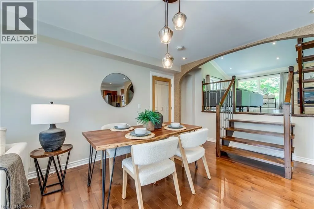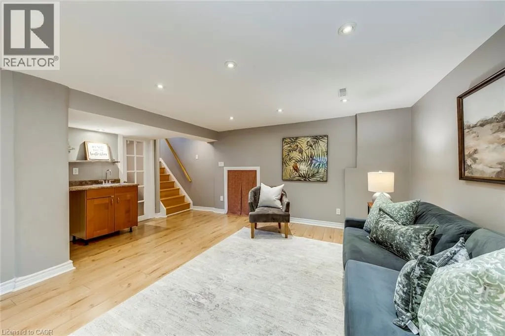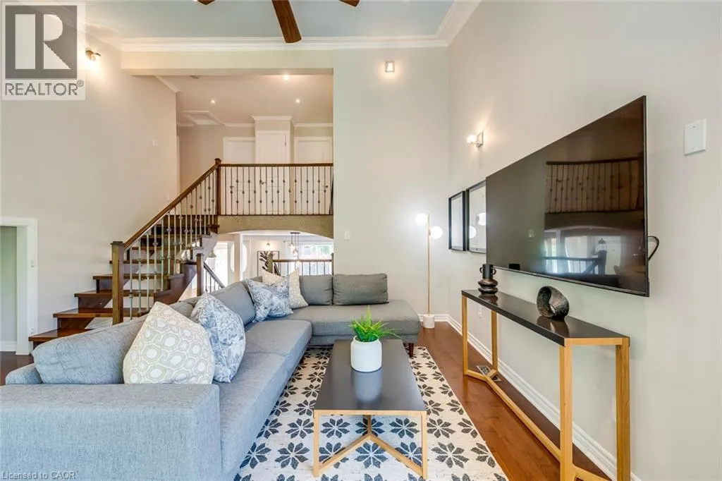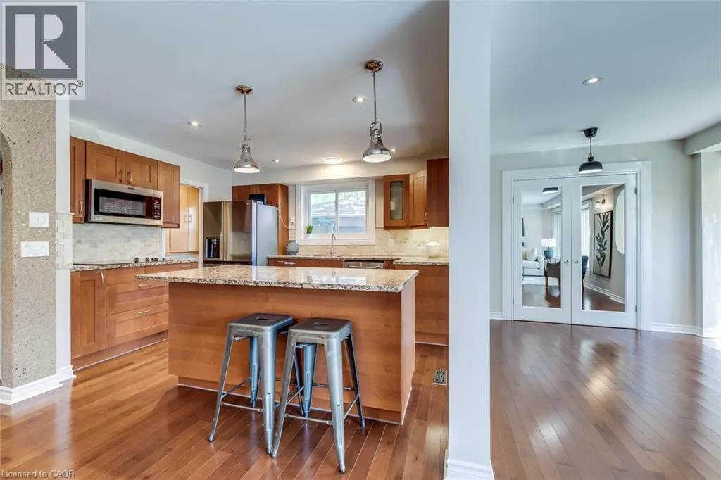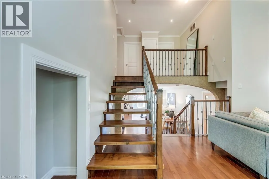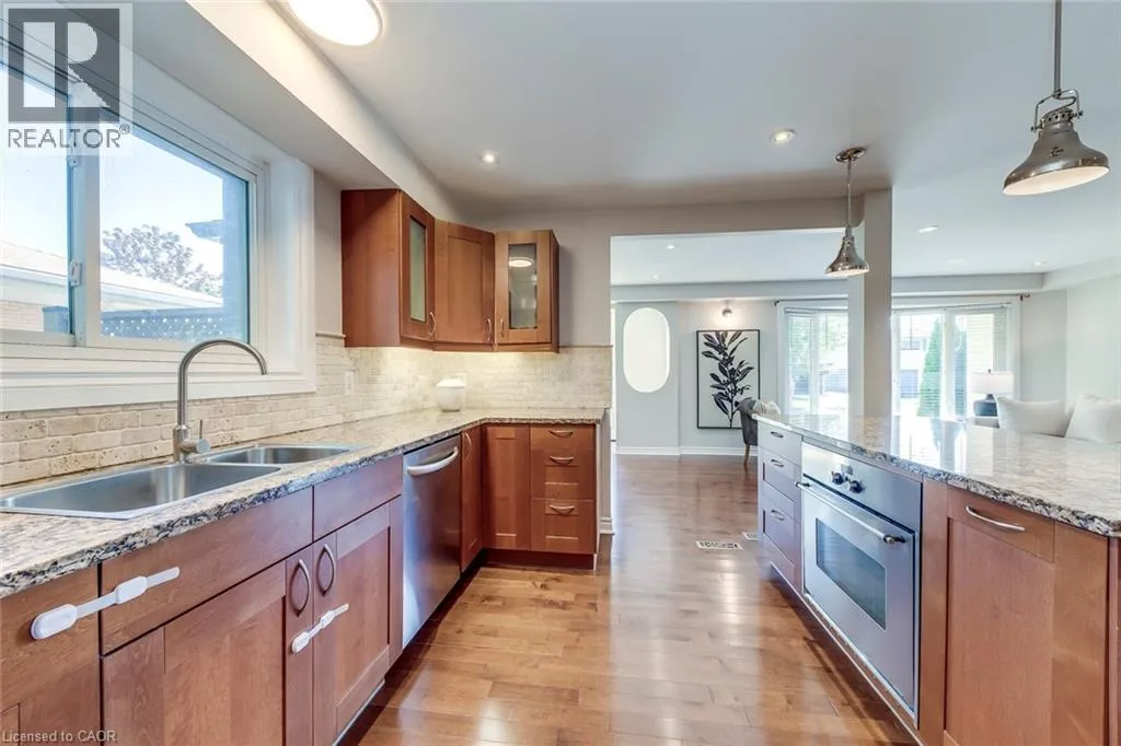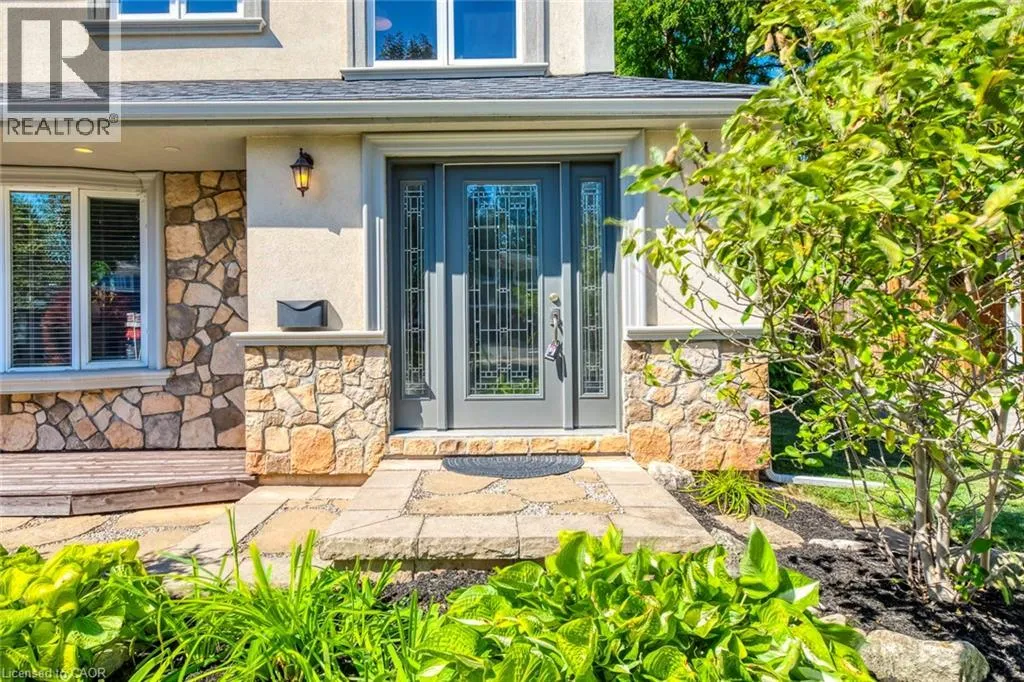 Pinedale to Mullin to Cindy This spacious 3+1 bedroom, 4-bathroom custom-built home sits on a quiet street in Burlingtonâs sought-after Pinedale, just minutes from parks, schools, shopping, and major highways. Offering nearly 2,680 sqft above grade plus a fully finished basement, itâs ideal for growing families. The modern stucco exterior with large windows adds striking curb appeal. Inside, the main floor features an open-concept layout with a bright living room and a large eat-in kitchen showcasing hardwood cabinetry, a generous island, stone counters, and premium stainless steel appliances. The upgraded laundry/mud room provides access to both the garage and backyard. A raised second level impresses with soaring cathedral ceilings, massive windows, and a versatile family/dining space. An elegant open-riser staircase leads to the third floor with a luxurious primary suite offering wall-to-wall custom closets, oversized windows, and a spa-like ensuite with glass shower. Two additional bedrooms share a renovated 4-piece bath. The finished basement boasts above-grade windows, a spacious rec room with wet bar, a fourth bedroom, and full bath. Outdoors, the backyard offers space to relax or entertain amid mature trees and established landscaping. The location is unmatchedâ15 minutes on foot to Fortinos, Shoppers, and Appleby Plaza restaurants; five playgrounds within walking distance; and easy access to Centennial Bikeway, downtown Burlington, the lakefront, Burloak Waterfront Park, and GO transit. Just a short drive to RioCan Centre with shops, restaurants, cinema, and a soon-to-open Costco. Recent upgrades include front and back decks stained (2025), interlock patio (2025), fridge (2024), washer (2022), and microwave (2022). (id:27476)