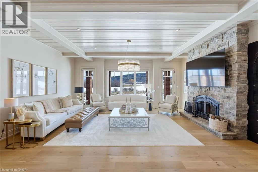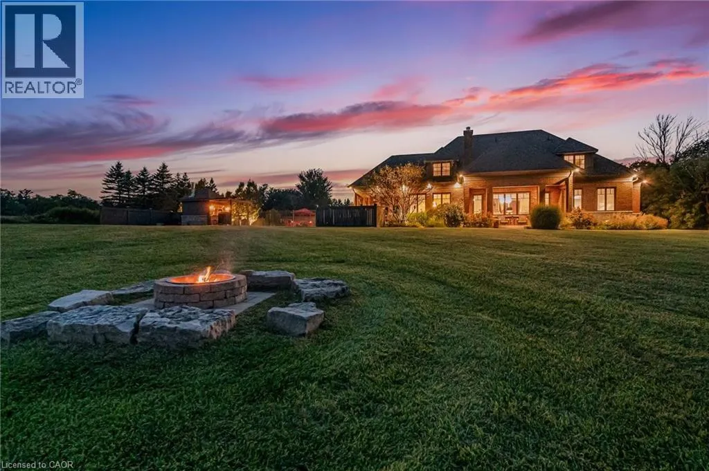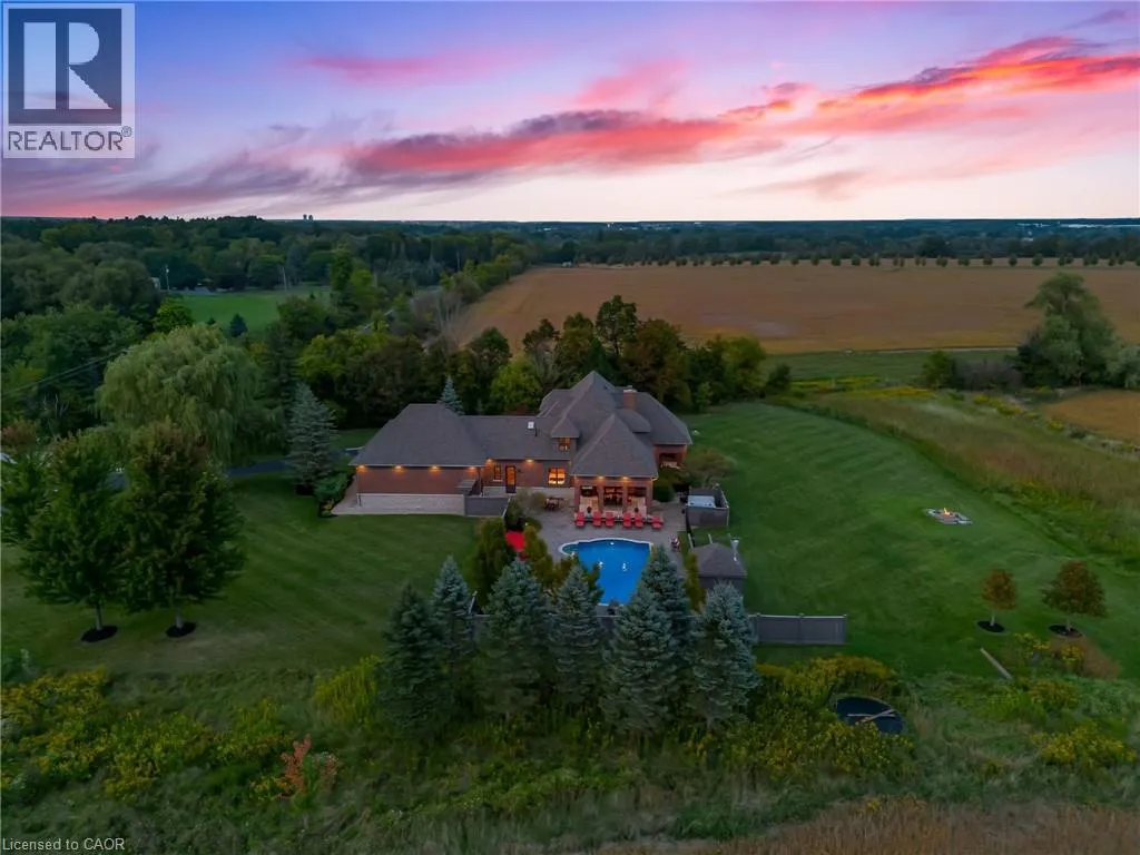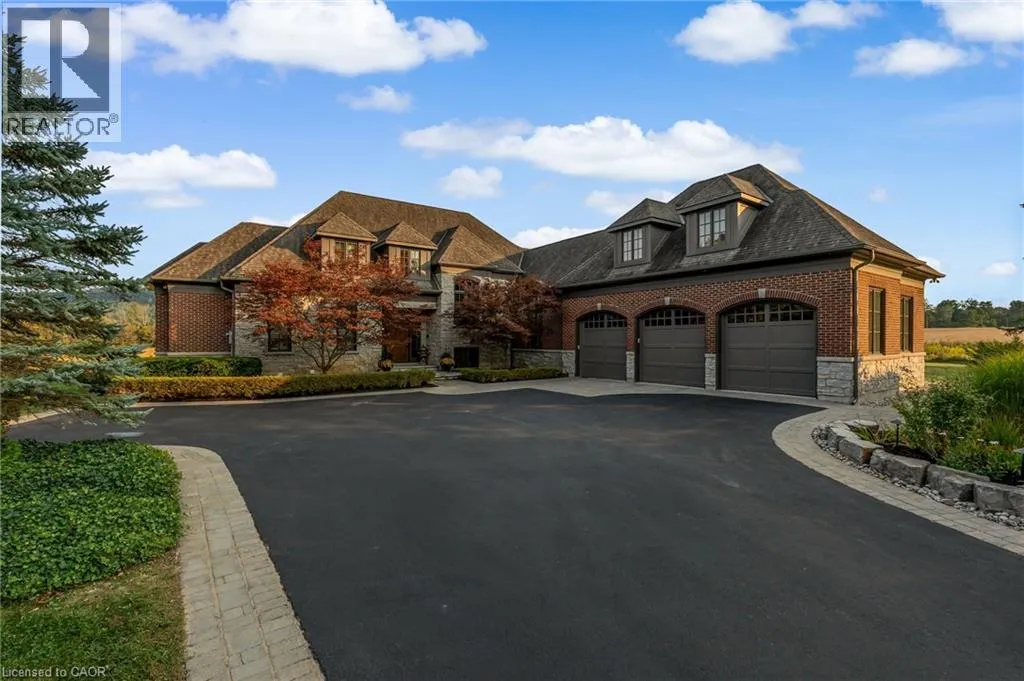Walkers line to Britannia Road A rare opportunity to enjoy a private, cottage-like escape without ever leaving home. Set on manicured, meticulously maintained grounds, this property offers complete privacy and a serene atmosphere that feels worlds awayâyet remains minutes from top private and public schools, prestigious golf courses, parks, trails, and local farms. This beautifully designed custom two-storey home features over 5,800 sq. ft. of finished living space, crafted with exceptional attention to detail. The moment you enter, youâre greeted by designer finishes and architectural touches, including a sunken family room with wood-beamed ceilings and a striking Owen Sound stone wood-burning fireplace. With 5 bedrooms and 6 bathrooms, the home blends luxury living with true resort-style amenities. Itâs ideal for both intimate family living and large-scale entertaining, indoors and out. The backyard is a private oasis, perfect for hosting gatherings or enjoying peaceful summer days. A large covered porch overlooks the in-ground heated pool, hot tub, cabana, and fire pitâan inviting space for sunset views, roasting marshmallows, or unwinding in total seclusion. The fully finished lower level extends the homeâs entertainment and lifestyle appeal, offering a private gym, oversized bar, expansive media area with surround sound, wine room, dedicated office, and an additional bedroom with a 3-piece bathroom. This is more than a homeâitâs a sanctuary, a retreat, and a place to live, entertain, and escape in complete privacy. (id:27476)
