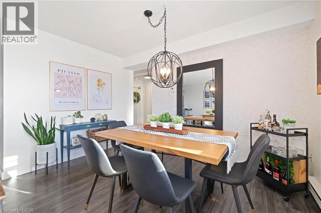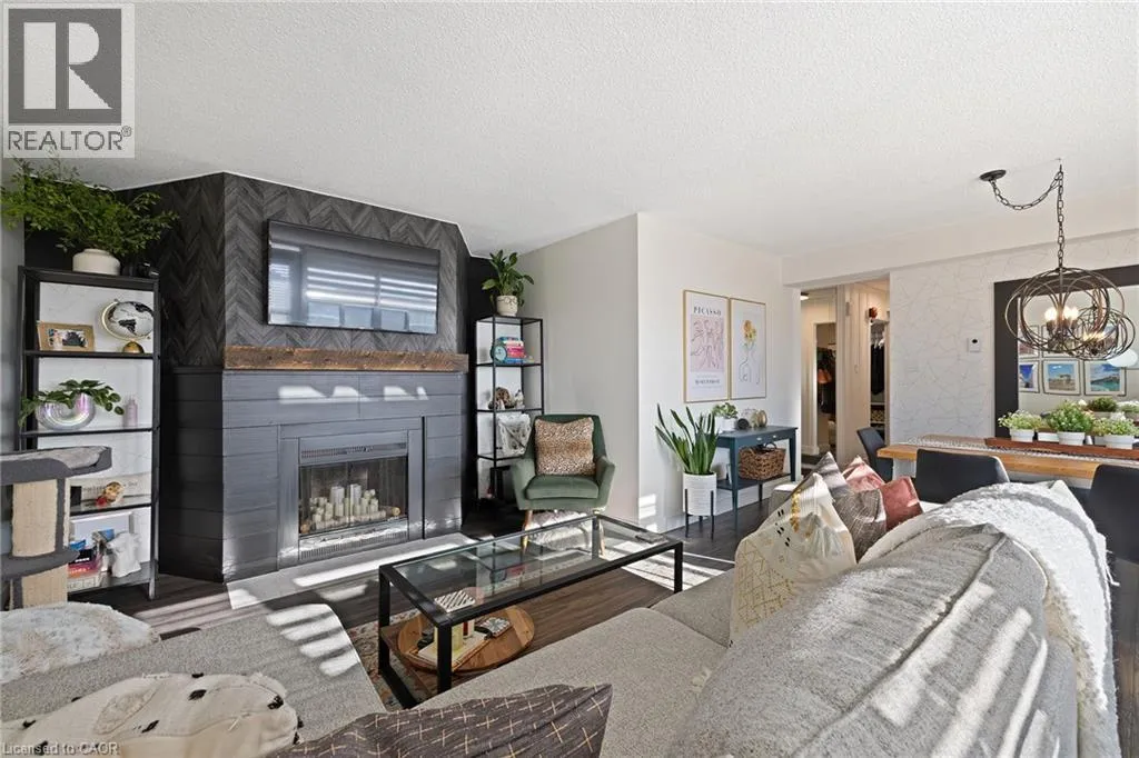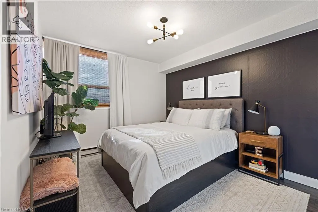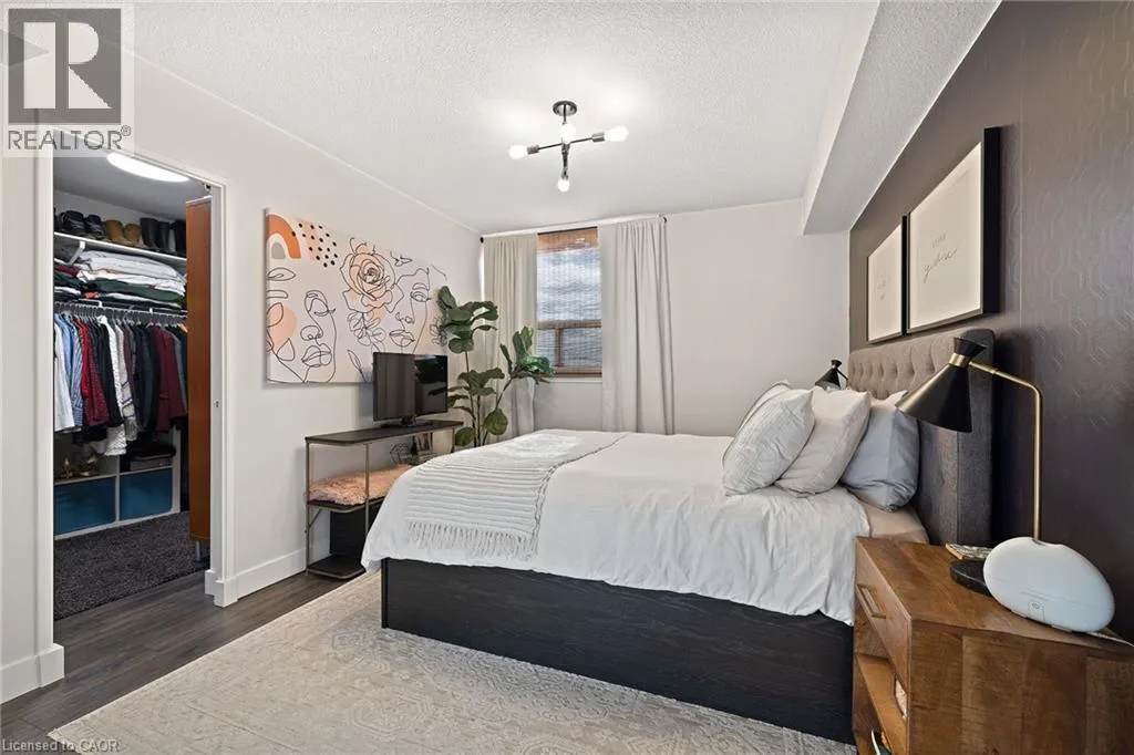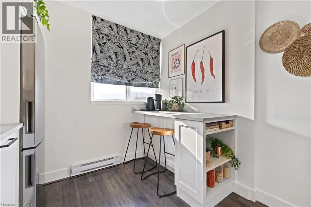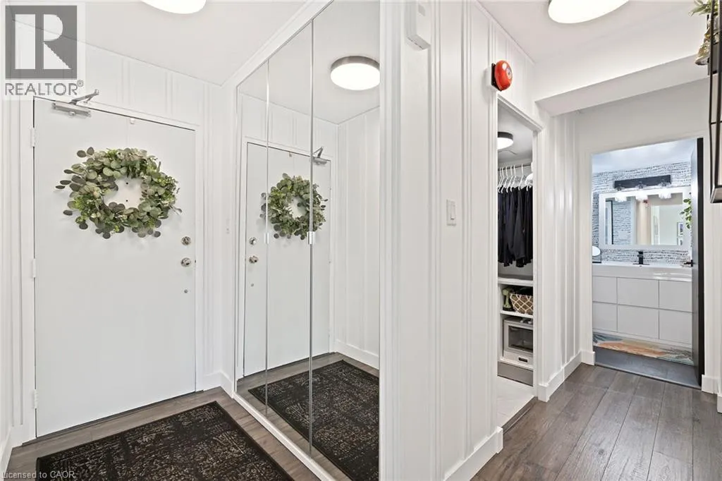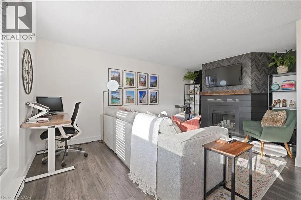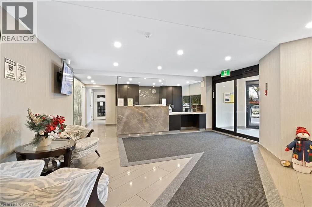 Guelph to Prospect to Dynes Welcome to the Empress, a well-managed condominium with 24 hour concierge, steps from Burlington Centre, Farm Boy, Denningers, public transit, parks, and quick highway access. This beautifully renovated 1+ Den, 2 bath suite boasts outstanding value and exceptional livability. The unit features newer flooring throughout, upgraded lighting, and a luxurious main bathroom. The sleek, renovated kitchen includes a custom built-in pantry, modern finishes, island and thoughtful storage solutions that maximize every inch. The spacious living room features a comfortable layout with a walkout to the private balcony, while the separate den is ideal for an office or quiet reading space. The dining area easily accommodates a full-sized dining table, making entertaining effortless. The primary bedroom includes a rare walk-in closet and convenient two-piece ensuite. Additional features include a full laundry room, PAX wardrobe system in the front hall closet, and custom built-in storage throughout the suite creating a highly functional and organized home. The Empress provides excellent amenities, including a renovated party room & gym, outdoor pool, and underground parking. Beautifully updated, move-in ready, and located in one of Burlington's most convenient neighbourhoods-this condo is a must-see. (id:27476)