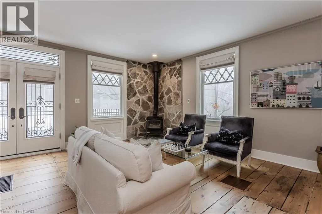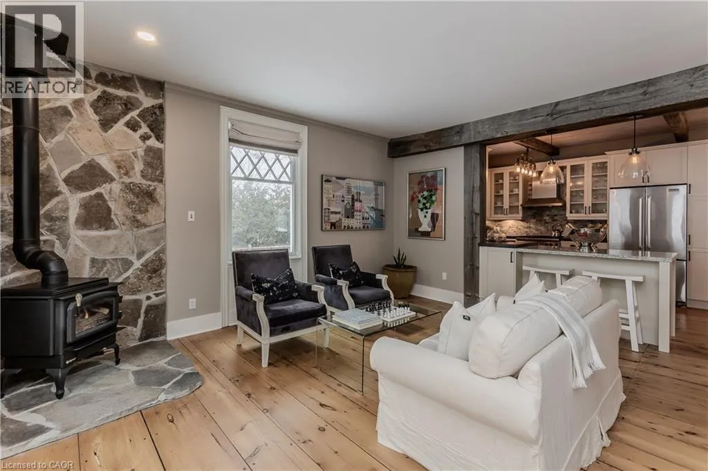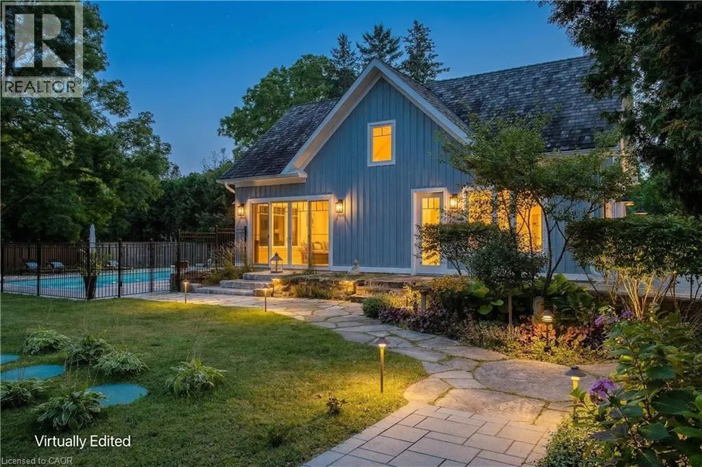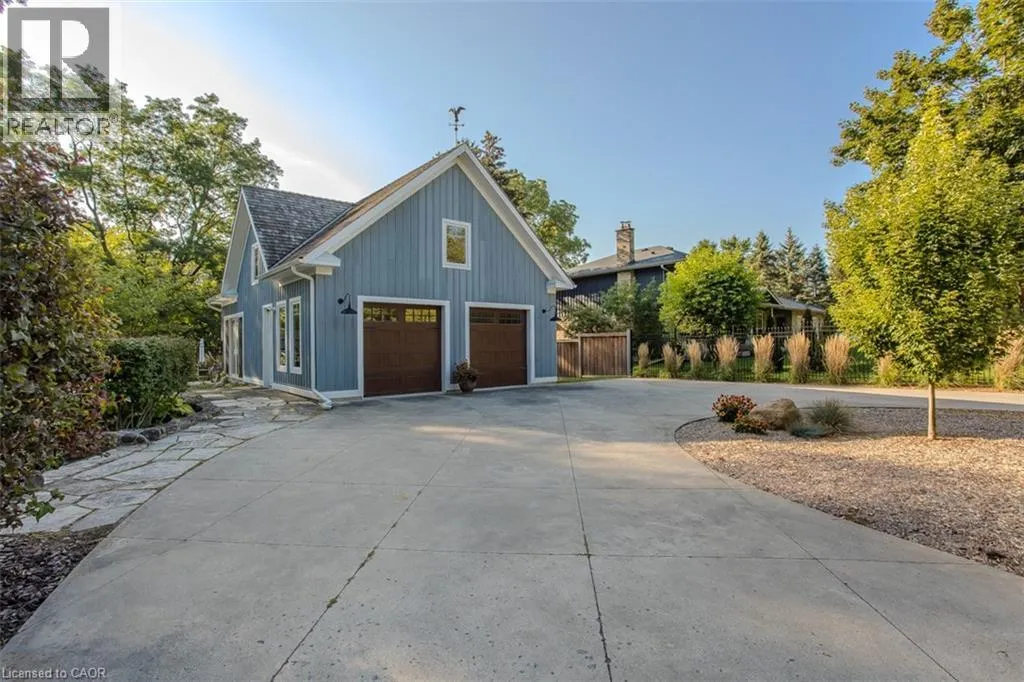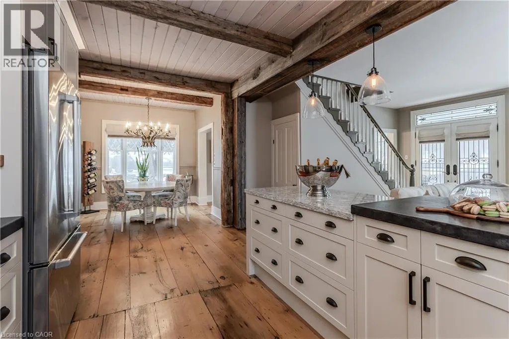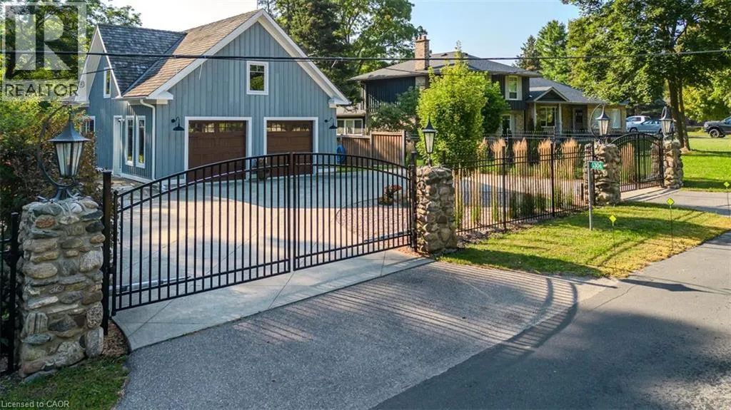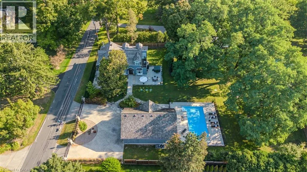 Cedar Springs Rd to McNiven Discover the perfect blend of rural charm and refined luxury on an exceptional property that offers the tranquility of country living while remaining just mins from Burlingtonâs everyday amenities, schools, shopping, and hwys. Set behind automated wrought iron gates is one of the most historic homes in the area originally from 1875. Inside, rustic character meets modern comfort. A welcoming foyer with heated floors sets the tone, while beautiful 1875 wood floors (2020), 8â baseboards, and designer lighting add warmth throughout. The heart of the home is the kitchen featuring concrete countertops, custom cabinetry, SS appliances, wood beam accents, tile backsplash, and a breakfast bar, seamlessly connecting to a bright breakfast area with a bay window. Multiple gathering spaces offer flexibility for living and entertaining, including a family room with stone-surround fireplace, formal dining room, and a living room with wood paneling, French doors, and a bay window. A main-floor bedroom and beautifully renovated 3pc bath with heated floors and glass shower provide ideal space for guests or multigenerational living. Upstairs, the expansive primary retreat impresses with vaulted 12â ceilings, automated blinds, private balcony, and a custom California Closets walk-in. The spa-inspired ensuite features a freestanding tub, and glass walk-in shower. 2 additional spacious bedrooms and a stylish 4pc bath complete the level. The heated garage is a dream entertainment space, and offers polished concrete floors, automated blinds, and an EV charger rough-in. The partially renovated lower level provides excellent storage, laundry with new machines, a workbench, and walkout cellar doors. Outdoors, the fully fenced backyard is a true private retreat with a professionally landscaped stone patio, flagstone pathways, inground pool, hot tub, fire pit, and large shedâperfect for family gatherings, summer entertaining, and peaceful evenings under the stars. (id:27476)
