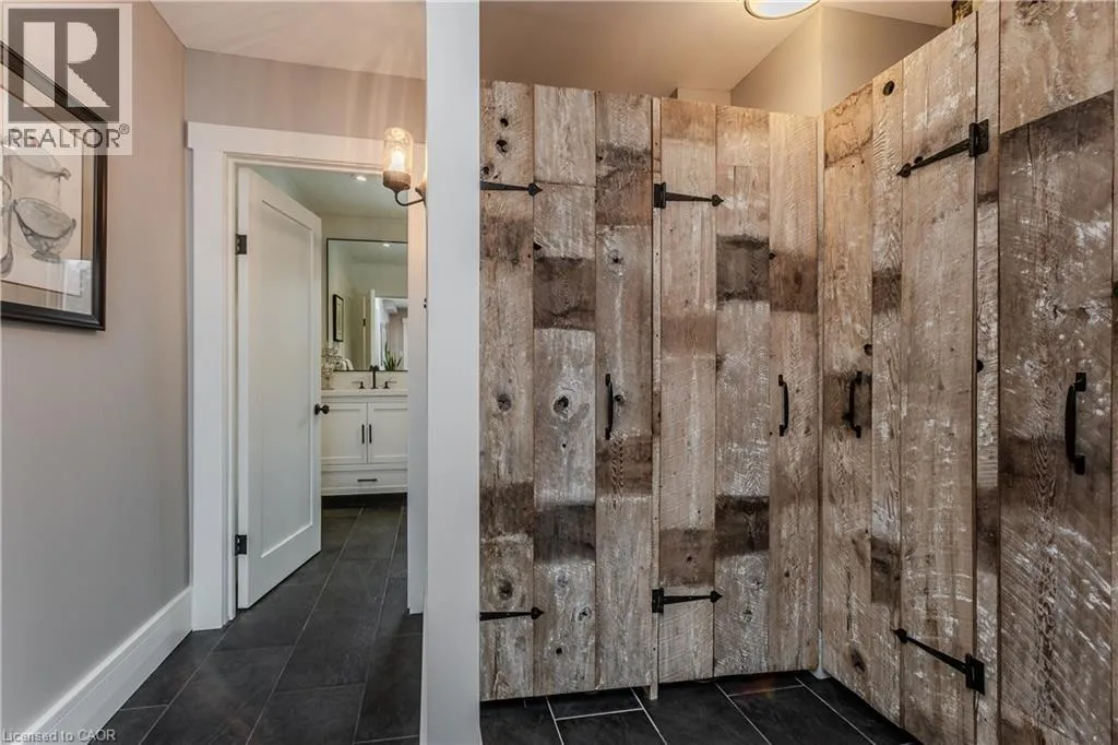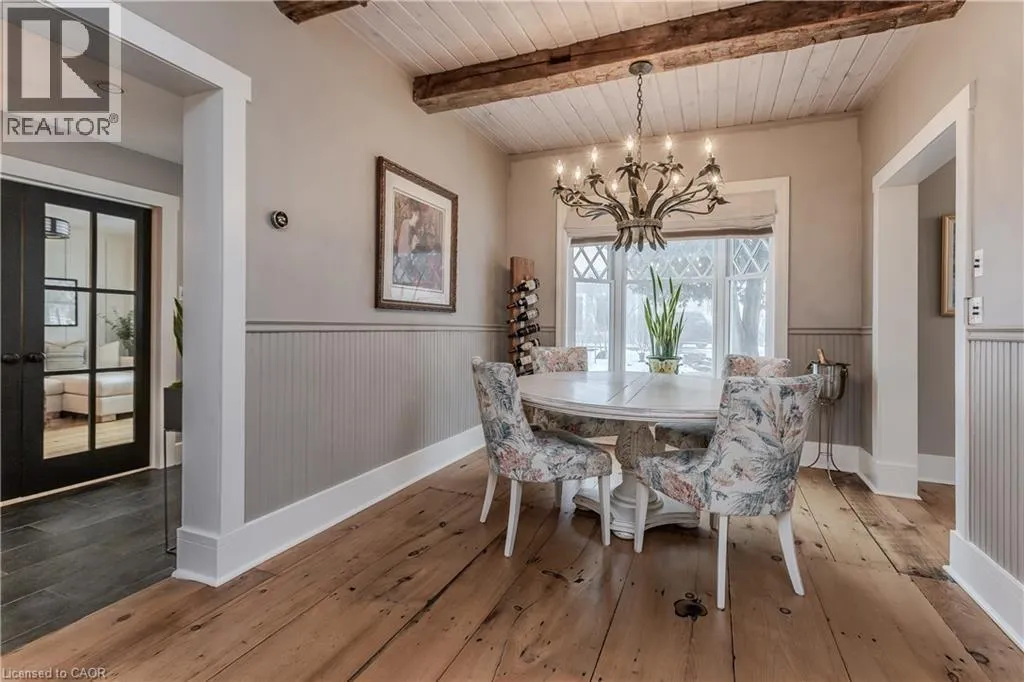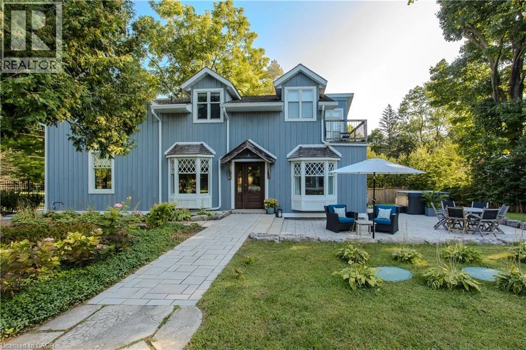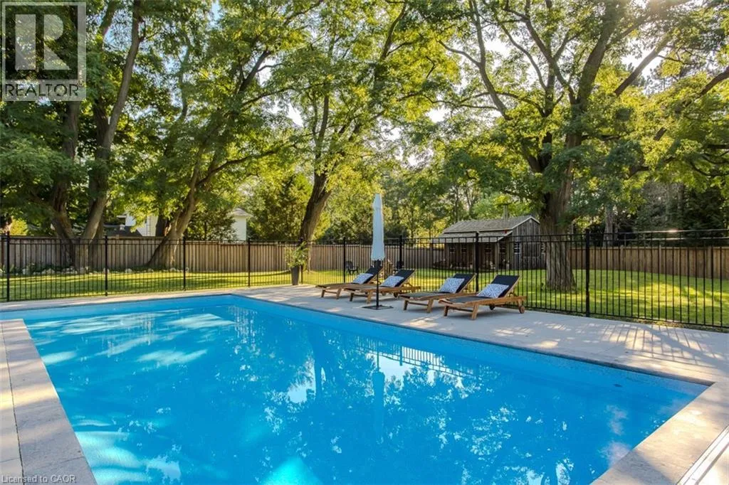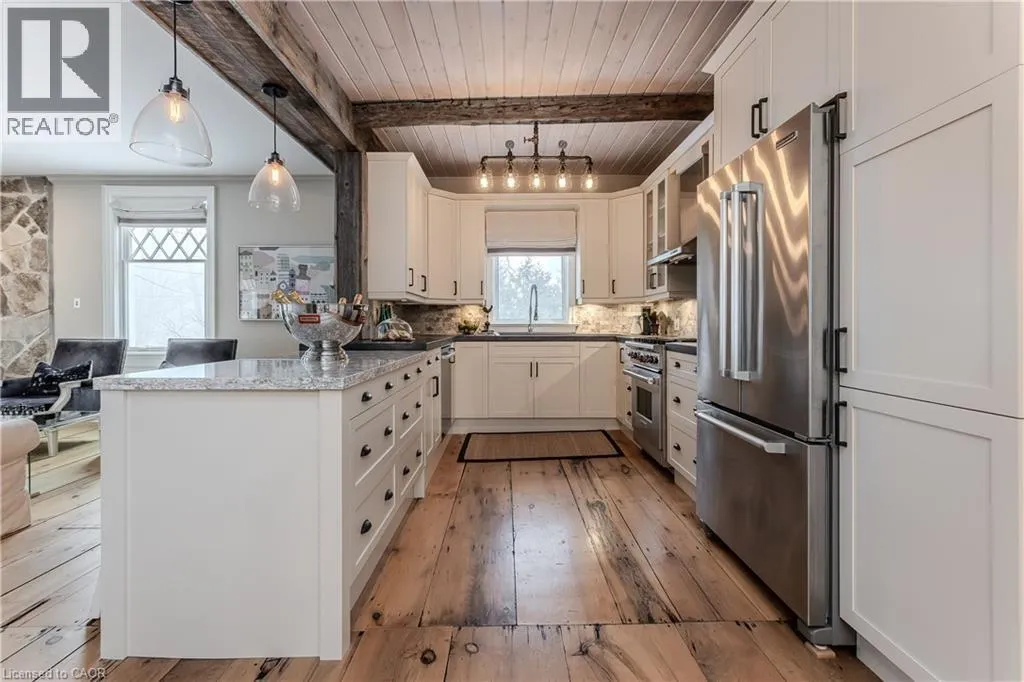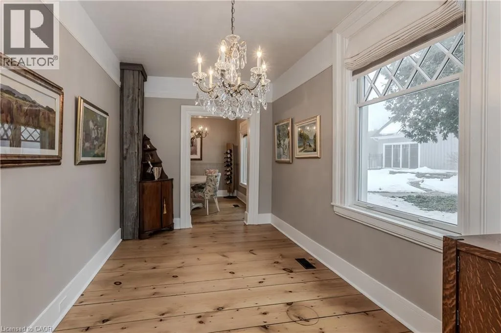 Cedar Springs Rd to McNiven Discover the perfect blend of rural charm and refined luxury on an exceptional property that offers the tranquility of country living while remaining just mins from Burlingtonâs everyday amenities, schools, shopping, and hwys. Set behind automated wrought iron gates is one of the most historic homes in the area originally from 1875. Inside, rustic character meets modern comfort. A welcoming foyer with heated floors sets the tone, while beautiful 1875 wood floors (2020), 8â baseboards, and designer lighting add warmth throughout. The heart of the home is the kitchen featuring concrete countertops, custom cabinetry, SS appliances, wood beam accents, tile backsplash, and a breakfast bar, seamlessly connecting to a bright breakfast area with a bay window. Multiple gathering spaces offer flexibility for living and entertaining, including a family room with stone-surround fireplace, formal dining room, and a living room with wood paneling, French doors, and a bay window. A main-floor bedroom and beautifully renovated 3pc bath with heated floors and glass shower provide ideal space for guests or multigenerational living. Upstairs, the expansive primary retreat impresses with vaulted 12â ceilings, automated blinds, private balcony, and a custom California Closets walk-in. The spa-inspired ensuite features a freestanding tub, and glass walk-in shower. 2 additional spacious bedrooms and a stylish 4pc bath complete the level. The heated garage is a dream entertainment space, and offers polished concrete floors, automated blinds, and an EV charger rough-in. The partially renovated lower level provides excellent storage, laundry with new machines, a workbench, and walkout cellar doors. Outdoors, the fully fenced backyard is a true private retreat with a professionally landscaped stone patio, flagstone pathways, inground pool, hot tub, fire pit, and large shedâperfect for family gatherings, summer entertaining, and peaceful evenings under the stars. (id:27476)