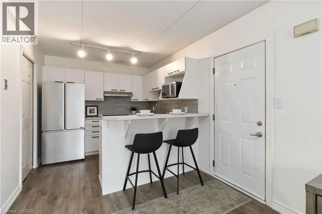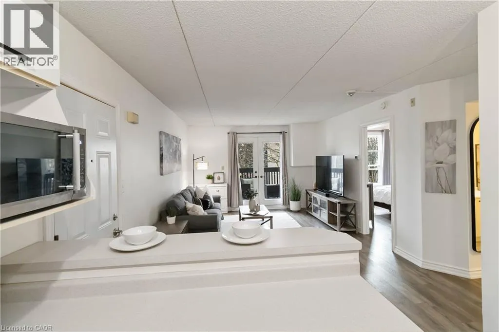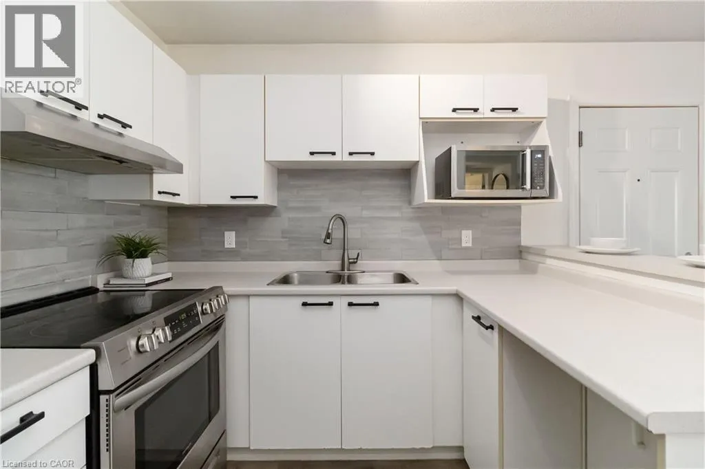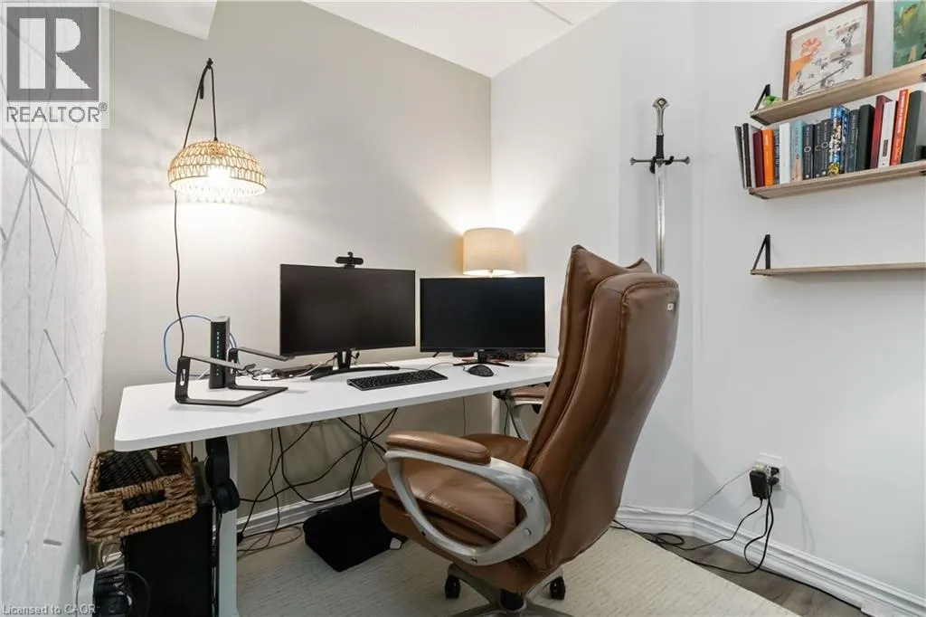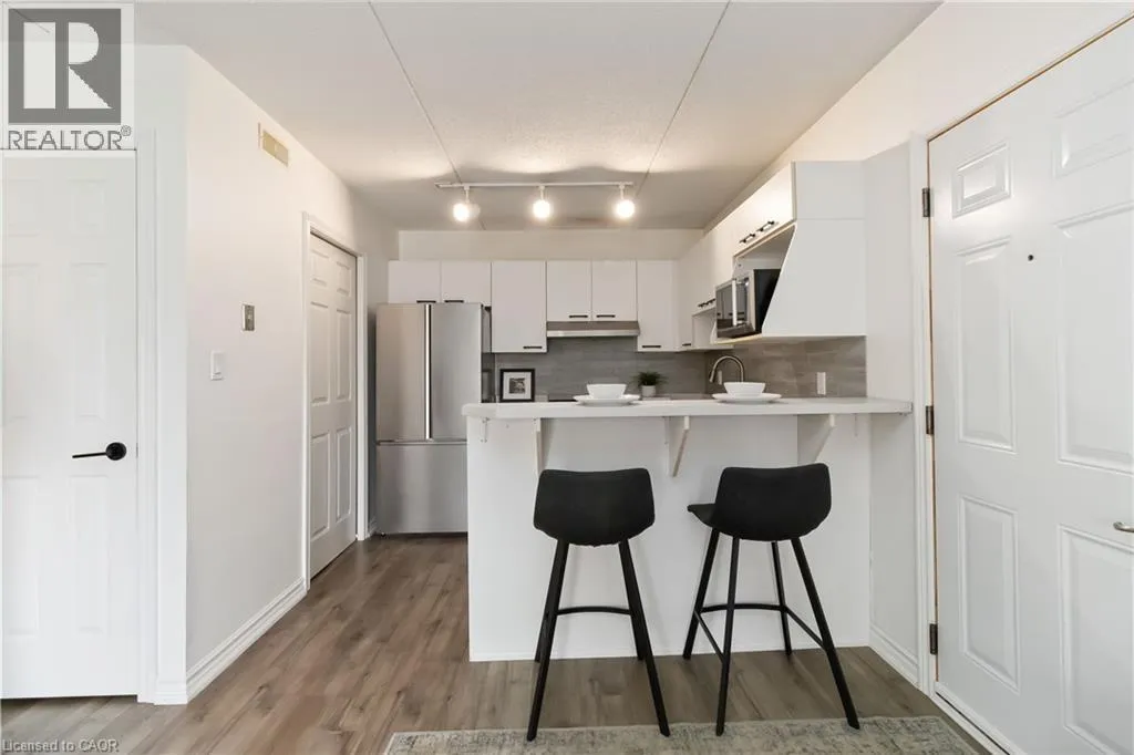 Upper Middle Rd to Cleaver Ave Welcome home to this beautifully appointed open-concept 1 bedroom plus den condo, privately nestled in the sought-after Headon Forest community of Burlington. Surrounded by mature trees and tranquil greenery, this bright and inviting one-bedroom plus den residence offers an exceptional blend of style, comfort, and convenience. Designed with modern living in mind, the spacious open-concept layout creates seamless flow between the kitchen, dining, and living areas ideal for both everyday living and entertaining. The peninsula-style kitchen serves as the heart of the home, offering generous counter space, additional seating, and a natural gathering place for casual meals or hosting guests. The sun-filled living area extends to a private covered balcony, providing a peaceful outdoor retreat to enjoy your morning coffee or unwind at the end of the day. The well-proportioned primary bedroom is complemented by a versatile den, perfect for a home office, guest space, or reading nook. A four-piece bath and convenient in-suite laundry enhance everyday functionality. Ideally located close to shopping, restaurants, parks, and everyday amenities, this residence offers refined condo living in one of Burlingtonâs most desirable neighbourhoods. (id:27476)