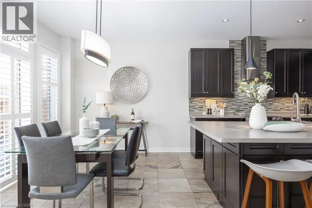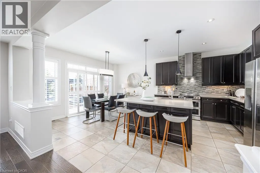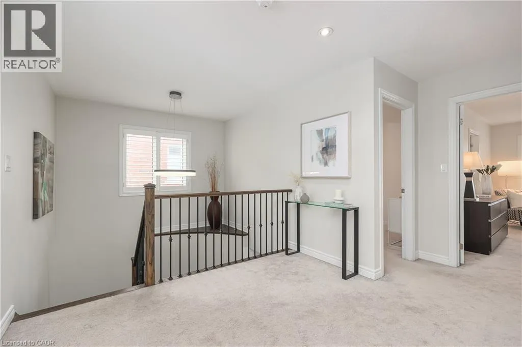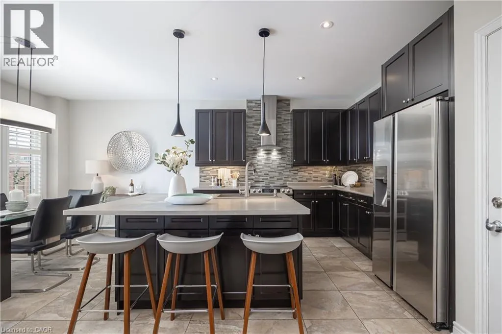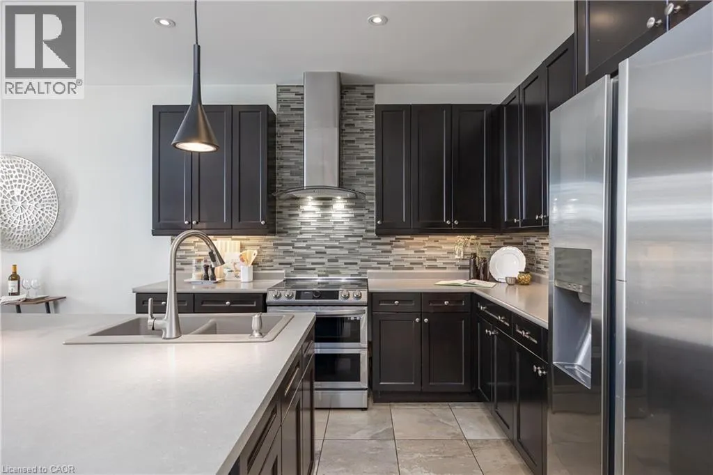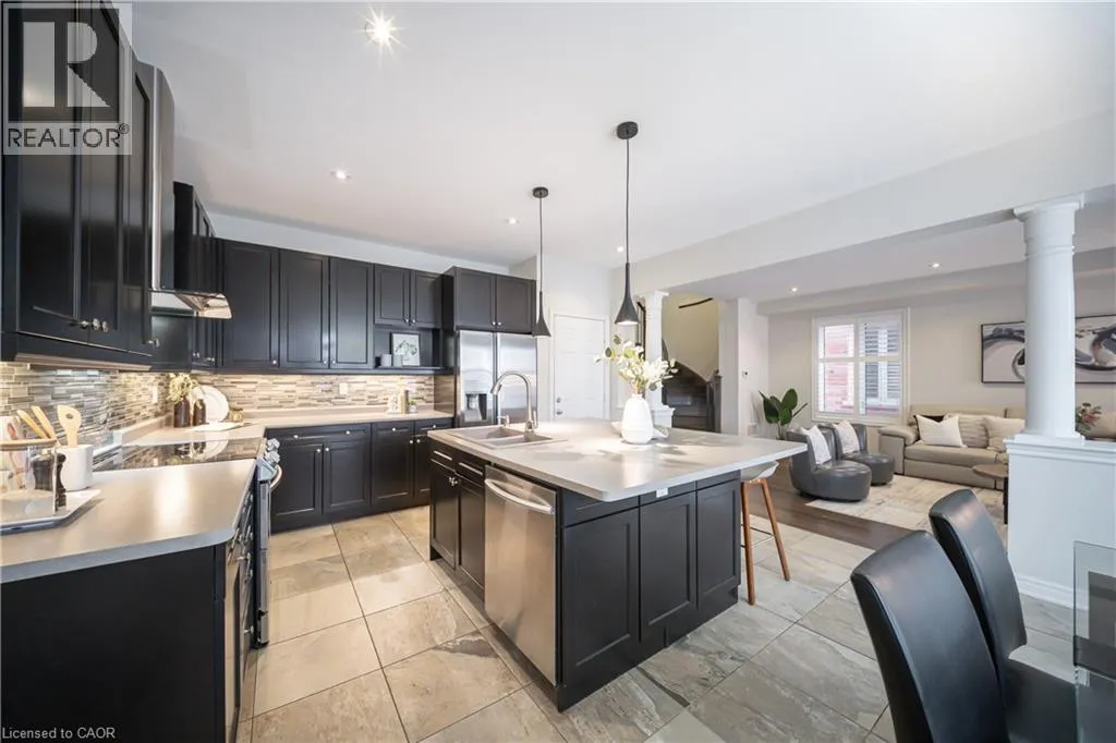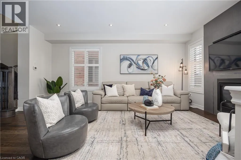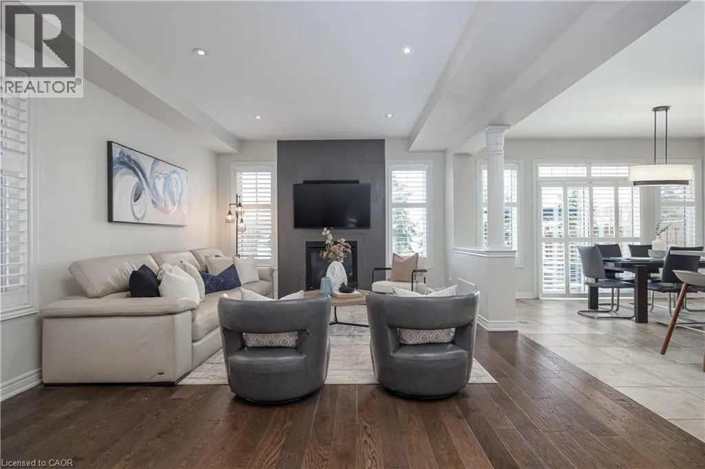 Thomas Alton and Appleby Ln Nestled on a quiet and private street in sought-after Alton Village, this beautiful Fernbrook built home showcases the âCornerstoneâ model, offering a beautifully designed layout that seamlessly blends comfort, style, and functionality. A double-door entry welcomes you into the open-concept main level, where 9-foot ceilings, hand-scraped hardwood flooring, pot lighting, and a gas fireplace with a custom feature wall that creates a warm and sophisticated ambience. The oak staircase with wrought-iron spindles adds an architectural element to the space. At the heart of the home is the chef-inspired kitchen, thoughtfully designed for both everyday living and entertaining. It features stainless steel appliances, upgraded cabinetry with ample storage, under-cabinet lighting, a stylish glass tile backsplash, and an impressive 5 ft x 6 ft oversized islandâperfect for gathering with family and friends. The second level offers three spacious bedrooms and a bright, expansive family room that can easily be converted into a fourth bedroom if desired. The primary suite complete with a walk-in closet and a 5-piece ensuite featuring a glass shower and a relaxing soaker tub. Two additional generously sized bedrooms share a 4-piece bath, while the convenient upper-level laundry room adds everyday practicality. The basement features a 3-piece rough-in, cold room, and approximately 985 sq. ft. of additional space ready to be customized to suit your lifestyle. Step outside to your private, fully fenced backyard featuring a pergola and hot tub, backing directly onto a school and green spaceâproviding both privacy and a serene setting for outdoor relaxation and entertaining. Perfectly located close to Burlingtonâs top-rated schools, parks, shopping, and amenities, this exceptional home offers the ideal blend of comfort and functionality. A must-see opportunity in one of Burlingtonâs most desirable communities. (id:27476)