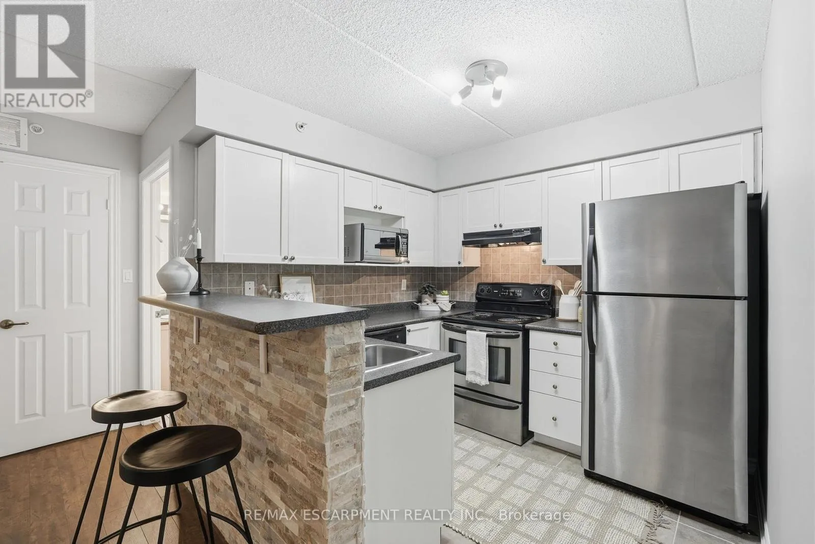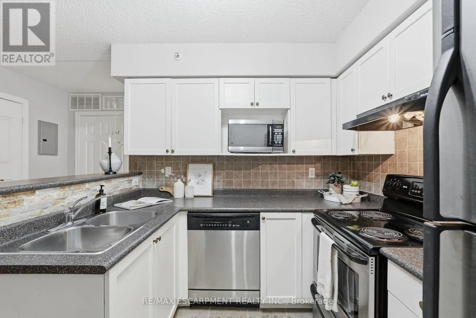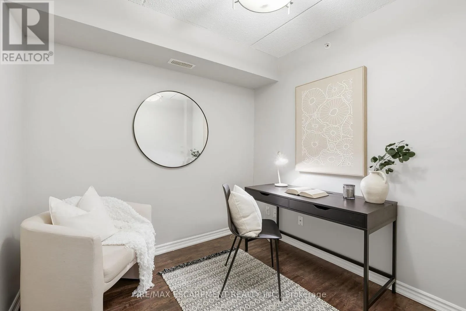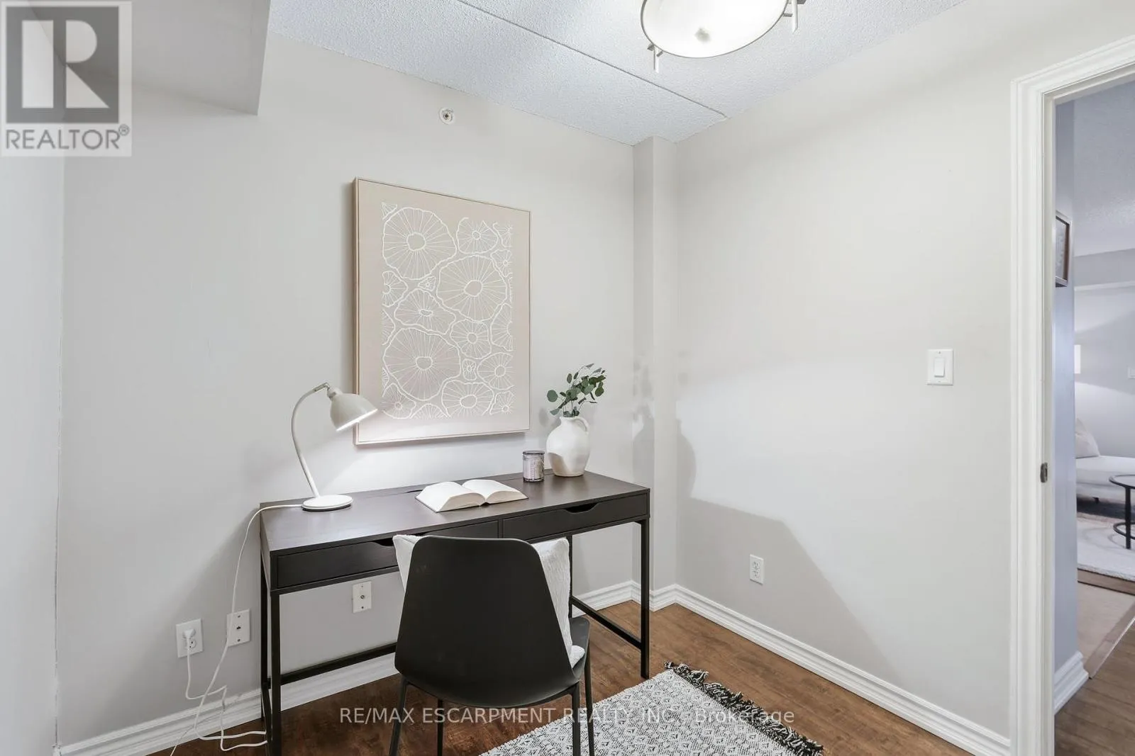 Cross Streets: Appleby Line/Upper Middle Road. ** Directions: North East corner of Upper Middle and Appleby Line. Stylish, low-maintenance living in the heart of Burlington! This modern 1 bedroom plus den, 1 bathroom unit is the perfect fit for young professionals looking to own their first home or retirees seeking comfort, convenience, and lifestyle. Located just minutes from the QEW and Hwy 407, commuting is a breeze while being steps to restaurants, cafes, and all the shopping you need means keeping your time spent in the car to a minimum. Bright kitchen cabinetry and sleek laminate flooring throughout the main living space make this space fresh and move in ready. The spacious den provides an ideal work from home space or hobby room. Other conveniences include in-suite laundry, 1 underground parking space, and 1 locker for extra storage. Plus an additional bonus storage room can be found on the balcony for added convenience. Plenty of visitor parking means friends and family can drop by anytime. Residents also enjoy access to a fitness centre and party room, ideal for socializing or staying active without ever leaving home. Whether you're working downtown, hybrid, or remote, this is a smart move in a fantastic location! Don't miss this opportunity to simplify your life without sacrificing style, comfort, or location! (id:27476)