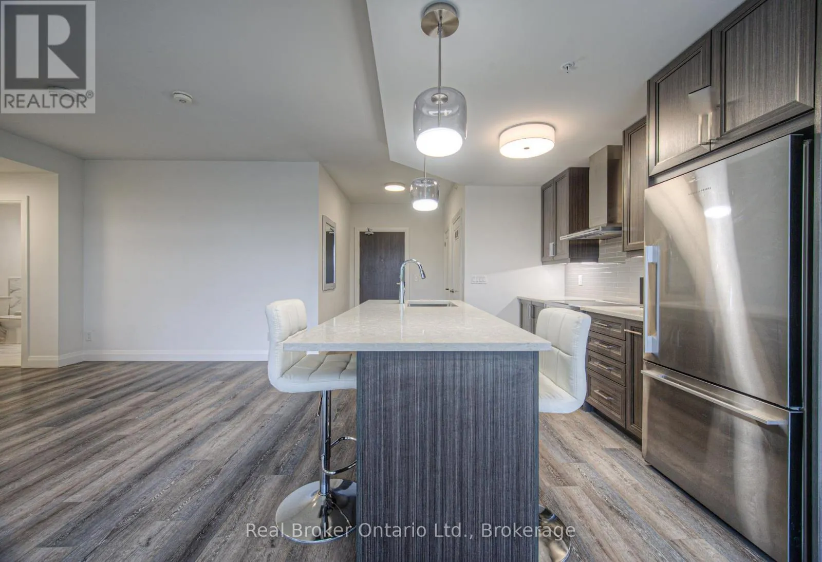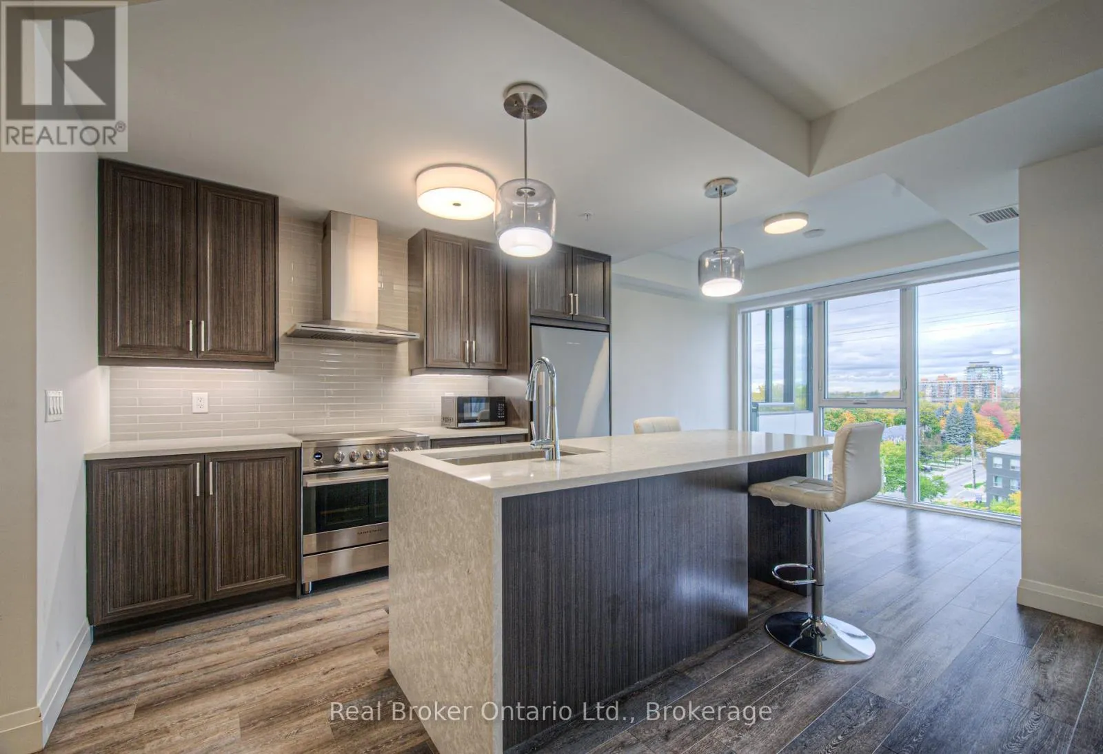 South West corner of Brock Avenue & Ontario Street, one block east of Maple Avenue. Experience modern urban living in this 1 Bedroom + Den "Brilliance Model" suite at Illumina Condos, offering 850 sq. ft. of bright, open-concept space. Floor-to-ceiling windows flood the home with natural light, highlighting a designer kitchen equipped with premium Fisher & Paykel appliances, a quartz waterfall island, and abundant cabinetry and counter space. The versatile den is perfect for a home office or dining area. The spacious primary bedroom features a custom built-in closet and direct access to a 4-piece bathroom. Enjoy the convenience of underground parking and a private locker, along with premium building amenities including 24-hour concierge and security, a state-of-the-art fitness centre, bike storage, BBQ area, and a stylish party room. The 22nd-floor party room with rooftop terrace offers stunning lake views, ideal for entertaining or relaxing. Located just steps from the lake, shops, cafés, restaurants, the Art Gallery of Burlington, and the Performing Arts Centre, with a pharmacy and medical clinic at the building's base and quick access to the GO Station and highways, this suite delivers the perfect combination of comfort, style, and convenience. (id:27476)