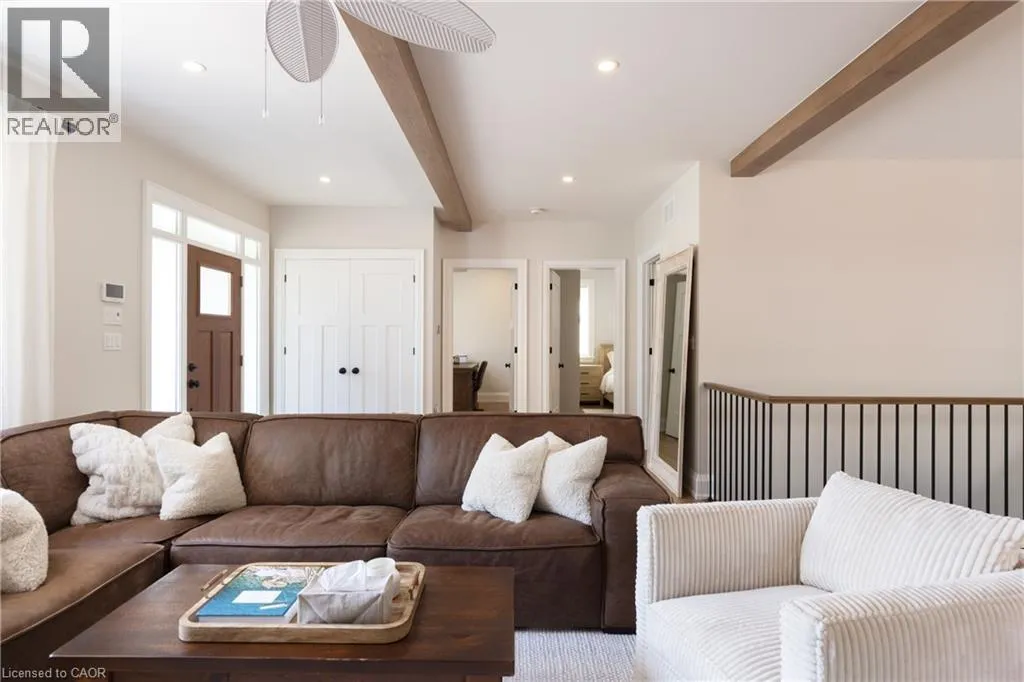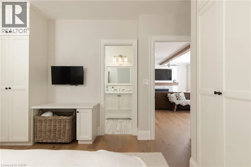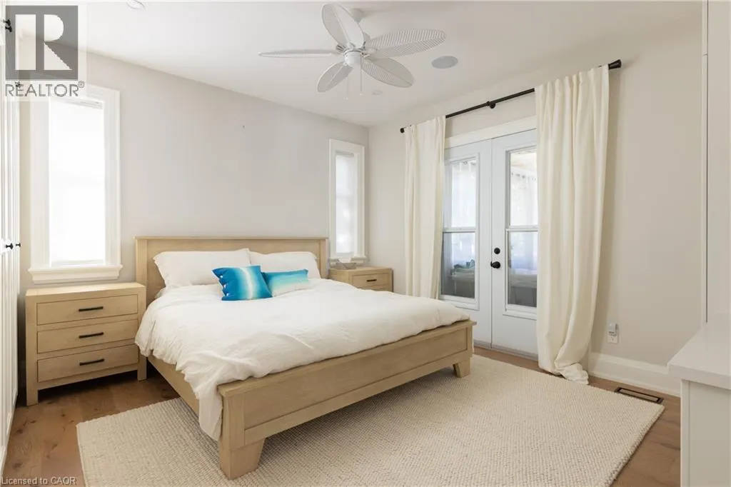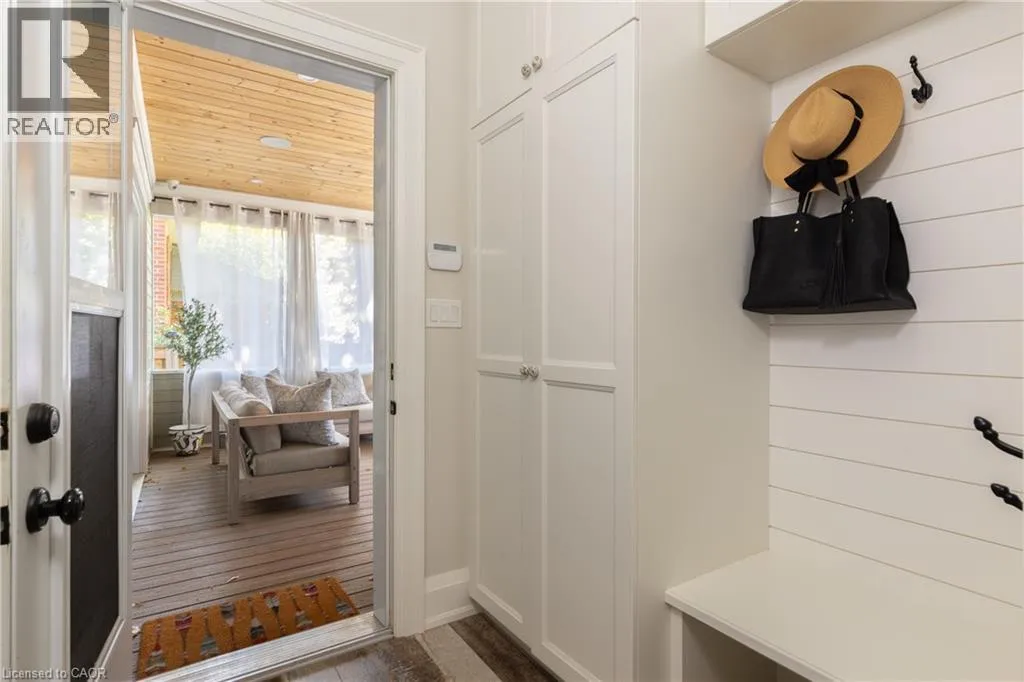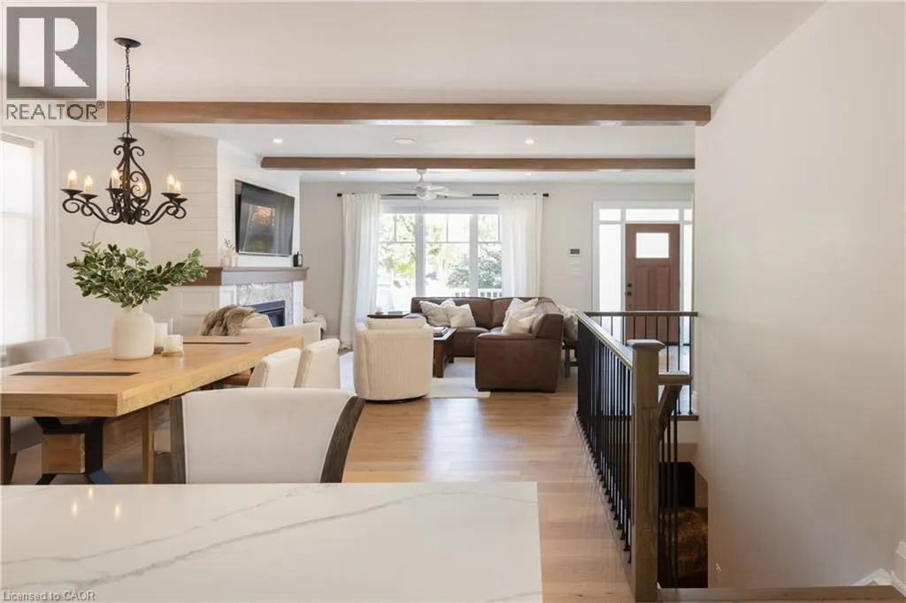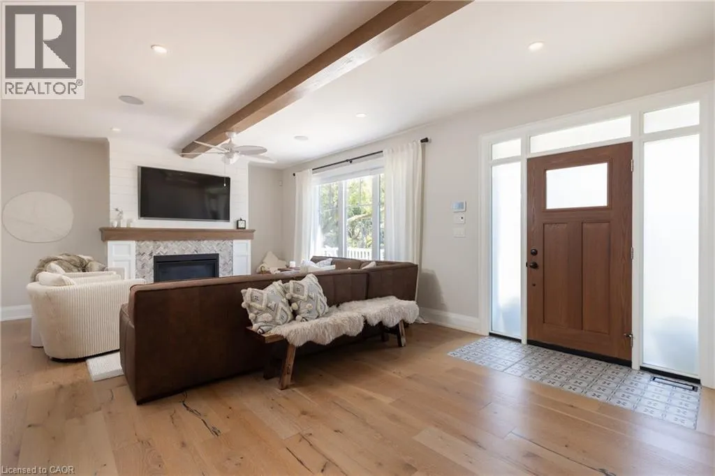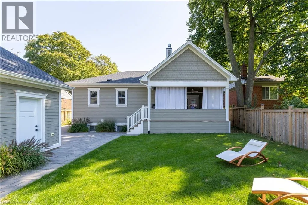 Drury Lane to Courtland Drive CUSTOM RENOVATION BUNGALOW. This exceptional residence is the perfect blend of modern luxury, thoughtful design, and everyday comfort. The open-concept main floor is bathed in natural light, showcasing high ceilings, wide-plank hardwood floors, and refined designer finishes throughout. The Great Room focal point is the gas fireplace and detailed surround open to the dining room area for easy entertaining. The chefâs kitchen is a true showpiece, featuring quartz countertops, a 6-burner gas range, premium stainless-steel appliances, and a cleverly concealed walk-in pantry â a seamless balance of beauty and function. The primary suite is a private retreat with a custom PAX closet system and a spainspired 3-piece semi-ensuite complete with a glass shower and heated floors. A second bedroom can also be used as a main floor office. From either the primary bedroom or the mudroom, step outside to a 400 sq. ft. covered porch where a fireplace and built-in TV space create a 3 season indoor-outdoor haven. The lower level offers an expansive extension of living space with a welcoming family/games room, a 4-piece bathroom, gym area, laundry room, and two additional bedrooms â perfect for guests, hobbies, or a growing family. Outdoors, the fully fenced and landscaped backyard sets the stage for effortless entertaining and relaxation. Additional highlights include 9 ft. ceilings, hardwood flooring throughout, a heated detached double-car garage with easy access to attic storage, and a whole-home integrated security system with cameras and sound system. Every detail has been carefully curated in this exquisitely designed home, offering a move-in-ready lifestyle with upgrades too numerous to list. This is a property youâll want to experience firsthand. Located a short stroll to shops and restaurants of downtown Burlington and close proximity to highway access. (id:27476)