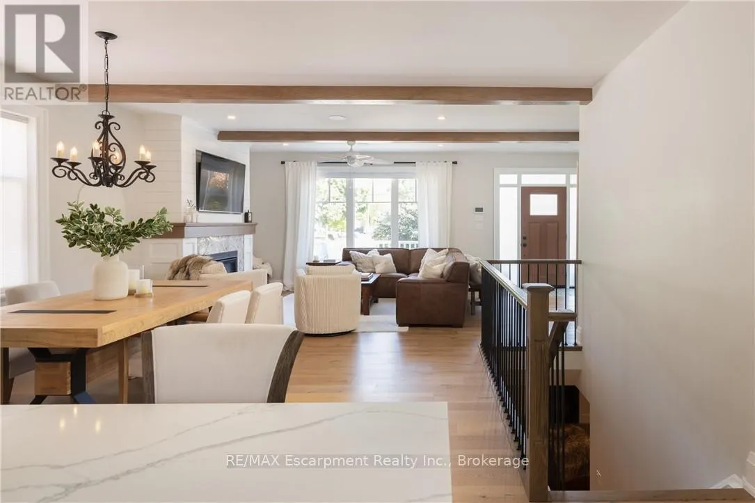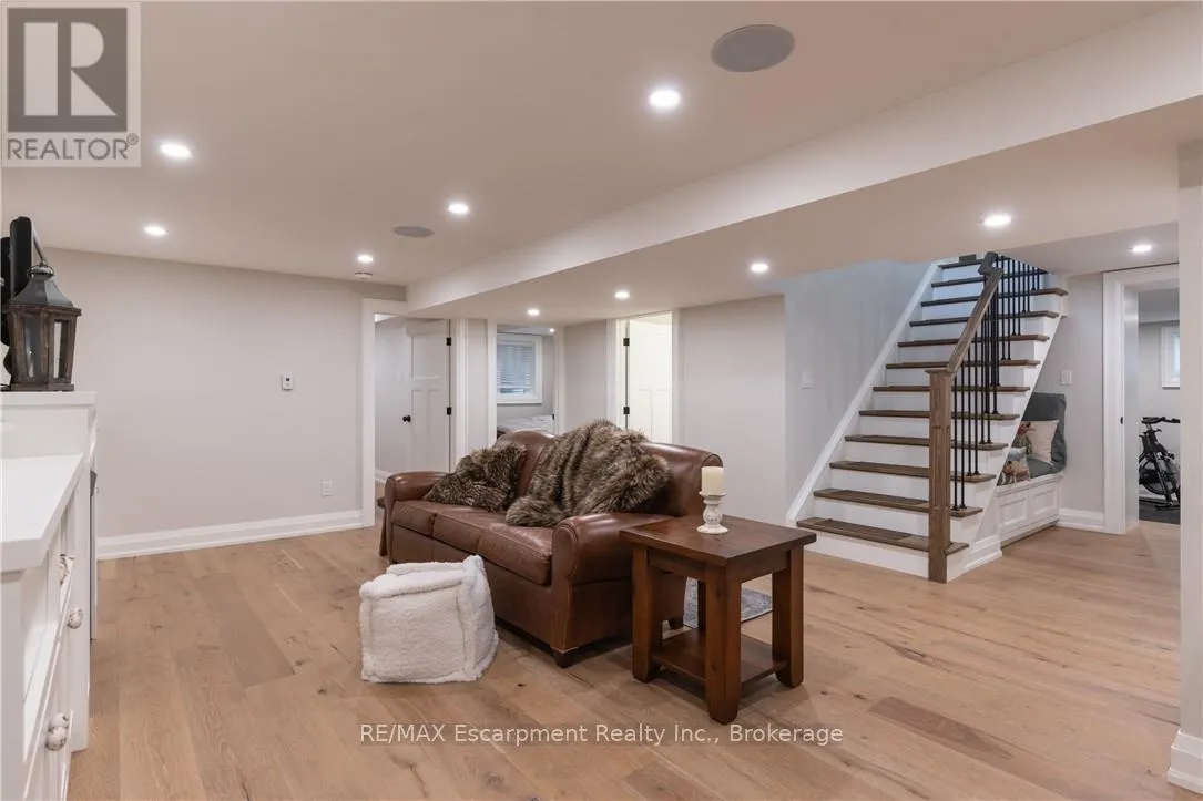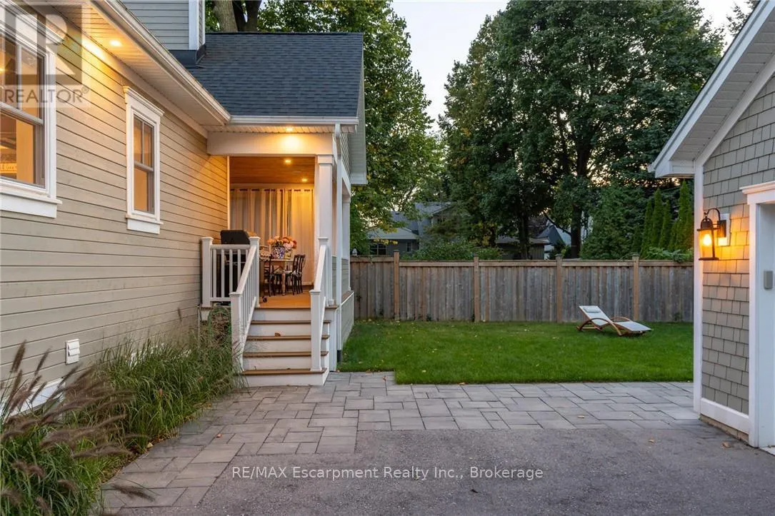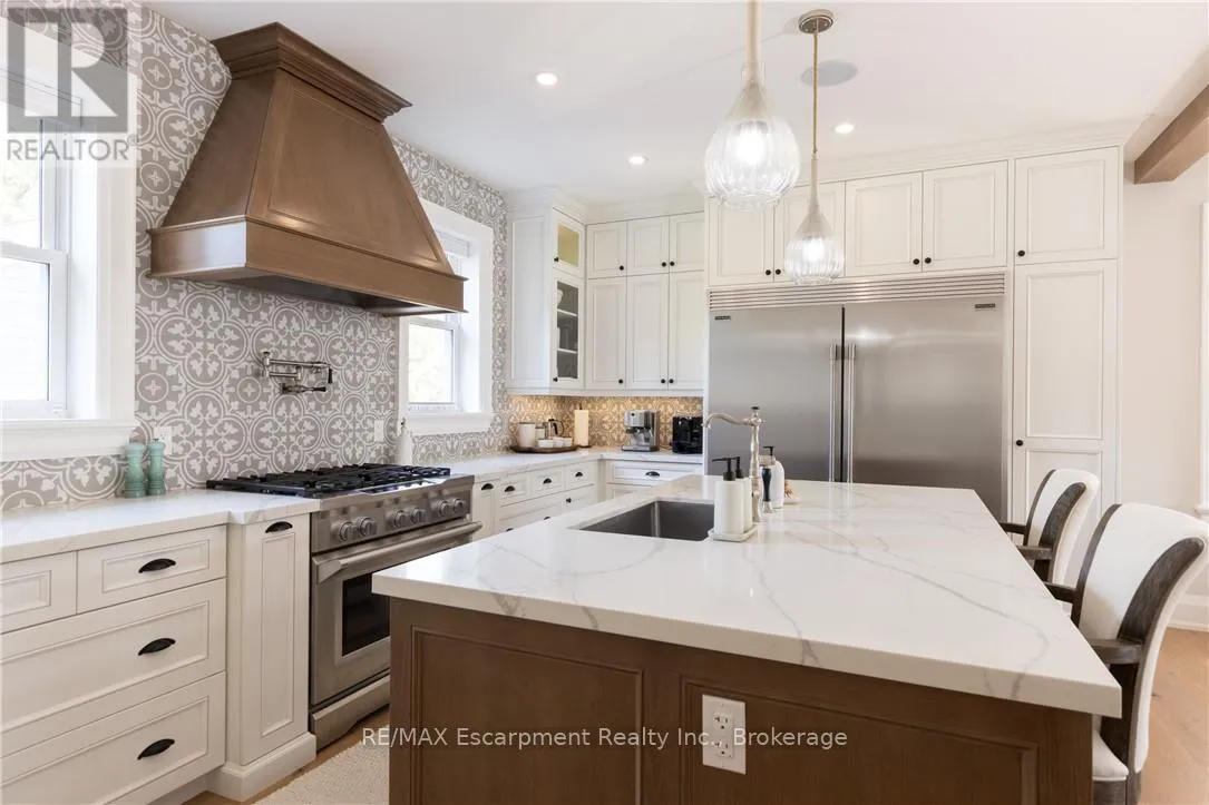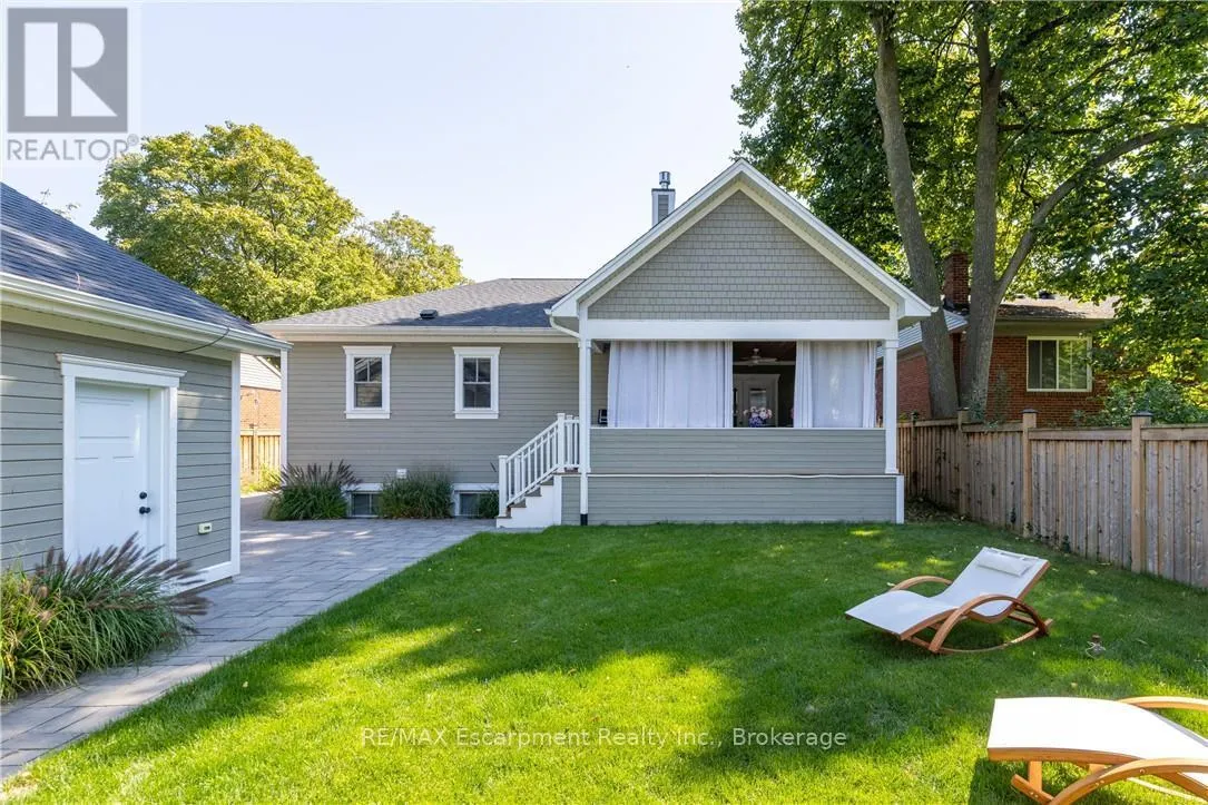 Cross Streets: DRURY LANE & COURTLAND DR. ** Directions: Drury Lane to Courtland Dr. CUSTOM RENOVATION BUNGALOW. This exceptional residence is the perfect blend of modern luxury, thoughtful design, and everyday comfort. The open-concept main floor is bathed in natural light, showcasing high ceilings, wide-plank hardwood floors, and refined designer finishes throughout. The Great Room focal point is the gas fireplace and detailed surround open to the dining room area for easy entertaining. The chef's kitchen is a true showpiece, featuring quartz countertops, a 6-burner gas range, premium stainless-steel appliances, and a cleverly concealed walk-in pantry - a seamless balance of beauty and function. The primary suite is a private retreat with a custom PAX closet system and a spainspired 3-piece semi-ensuite complete with a glass shower and heated floors. A second bedroom can also be used as a main floor office. From either the primary bedroom or the mudroom, step outside to a 400 sq. ft. covered porch where a fireplace and built-in TV space create a 3 season indoor-outdoor haven. The lower level offers an expansive extension of living space with a welcoming family/games room, a 4-piece bathroom, gym area, laundry room, and two additional bedrooms - perfect for guests, hobbies, or a growing family. Outdoors, the fully fenced and landscaped backyard sets the stage for effortless entertaining and relaxation. Additional highlights include 9 ft. ceilings, hardwood flooring throughout, a heated detached double-car garage with easy access to attic storage, and a whole-home integrated security system with cameras and sound system. Every detail has been carefully curated in this exquisitely designed home, offering a move-in-ready lifestyle with upgrades too numerous to list. This is a property you'll want to experience firsthand. Located a short stroll to shops and restaurants of downtown Burlington and close proximity to highway access. (id:27476)