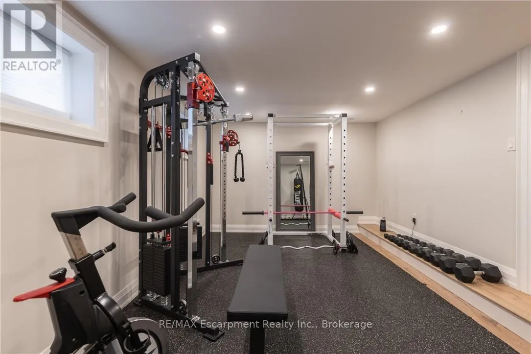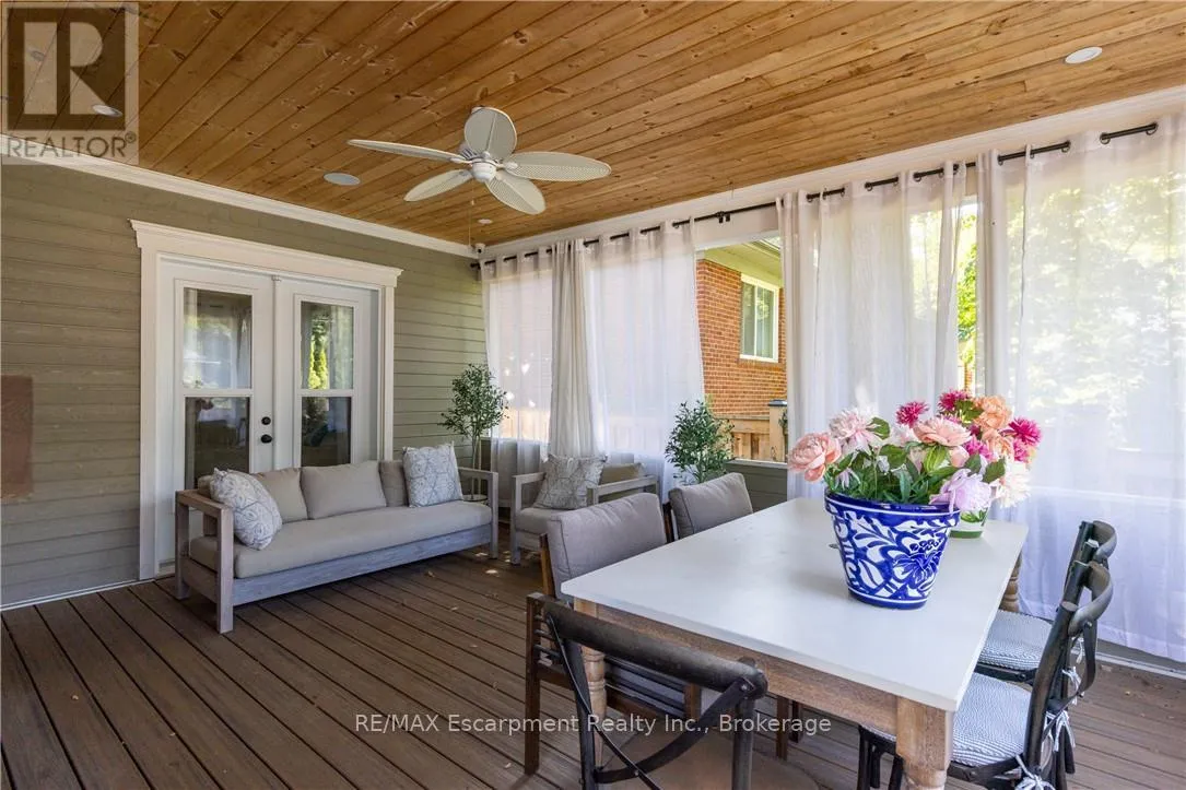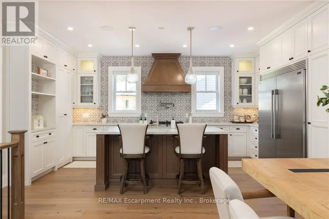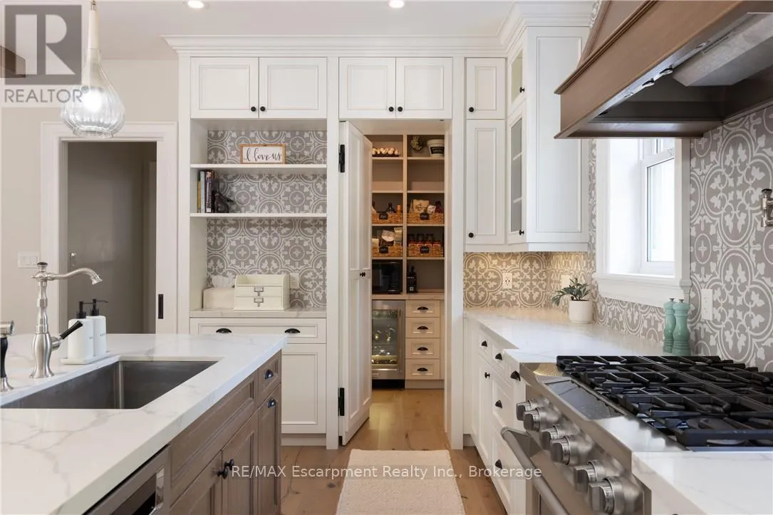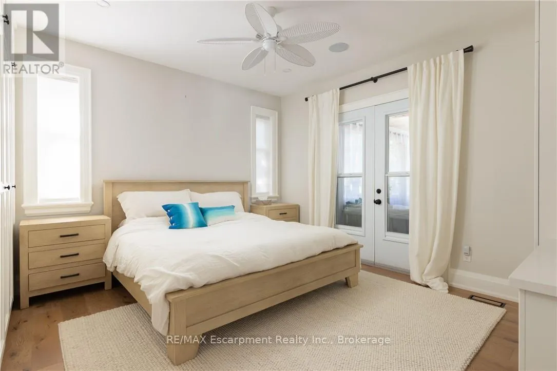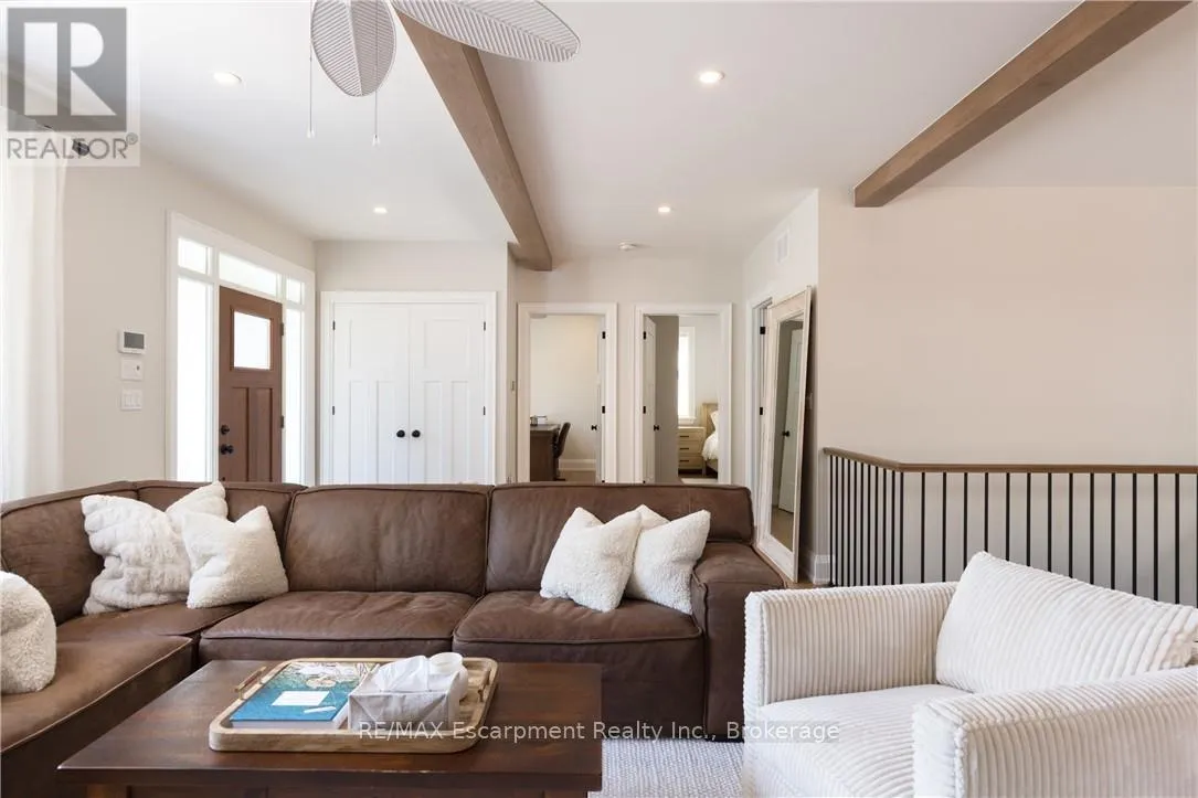Cross Streets: DRURY LANE & COURTLAND DR. ** Directions: Drury Lane to Courtland Dr. CUSTOM RENOVATION BUNGALOW. This exceptional residence is the perfect blend of modern luxury, thoughtful design, and everyday comfort. The open-concept main floor is bathed in natural light, showcasing high ceilings, wide-plank hardwood floors, and refined designer finishes throughout. The Great Room focal point is the gas fireplace and detailed surround open to the dining room area for easy entertaining. The chef's kitchen is a true showpiece, featuring quartz countertops, a 6-burner gas range, premium stainless-steel appliances, and a cleverly concealed walk-in pantry - a seamless balance of beauty and function. The primary suite is a private retreat with a custom PAX closet system and a spainspired 3-piece semi-ensuite complete with a glass shower and heated floors. A second bedroom can also be used as a main floor office. From either the primary bedroom or the mudroom, step outside to a 400 sq. ft. covered porch where a fireplace and built-in TV space create a 3 season indoor-outdoor haven. The lower level offers an expansive extension of living space with a welcoming family/games room, a 4-piece bathroom, gym area, laundry room, and two additional bedrooms - perfect for guests, hobbies, or a growing family. Outdoors, the fully fenced and landscaped backyard sets the stage for effortless entertaining and relaxation. Additional highlights include 9 ft. ceilings, hardwood flooring throughout, a heated detached double-car garage with easy access to attic storage, and a whole-home integrated security system with cameras and sound system. Every detail has been carefully curated in this exquisitely designed home, offering a move-in-ready lifestyle with upgrades too numerous to list. This is a property you'll want to experience firsthand. Located a short stroll to shops and restaurants of downtown Burlington and close proximity to highway access. (id:27476)