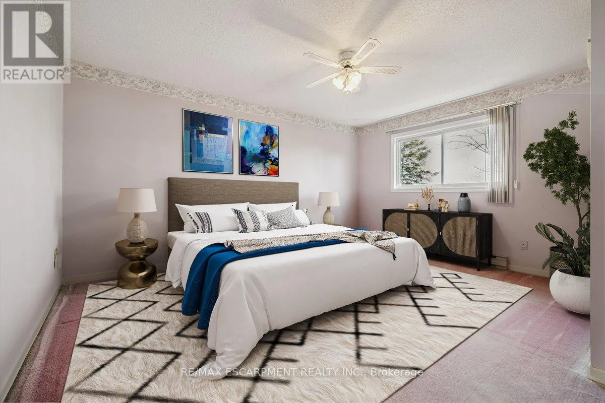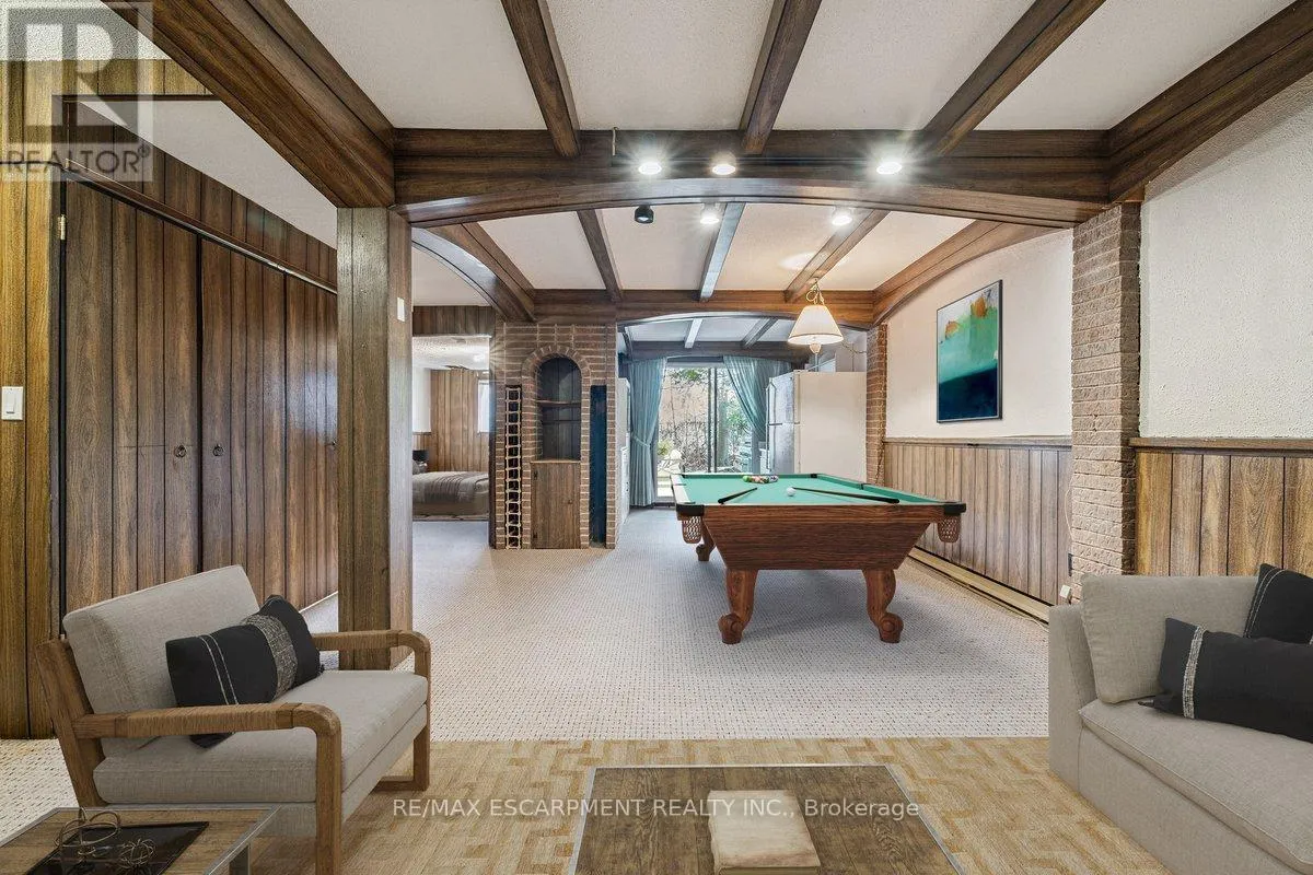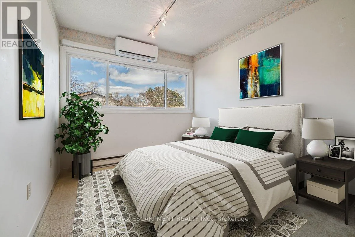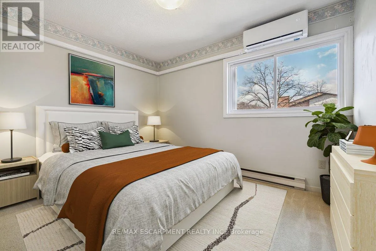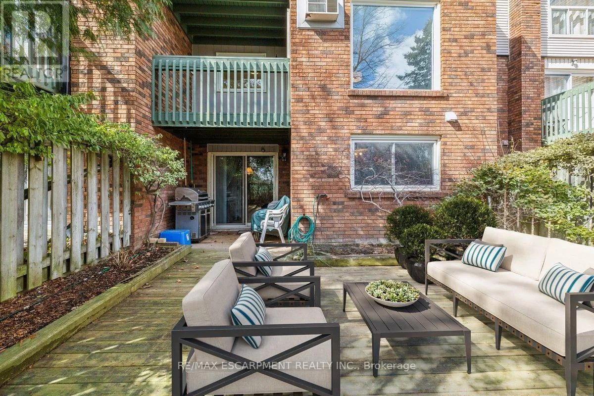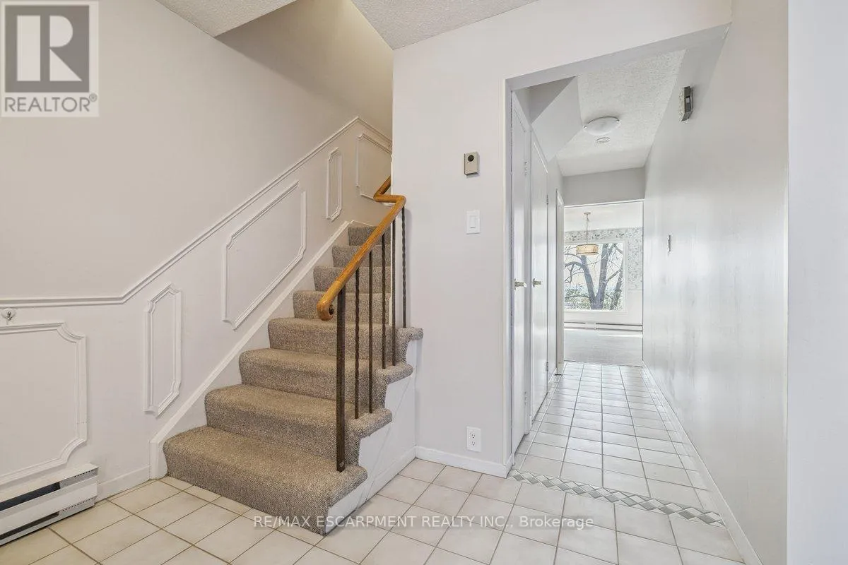 Cross Streets: Kerns Rd / N. Service Rd. ** Directions: N. Service Rd to Kerns Rd, Kerns Rd to \"Tyandaga Mews\" Townhome Complex. Welcome to beautiful Tyandaga, and the sought after Tyandaga Mews townhome complex. This well featured 1,566sf spacious home offers tremendous value, and is perfect for first time buyers, empty nesters, or anyone seeking to enjoy a low maintenance lifestyle. Boasting a brand new (Feb 2026) energy efficient heat pump, providing central heating and cooling for the main floor and upstairs bedrooms, with supplementary baseboard and fireplace heating if needed. Dine in the newly decorated dining room, where an abundance of natural light streams in through the extra large window. The large freshly painted living room with cozy fireplace is perfect for entertaining. For outdoor relaxation, there is great choice, with one balcony off of the Primary Bedroom, another balcony off of the dining room, and in the finished basement, a walk out to a welcoming patio, all overlooking the natural beauty of the well treed grounds. During those hot summer days, enjoy the outdoor pool centrally located within the complex. Great shopping and dining, community parks, and Tyandaga Golf Course are all within a five minute commute. Easy access to QEW, 403 and 407 highways. Easy visitor parking on the street. Condo fees include lawn care, snow clearing and repairs to major exterior components of the home. (id:27476)