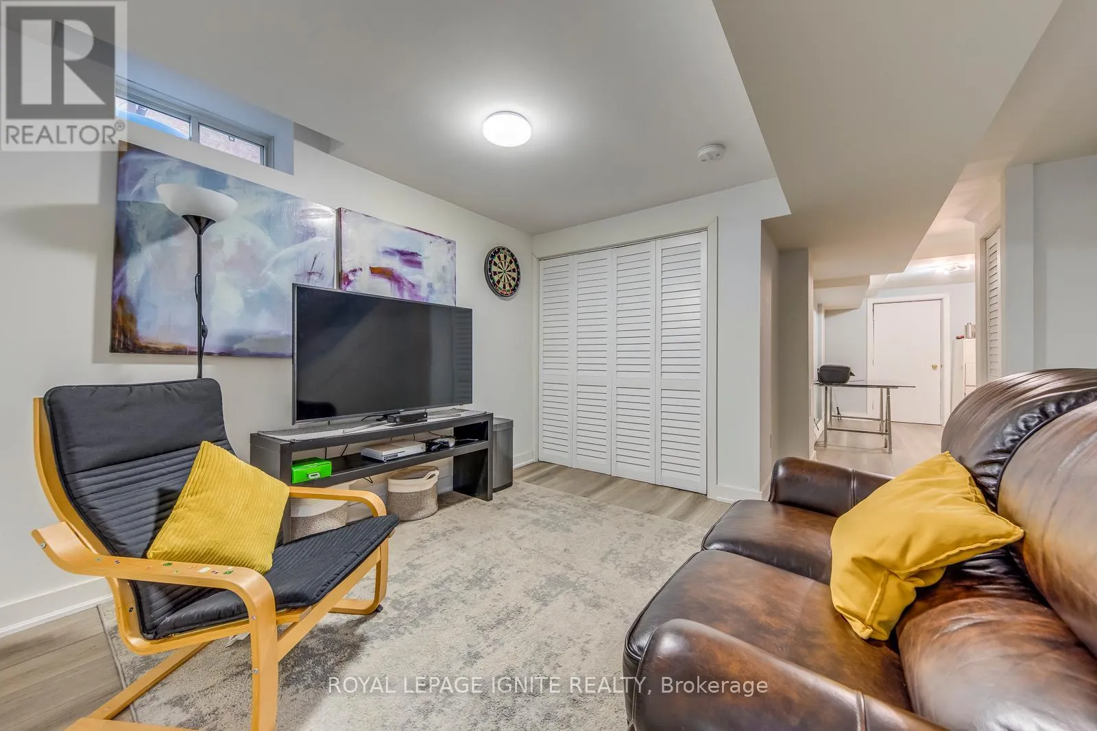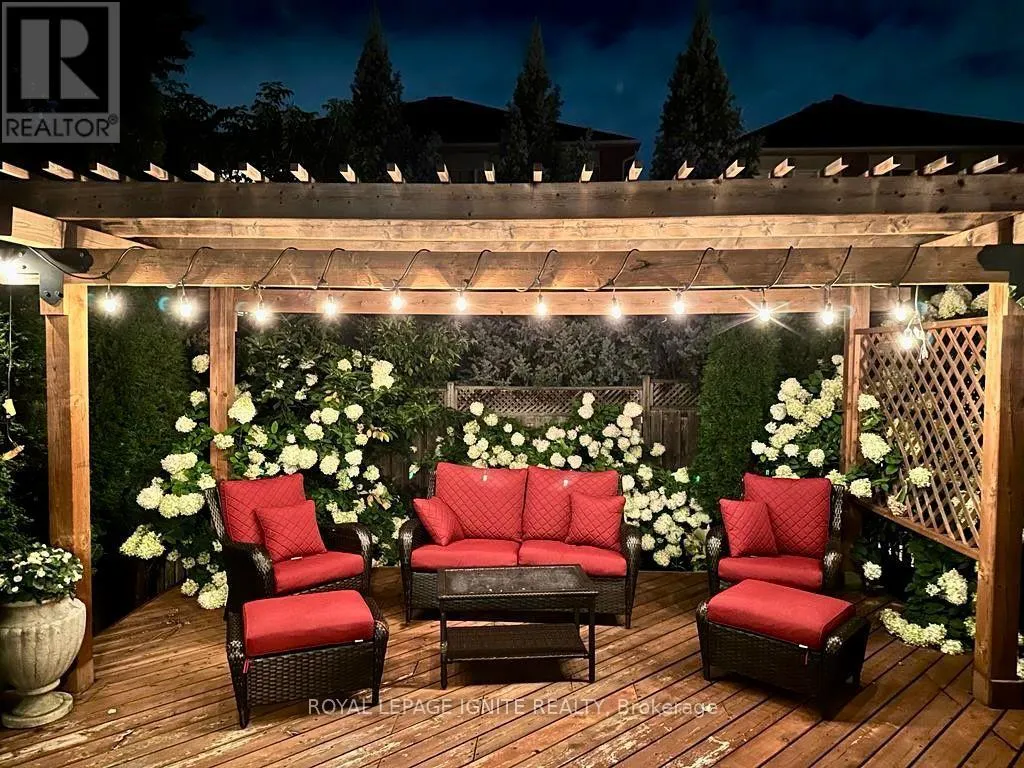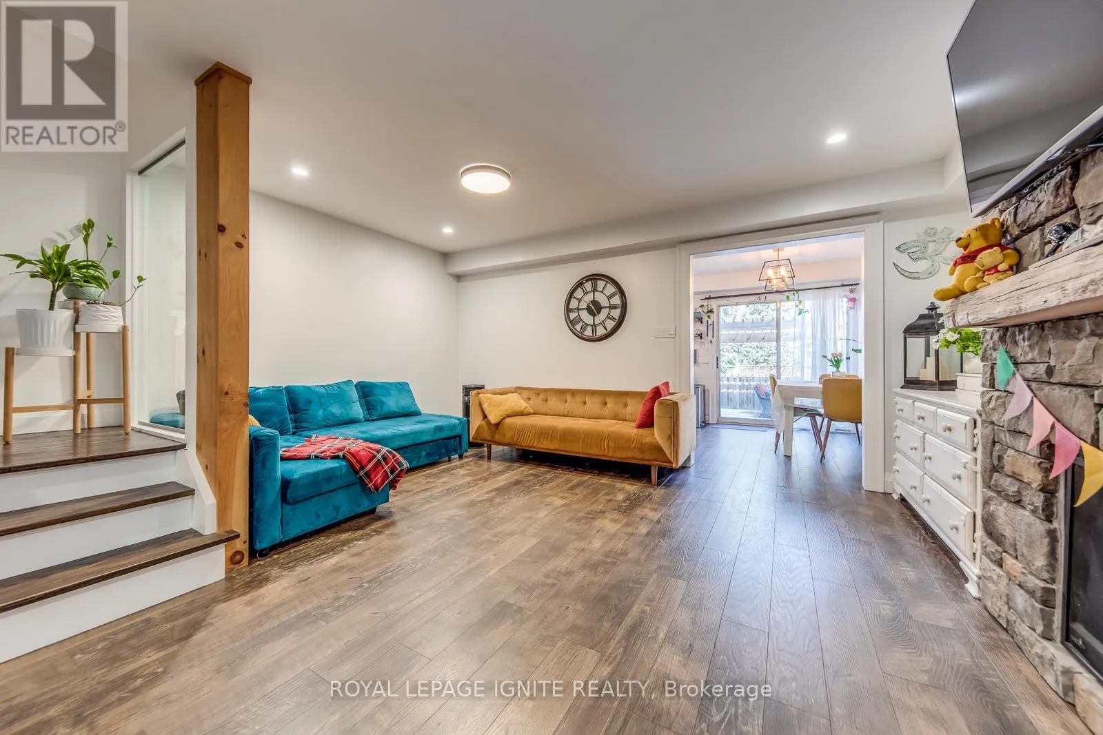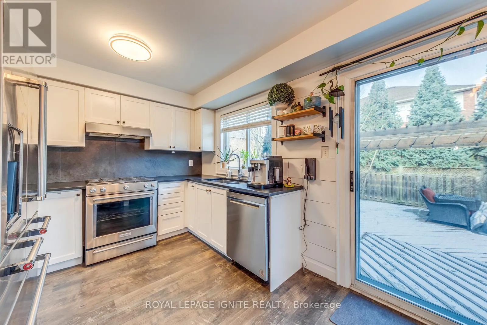 Qew South & Burloak Beautiful, well-maintained and upgraded townhouse, linked only by the garage with convenient door access to both the home and backyard. Features a bright and inviting living/dining area with a real stone gas fireplace. Modern kitchen with a large eat-in area, granite countertops, slate backsplash, stainless steel appliances, and walk-out to a wood deck. Wood staircase with iron pickets leads to the second floor with 3 spacious bedrooms, including a primary bedroom with a 4-piece ensuite, while the second and third bedrooms are also generously sized. Finished basement. Freshly painted and very well maintained.( Included: Built-in dining table and cabinet, TV in the living area, cabinetry in the storage area and basement Rec/playroom, patio maintenance tools, BBQ propane tank, two iron backyard chairs, plant pots and stands).. Enjoy a private, fully landscaped backyard with Arborvitae, white hydrangeas, and lilies-perfect for relaxing or entertaining. Great location within minutes to Fortinos, Longos, the Outlet Mall, and the upcoming Costco. Close to Food Basics, Shoppers Drug Mart, local shops, Cineplex, restaurants, cafes, beaches, and scenic trails. Near a community centre, parks, and just 7 minutes to Appleby GO. Located in a safe and quiet neighborhood with friendly neighbor's-perfect for comfortable family living. (id:27476)
