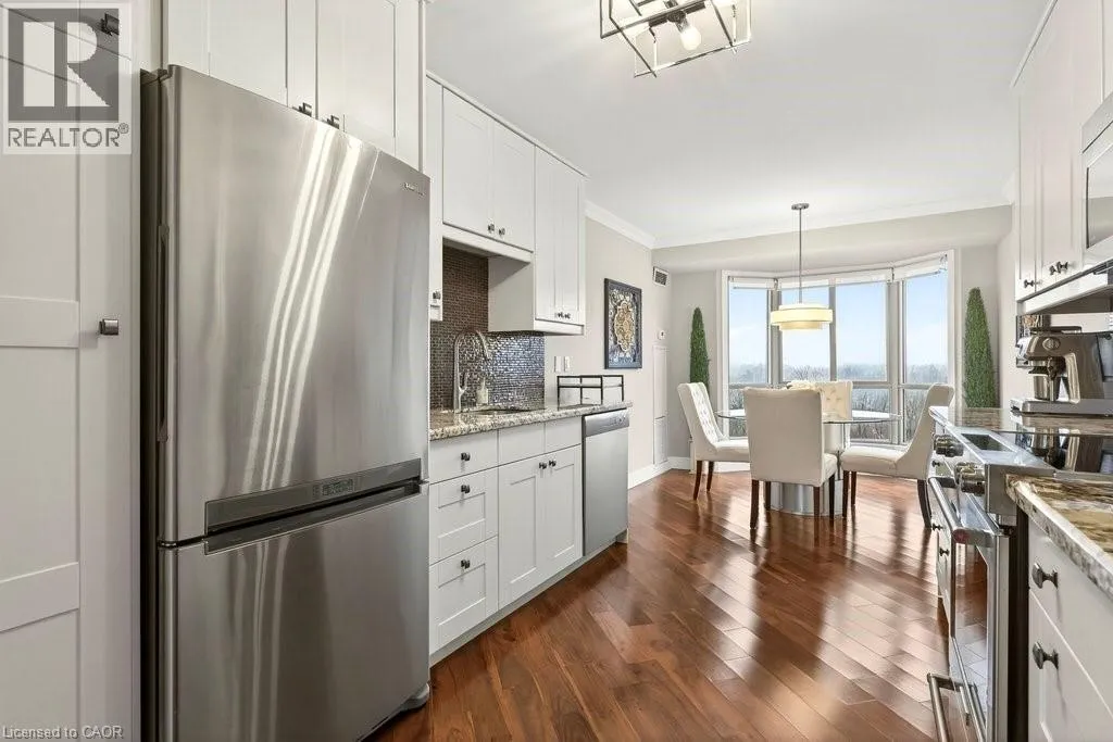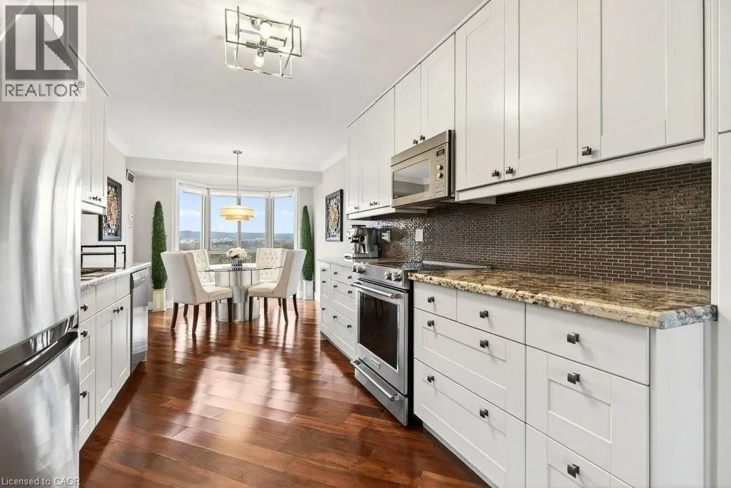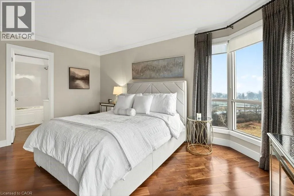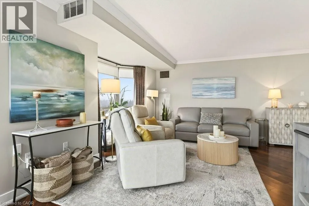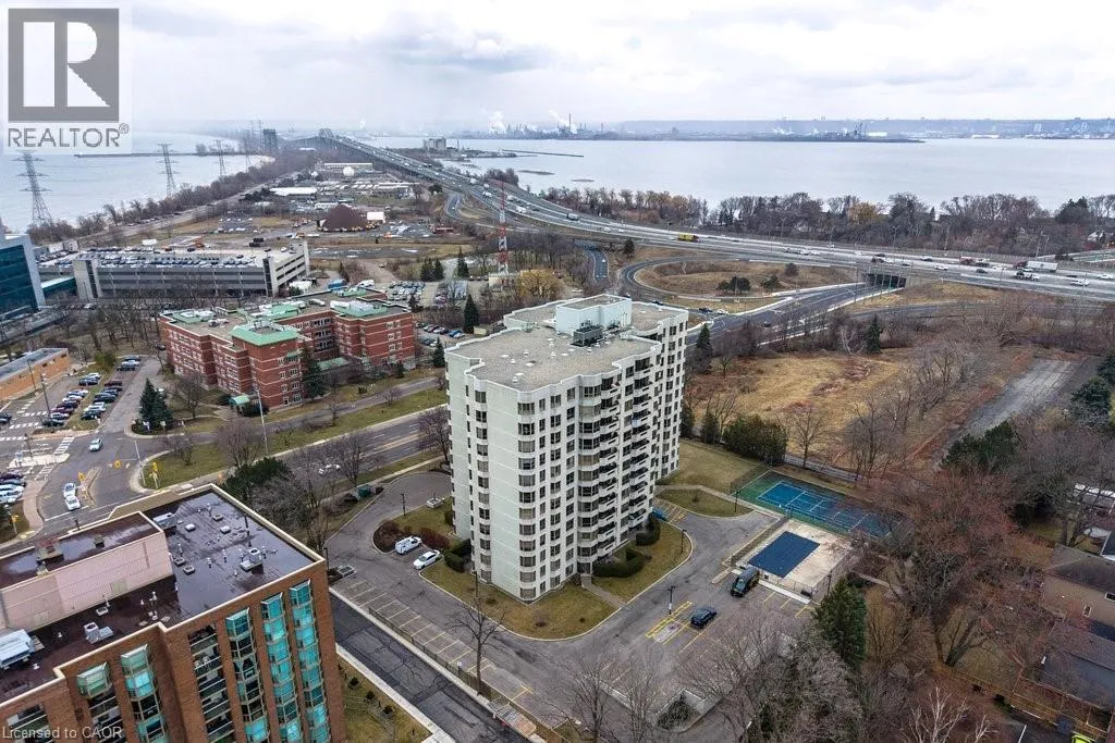 North Shore Blvd E/Maple Ave Beautifully updated 2 bedroom corner suite at 'Lake Winds' in prime downtown core location! Just steps to the lake, waterfront park, restaurants, shops, hospital and highway access. 1,532 sq.ft. loaded with natural light featuring southwest exposure and gorgeous views of the lake, bay, bridge, escarpment and beyond! Upgraded eat-in kitchen with granite, stainless steel appliances, glass subway tile backsplash and pantries for extra storage. The primary bedroom features a 4-piece ensuite with soaker tub and custom closet, while the second bedroom is highlighted by a large built-in wardrobe and easy access to an updated 3-piece bathroom with oversized walk-in glass shower. Open living/dining area exudes sophistication with rich engineered hardwood floors, crown moulding, bay windows, electric fireplace, custom window coverings, modern light fixtures, walkout to a private balcony and access to a spacious in-suite laundry with built-in cabinetry. Building amenities include a heated outdoor pool, tennis court, sauna, fitness centre, car wash bay, social room, bicycle storage, workshop and ample visitor parking. Traffic light located at building entrance for safe and easy entering and exiting. 2 underground parking spaces and 1 storage locker. Condo fee includes all utilities. (id:27476)