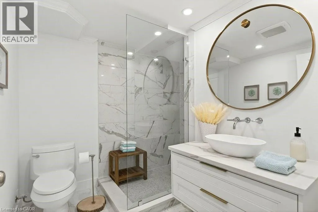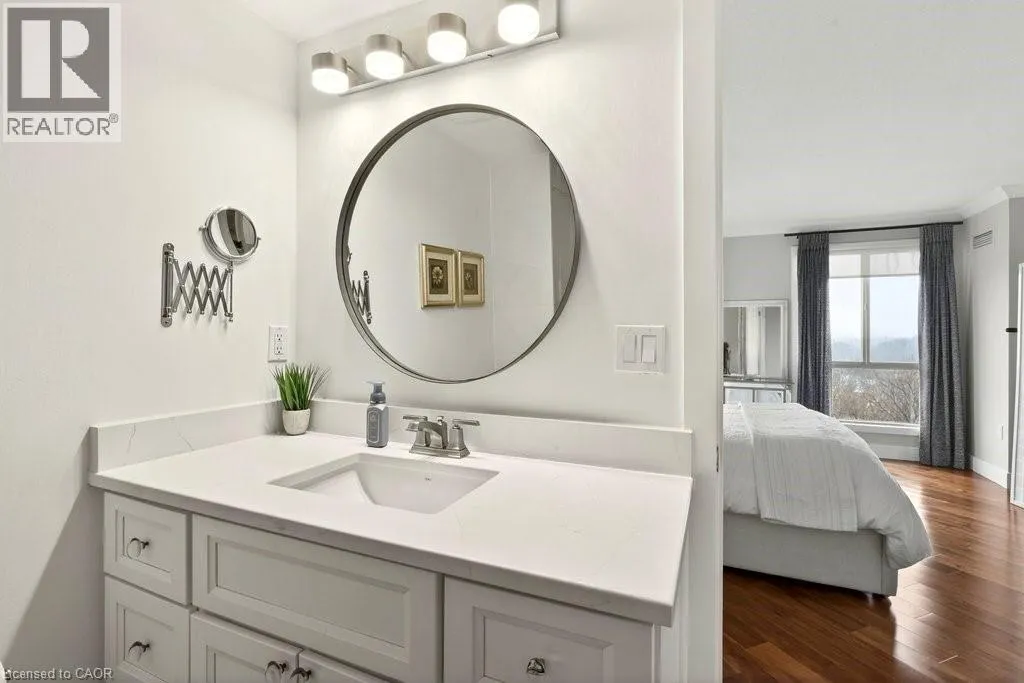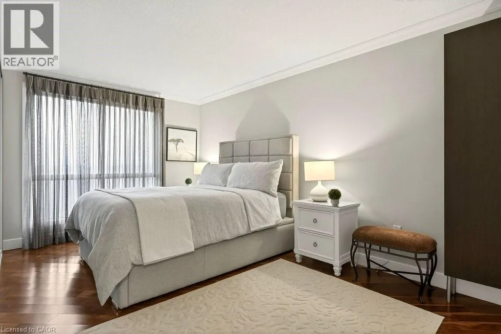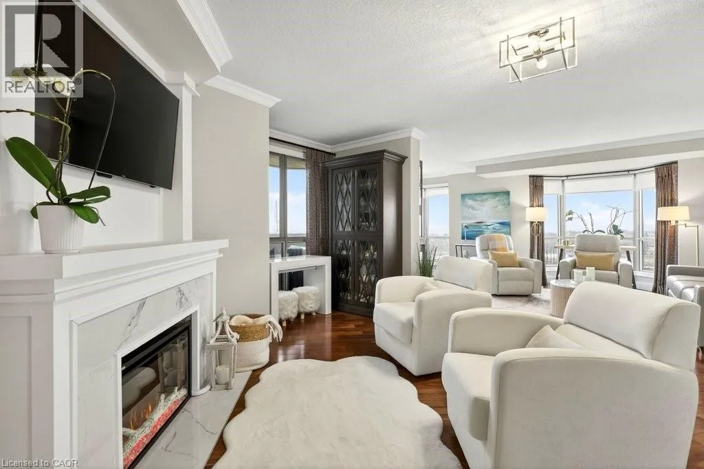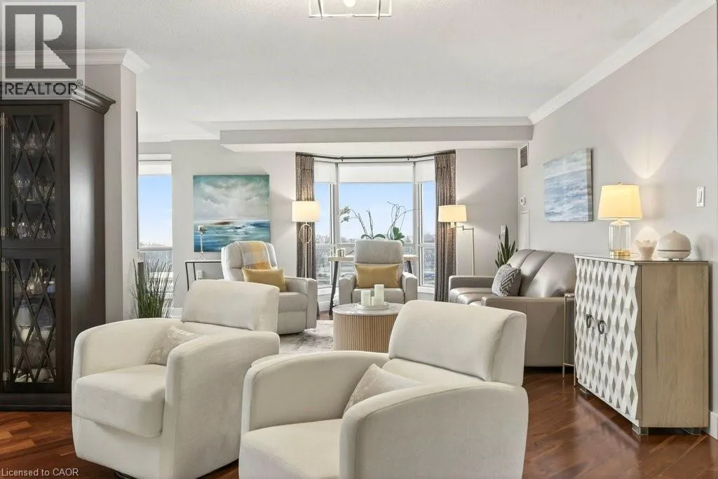 North Shore Blvd E/Maple Ave Beautifully updated 2 bedroom corner suite at 'Lake Winds' in prime downtown core location! Just steps to the lake, waterfront park, restaurants, shops, hospital and highway access. 1,532 sq.ft. loaded with natural light featuring southwest exposure and gorgeous views of the lake, bay, bridge, escarpment and beyond! Upgraded eat-in kitchen with granite, stainless steel appliances, glass subway tile backsplash and pantries for extra storage. The primary bedroom features a 4-piece ensuite with soaker tub and custom closet, while the second bedroom is highlighted by a large built-in wardrobe and easy access to an updated 3-piece bathroom with oversized walk-in glass shower. Open living/dining area exudes sophistication with rich engineered hardwood floors, crown moulding, bay windows, electric fireplace, custom window coverings, modern light fixtures, walkout to a private balcony and access to a spacious in-suite laundry with built-in cabinetry. Building amenities include a heated outdoor pool, tennis court, sauna, fitness centre, car wash bay, social room, bicycle storage, workshop and ample visitor parking. Traffic light located at building entrance for safe and easy entering and exiting. 2 underground parking spaces and 1 storage locker. Condo fee includes all utilities. (id:27476)