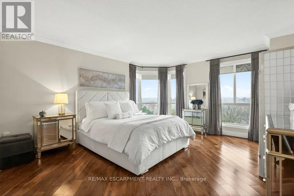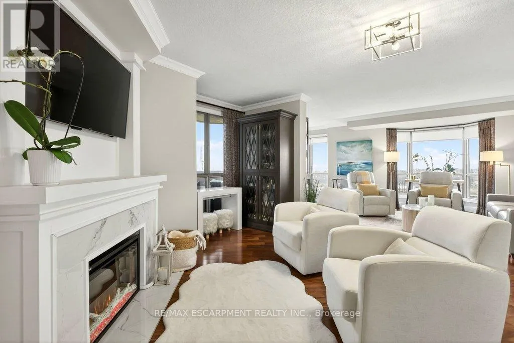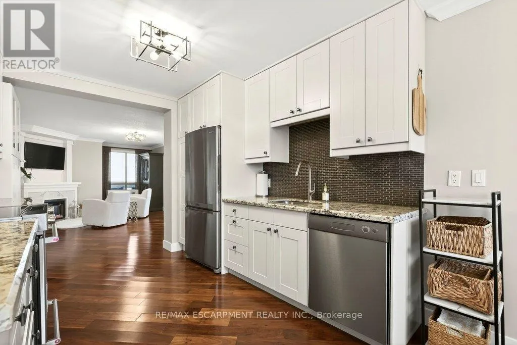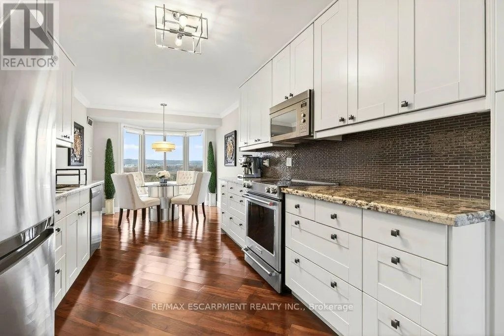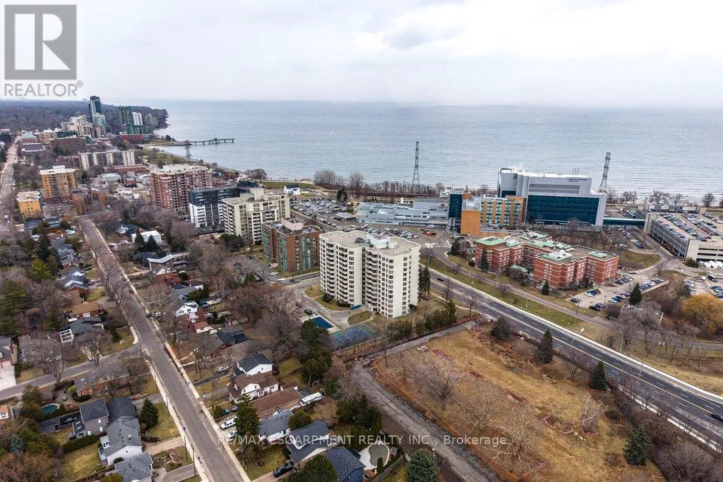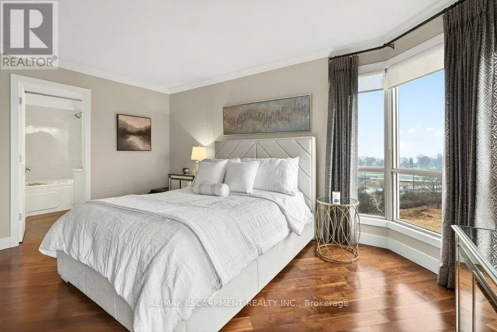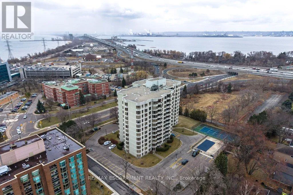 Cross Streets: Maple Ave. ** Directions: North Shore Blvd E/Maple Ave. Beautifully updated 2 bedroom corner suite at 'Lake Winds' in prime downtown core location! Just steps to the lake, waterfront park, restaurants, shops, hospital and highway access. 1,532 sq.ft. loaded with natural light featuring southwest exposure and gorgeous views of the lake, bay, bridge, escarpment and beyond! Upgraded eat-in kitchen with granite, stainless steel appliances, glass subway tile backsplash and pantries for extra storage. The primary bedroom features a 4-piece ensuite with soaker tub and custom closet, while the second bedroom is highlighted by a large built-in wardrobe and easy access to an updated 3-piece bathroom with oversized walk-in glass shower. Open living/dining area exudes sophistication with rich engineered hardwood floors, crown moulding, bay windows, electric fireplace, custom window coverings, modern light fixtures, walkout to a private balcony and access to a spacious in-suite laundry with built-in cabinetry. Building amenities include a heated outdoor pool, tennis court, sauna, fitness centre, car wash bay, social room, bicycle storage, workshop and ample visitor parking. Traffic light located at building entrance for safe and easy entering and exiting. 2 underground parking spaces and 1 storage locker. Condo fee includes all utilities. (id:27476)