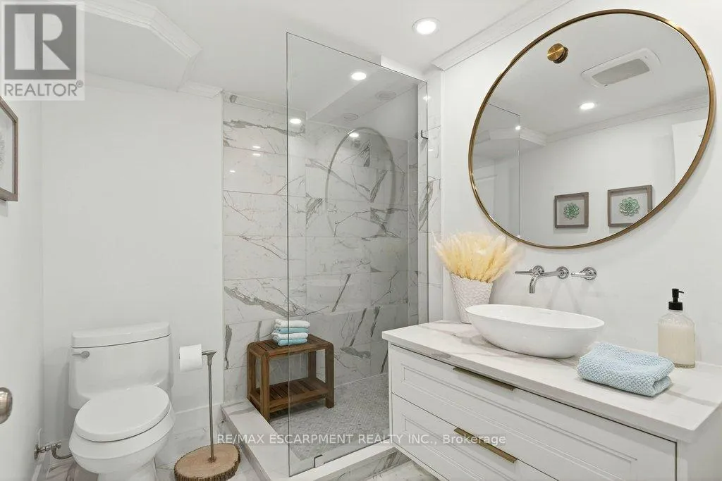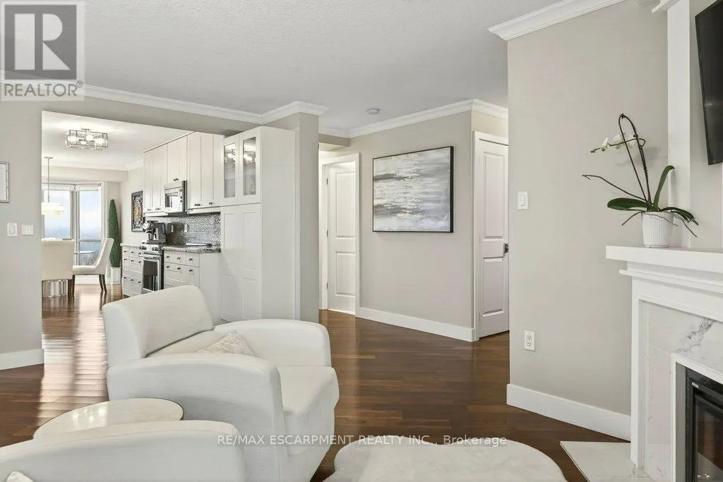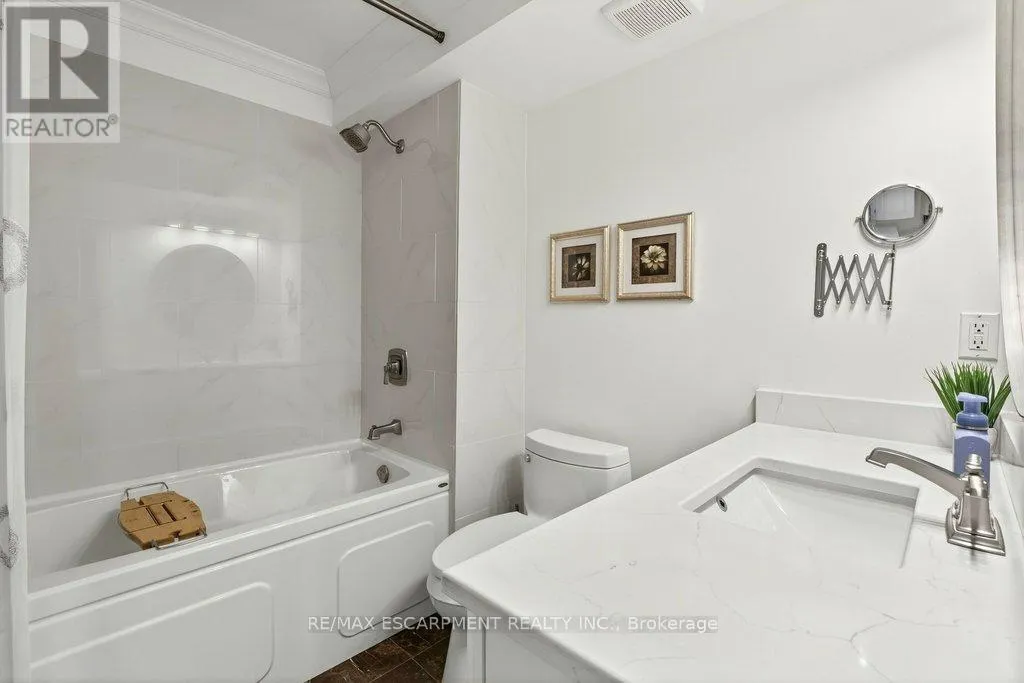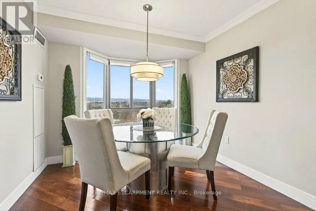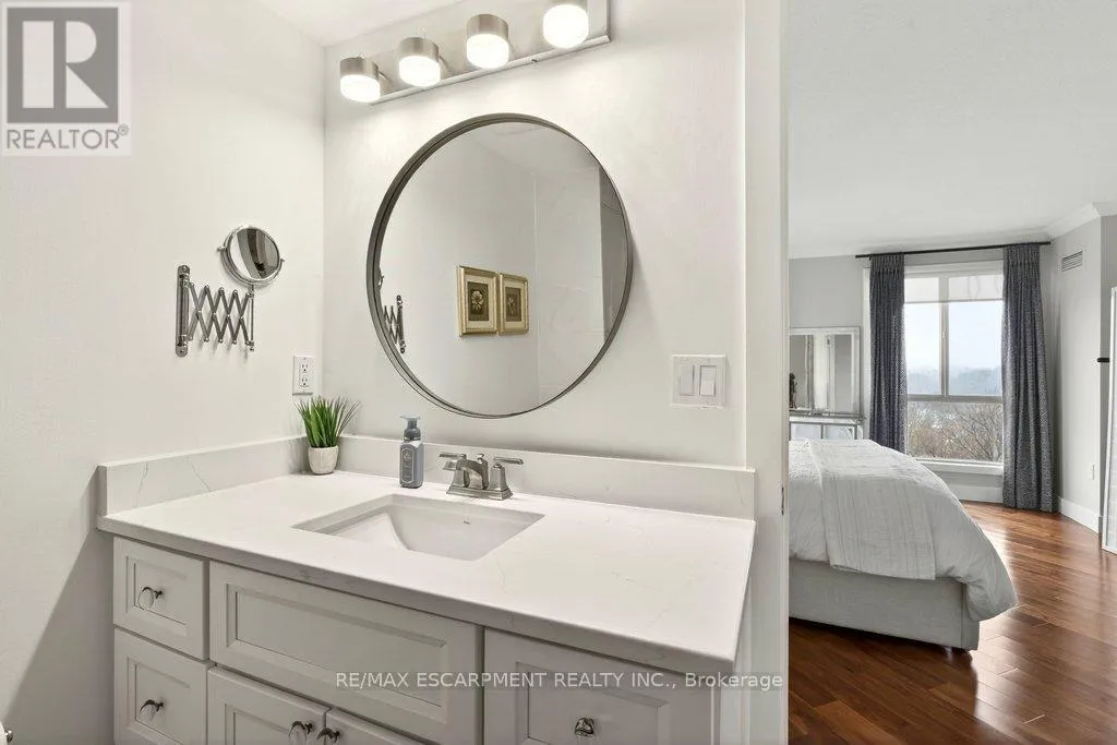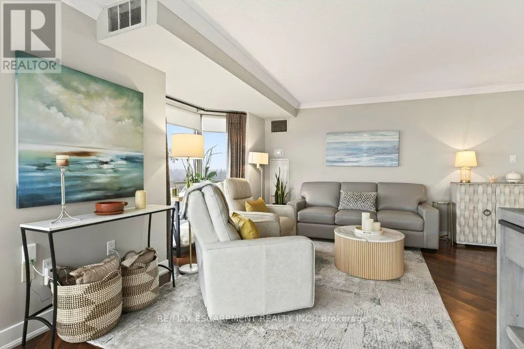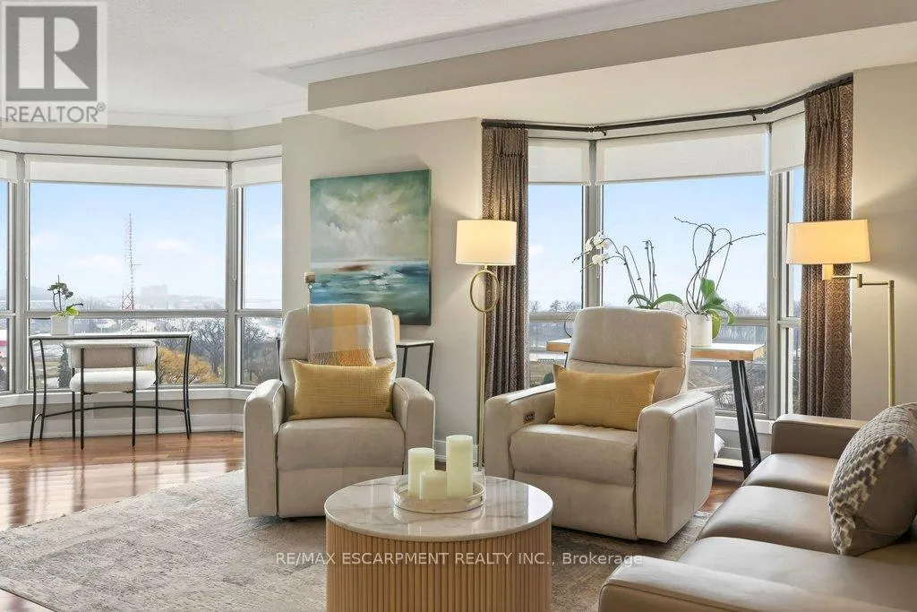 Cross Streets: Maple Ave. ** Directions: North Shore Blvd E/Maple Ave. Beautifully updated 2 bedroom corner suite at 'Lake Winds' in prime downtown core location! Just steps to the lake, waterfront park, restaurants, shops, hospital and highway access. 1,532 sq.ft. loaded with natural light featuring southwest exposure and gorgeous views of the lake, bay, bridge, escarpment and beyond! Upgraded eat-in kitchen with granite, stainless steel appliances, glass subway tile backsplash and pantries for extra storage. The primary bedroom features a 4-piece ensuite with soaker tub and custom closet, while the second bedroom is highlighted by a large built-in wardrobe and easy access to an updated 3-piece bathroom with oversized walk-in glass shower. Open living/dining area exudes sophistication with rich engineered hardwood floors, crown moulding, bay windows, electric fireplace, custom window coverings, modern light fixtures, walkout to a private balcony and access to a spacious in-suite laundry with built-in cabinetry. Building amenities include a heated outdoor pool, tennis court, sauna, fitness centre, car wash bay, social room, bicycle storage, workshop and ample visitor parking. Traffic light located at building entrance for safe and easy entering and exiting. 2 underground parking spaces and 1 storage locker. Condo fee includes all utilities. (id:27476)