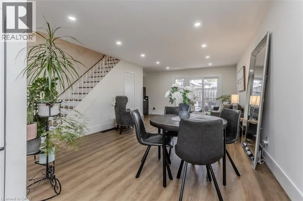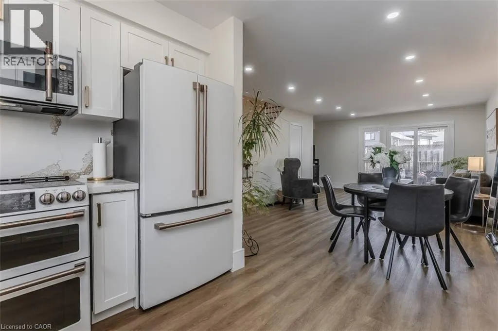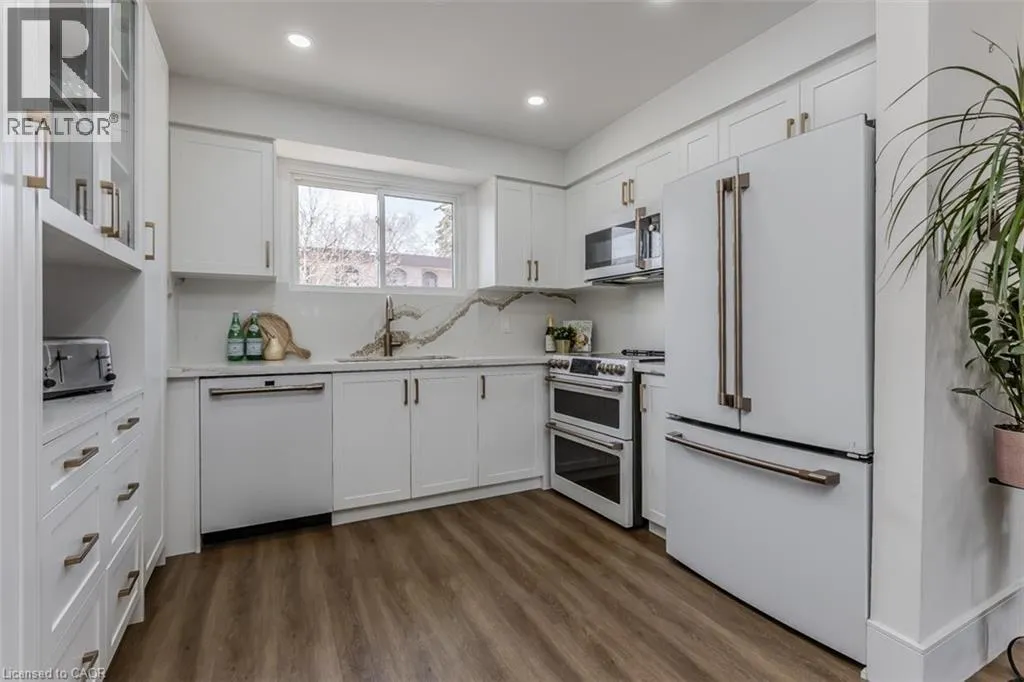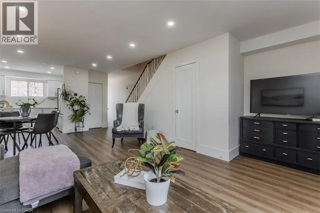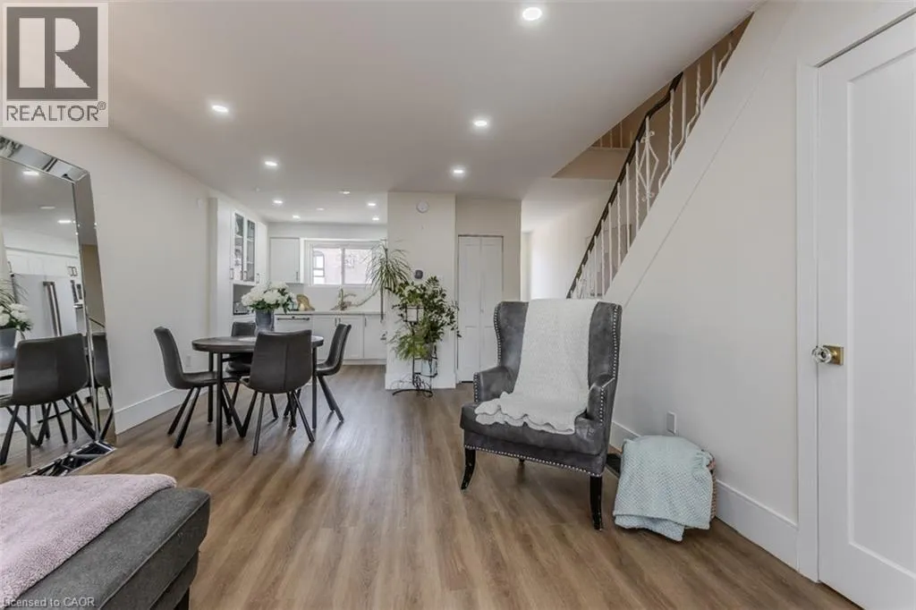 Welcome to this beautifully updated townhome offering the perfect blend of comfort, style, and locationâideal for new families seeking a vibrant lifestyle. Set in a highly desirable, family-friendly neighbourhood, youâre just a short walk to the lake, downtown, parks, and everyday amenities, with easy access to major highways for effortless commuting. From the moment you arrive, the home impresses with charming curb appeal, an inviting front walkway, and landscaped gardens with a retaining wall. With parking for up to three cars, convenience is built right in. Inside, the main level features a bright, open-concept layout with luxury vinyl flooring throughout, enhanced by newer interior doors, trim, and dimmable pot lights that create a warm and modern feel. The fully renovated kitchen is a standout, showcasing stylish finishes, quartz countertops and backsplash, custom cabinetry, and a built-in coffee bar with pot and pan drawersâperfect for both everyday living and entertaining. The dining area flows seamlessly into the spacious living room, complete with a walkout to the backyard. Step outside to your own private retreat. The fully fenced backyard offers mature trees for added privacy, a stamped concrete patio, and maintenance-free turfâperfect for relaxing, entertaining, or enjoying time with family. A convenient 2-piece powder room completes this level. Upstairs, hardwood continues throughout, leading to two generously sized bedrooms and a beautifully renovated 4-piece bathroom featuring contemporary large slab marble tile, a dual sink vanity, LED mirror, and a walk-in glass shower with bench seating. A move-in ready home in an unbeatable lifestyle locationâthis is one you wonât want to miss. (id:27476)