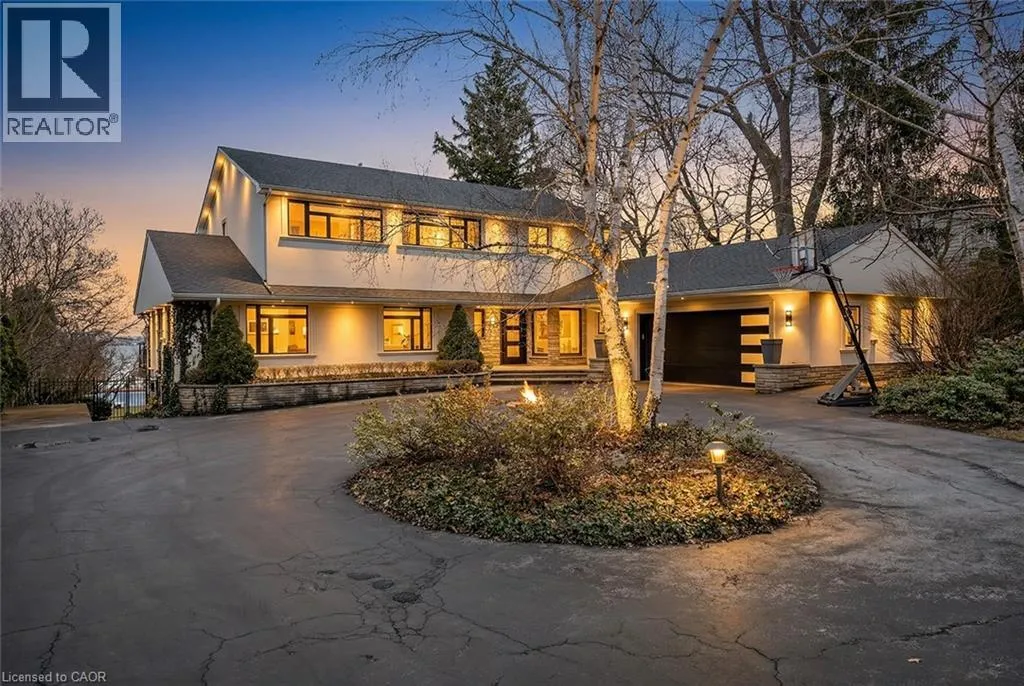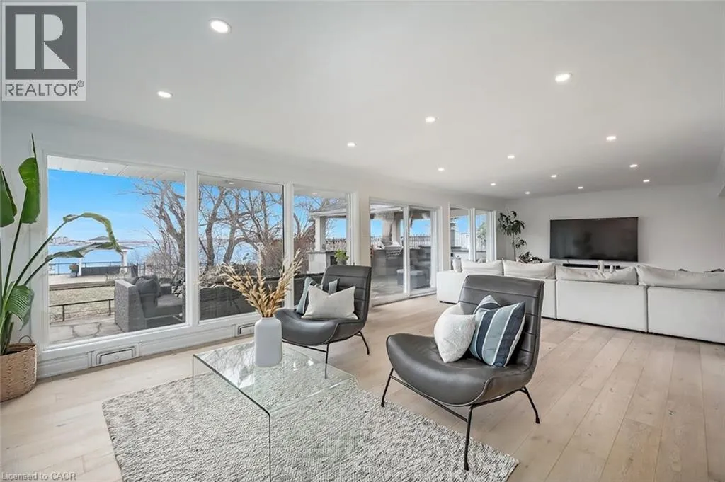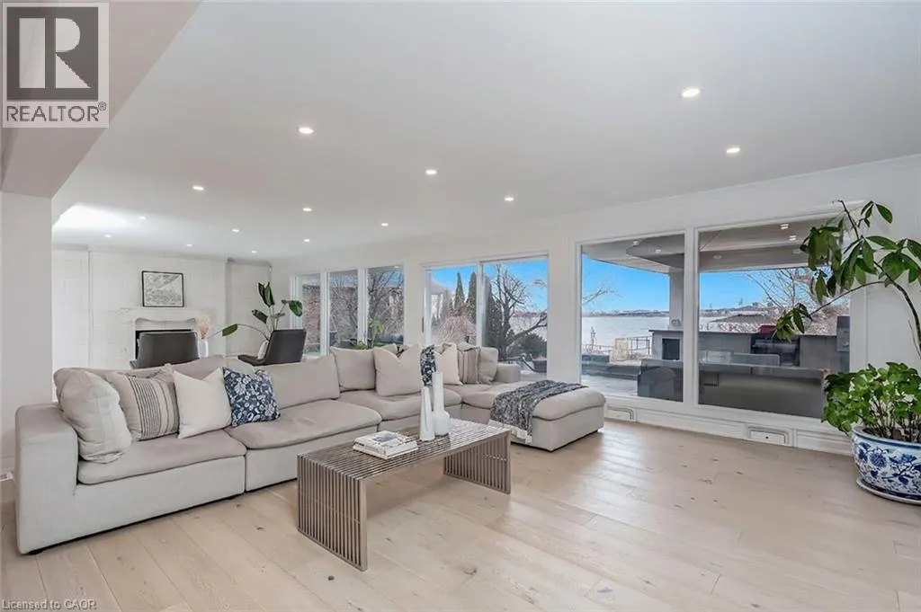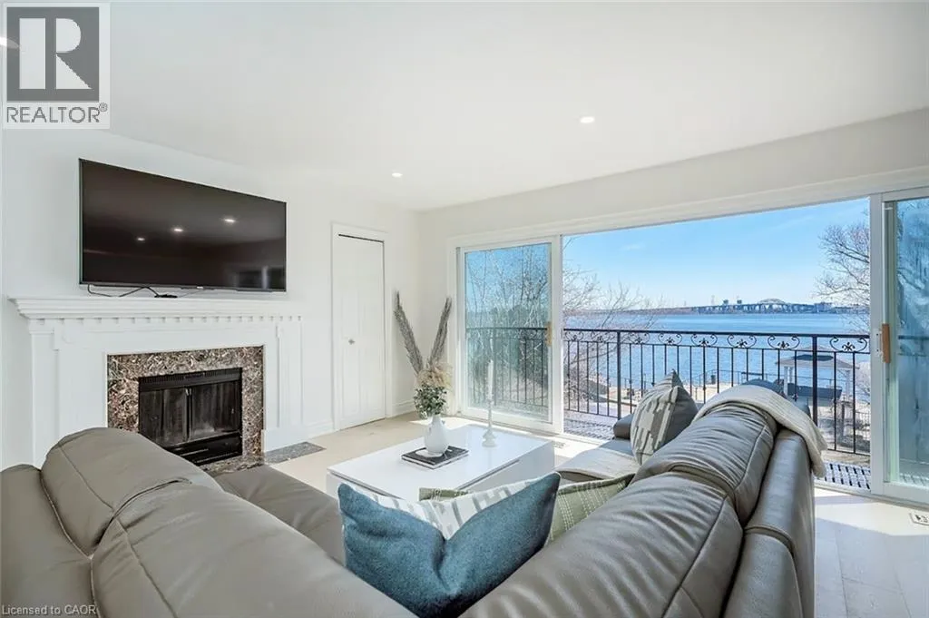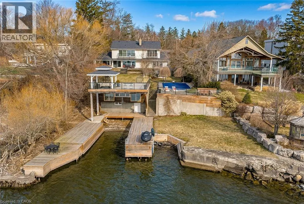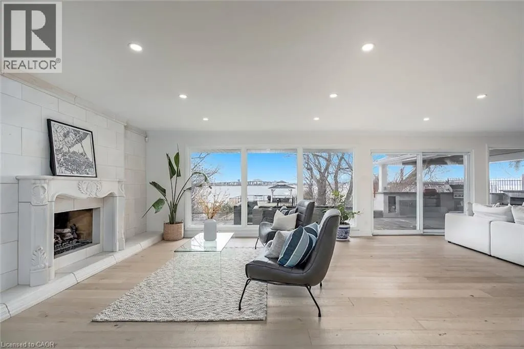 Extensively updated waterfront home offering over 6900 square feet of total living space including 6 bedrooms, 4.5 baths, and three self-contained living spaces ideal for multi-generational living. Set on a rare 93 x 313 ft lot on the bay, this property delivers breathtaking views, private docking, and exceptional outdoor living. The main level features an open concept living and dining area with a wall of windows, gas fireplace, and walkout to a resort-style backyard. The custom chefâs kitchen showcases marble countertops, stainless steel appliances including a six-burner gas stove, wine, and beverage fridges, skylight, and extensive cabinetry. A main floor primary or in-law suite offers a private living area with wet bar and fireplace, a bedroom with office, nursery or dressing room, and ensuite bath. Upstairs, the luxurious primary retreat features a walk-in closet, spa-like ensuite with jetted tub, a fireplace, and private balcony overlooking the water, while three additional bedrooms provide ample space and share a gorgeous bath. The walkout lower level includes a recreation room with fireplace, kitchenette, sixth bedroom, full bath, and separate entrance. Outside, enjoy a saltwater pool, covered outdoor kitchen, multiple decks, gazebo, docks, and a boathouse with heated roomâperfect as a gym or lounge. Ten-car circular driveway, double garage, and extensive updates throughout complete this exceptional lakeside offering. (id:27476)