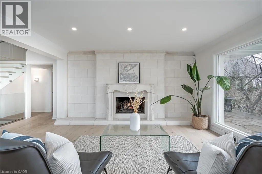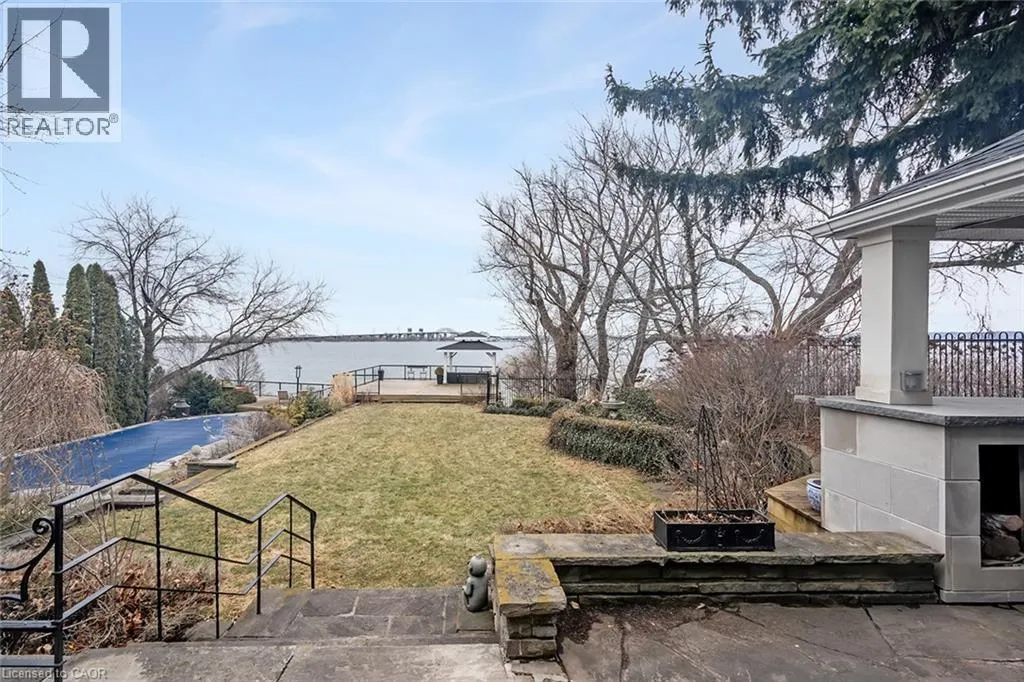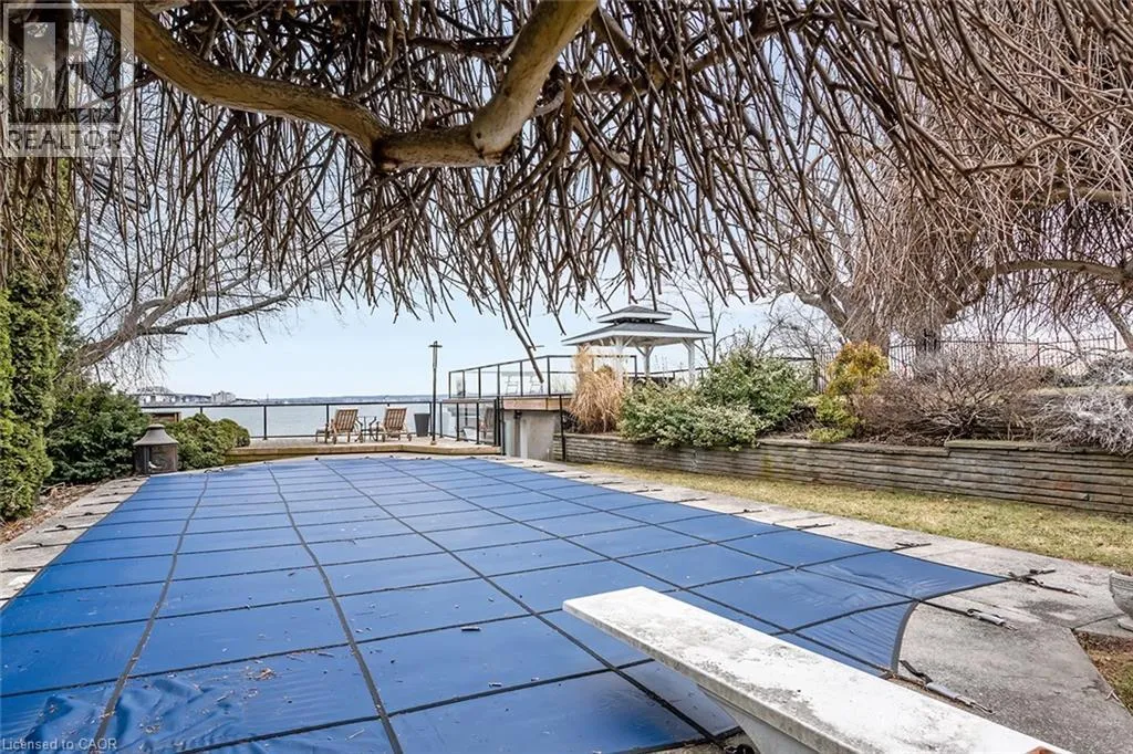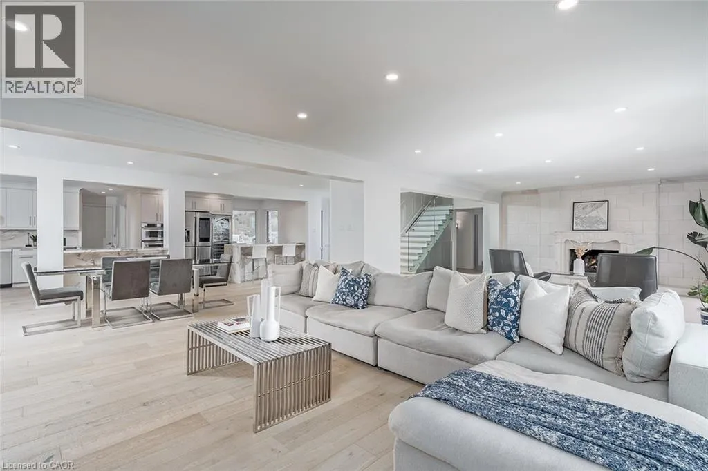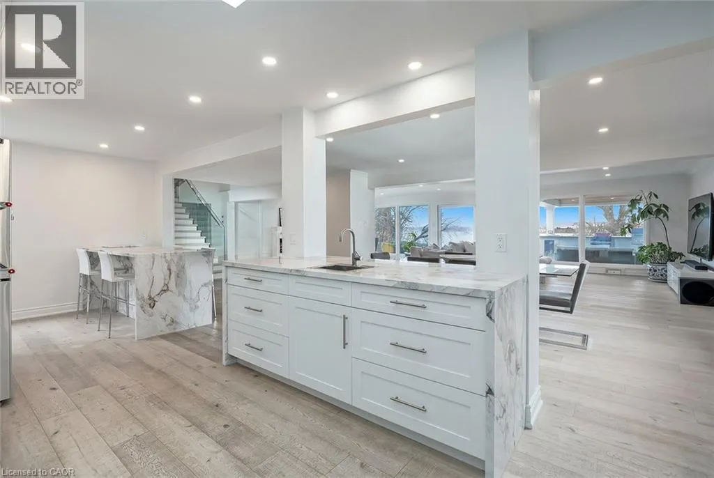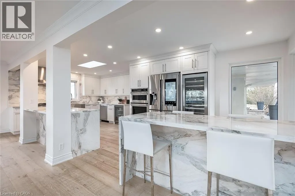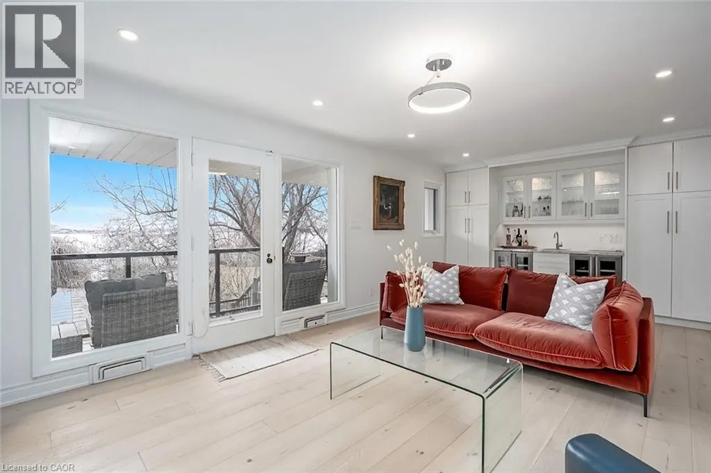 Extensively updated waterfront home offering over 6900 square feet of total living space including 6 bedrooms, 4.5 baths, and three self-contained living spaces ideal for multi-generational living. Set on a rare 93 x 313 ft lot on the bay, this property delivers breathtaking views, private docking, and exceptional outdoor living. The main level features an open concept living and dining area with a wall of windows, gas fireplace, and walkout to a resort-style backyard. The custom chefâs kitchen showcases marble countertops, stainless steel appliances including a six-burner gas stove, wine, and beverage fridges, skylight, and extensive cabinetry. A main floor primary or in-law suite offers a private living area with wet bar and fireplace, a bedroom with office, nursery or dressing room, and ensuite bath. Upstairs, the luxurious primary retreat features a walk-in closet, spa-like ensuite with jetted tub, a fireplace, and private balcony overlooking the water, while three additional bedrooms provide ample space and share a gorgeous bath. The walkout lower level includes a recreation room with fireplace, kitchenette, sixth bedroom, full bath, and separate entrance. Outside, enjoy a saltwater pool, covered outdoor kitchen, multiple decks, gazebo, docks, and a boathouse with heated roomâperfect as a gym or lounge. Ten-car circular driveway, double garage, and extensive updates throughout complete this exceptional lakeside offering. (id:27476)