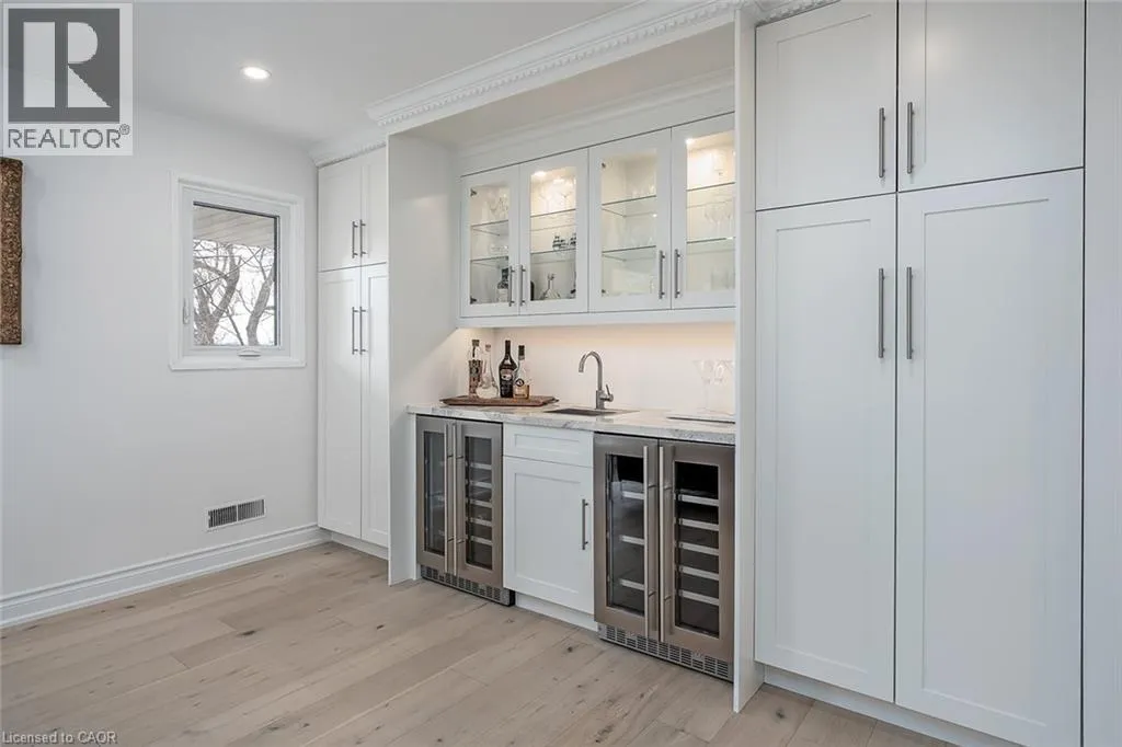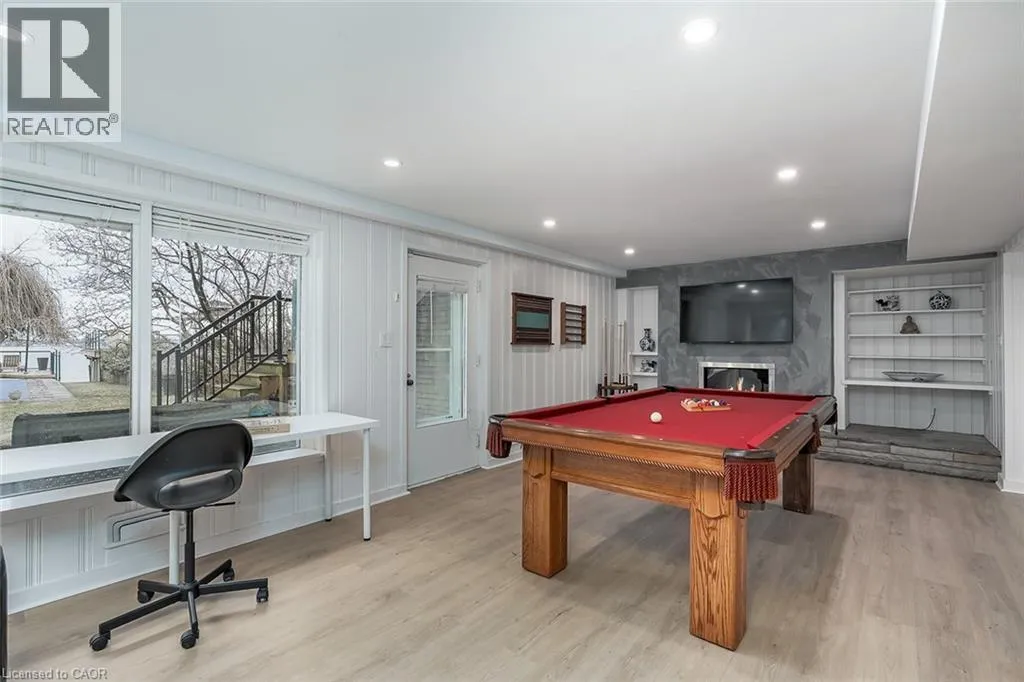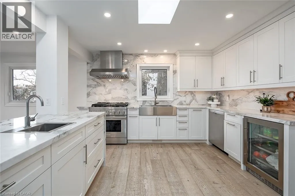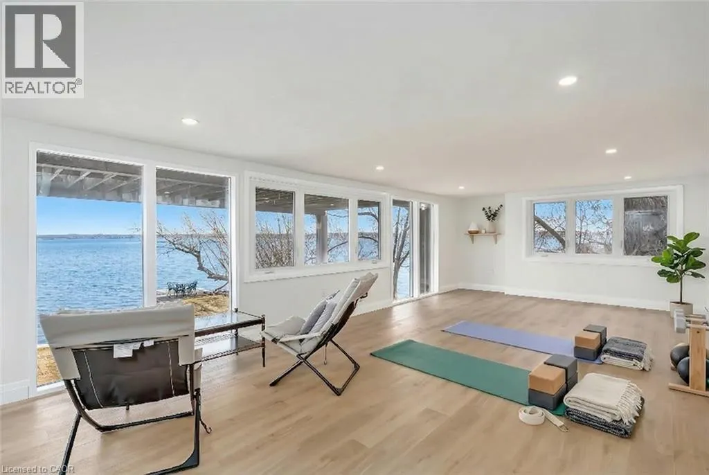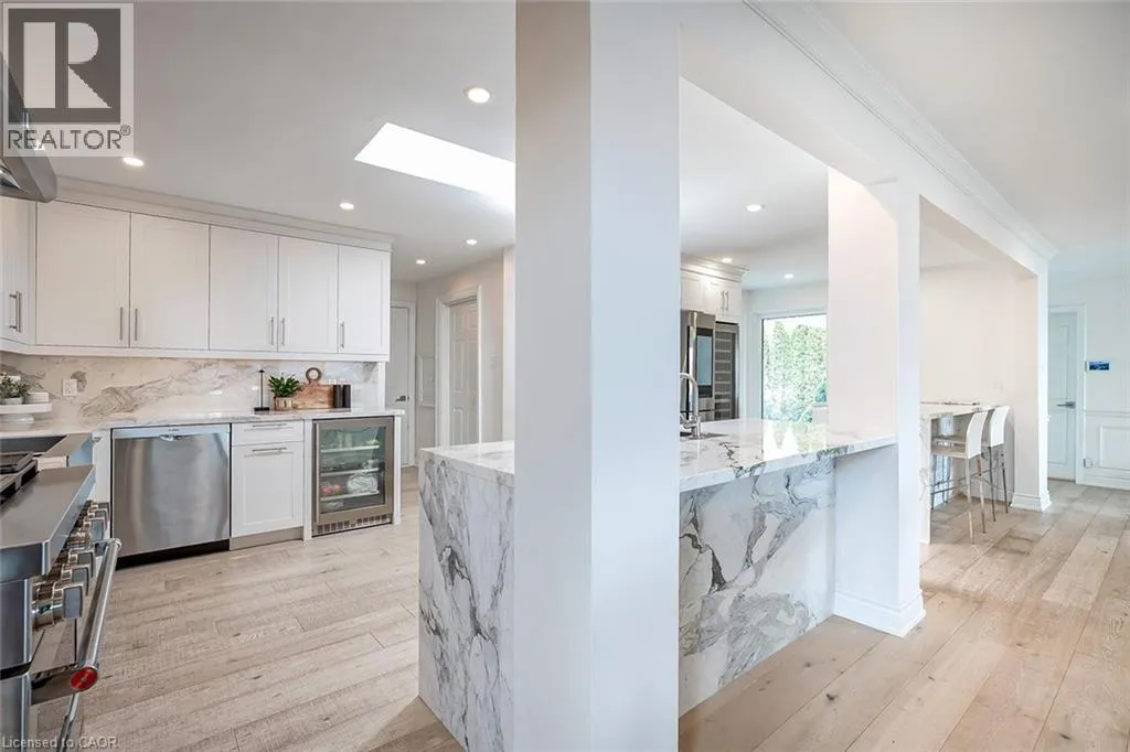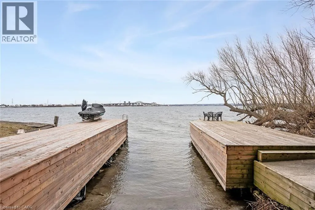 Extensively updated waterfront home offering over 6900 square feet of total living space including 6 bedrooms, 4.5 baths, and three self-contained living spaces ideal for multi-generational living. Set on a rare 93 x 313 ft lot on the bay, this property delivers breathtaking views, private docking, and exceptional outdoor living. The main level features an open concept living and dining area with a wall of windows, gas fireplace, and walkout to a resort-style backyard. The custom chefâs kitchen showcases marble countertops, stainless steel appliances including a six-burner gas stove, wine, and beverage fridges, skylight, and extensive cabinetry. A main floor primary or in-law suite offers a private living area with wet bar and fireplace, a bedroom with office, nursery or dressing room, and ensuite bath. Upstairs, the luxurious primary retreat features a walk-in closet, spa-like ensuite with jetted tub, a fireplace, and private balcony overlooking the water, while three additional bedrooms provide ample space and share a gorgeous bath. The walkout lower level includes a recreation room with fireplace, kitchenette, sixth bedroom, full bath, and separate entrance. Outside, enjoy a saltwater pool, covered outdoor kitchen, multiple decks, gazebo, docks, and a boathouse with heated roomâperfect as a gym or lounge. Ten-car circular driveway, double garage, and extensive updates throughout complete this exceptional lakeside offering. (id:27476)