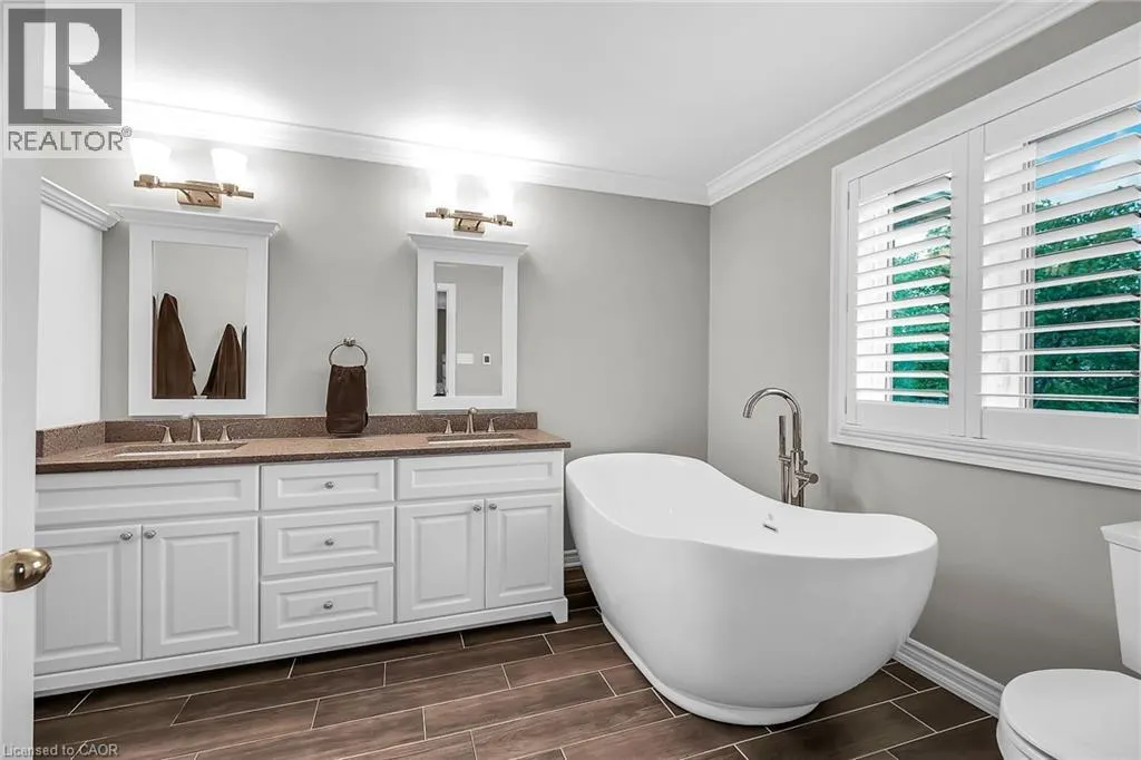 Dundas St to Sutton Dr to Pathfinder Dr Welcome to this beautifully maintained home, tucked away in Burlingtonâs highly desirable âOrchardâ neighbourhood. With 4+1 bedrooms and 3.5 bathrooms, this spacious home offers the perfect balance of comfort, functionality & modern touches. Ideal for growing families or anyone looking for room to live, work, and entertain in style. Step inside to discover a bright, open-concept main level. The eat-in kitchen features granite countertops, modern cabinetry, pot lights, and a seamless flow into the family room w/ a cozy gas fireplace. Crown moulding adds a touch of elegance to the formal dining area, ideal for hosting memorable dinners w/ family & friends. Sliding glass doors lead to a private, fully fenced backyard, complete w/ a spacious deck, lush landscaping, hot tub, and garden shed, making it the perfect space to unwind or entertain. Practical details havenât been overlooked. The mudroom off the garage includes custom built-ins to keep daily life organized. Upstairs, the primary bedroom offers a true retreat, complete with a luxurious 5pc ensuite featuring heated floors, a deep soaker tub, and a separate shower. Three additional bedrooms, a 4pc bath, and the convenience of upper-level laundry complete this level. The finished basement adds valuable living space with a 5th bedroom, a spacious rec room, 4pc bath, and ample storage. This space is ideal for guests, teens, or a home office setup. This home has been extensively updated over the past 10 years, including: windows (2024), ensuite bath, shingles, furnace & AC, backyard deck & landscaping, driveway, garage door, flooring, California shutters, and kitchen cabinetsâjust move in and enjoy. Perfectly located close to schools, parks, trails, shopping, dining, and just a short drive to Bronte Creek Provincial Park and major highways including the QEW & 407. Donât miss your chance to live in one of Burlingtonâs best communities. This exceptional home is waiting for you! (id:27476)