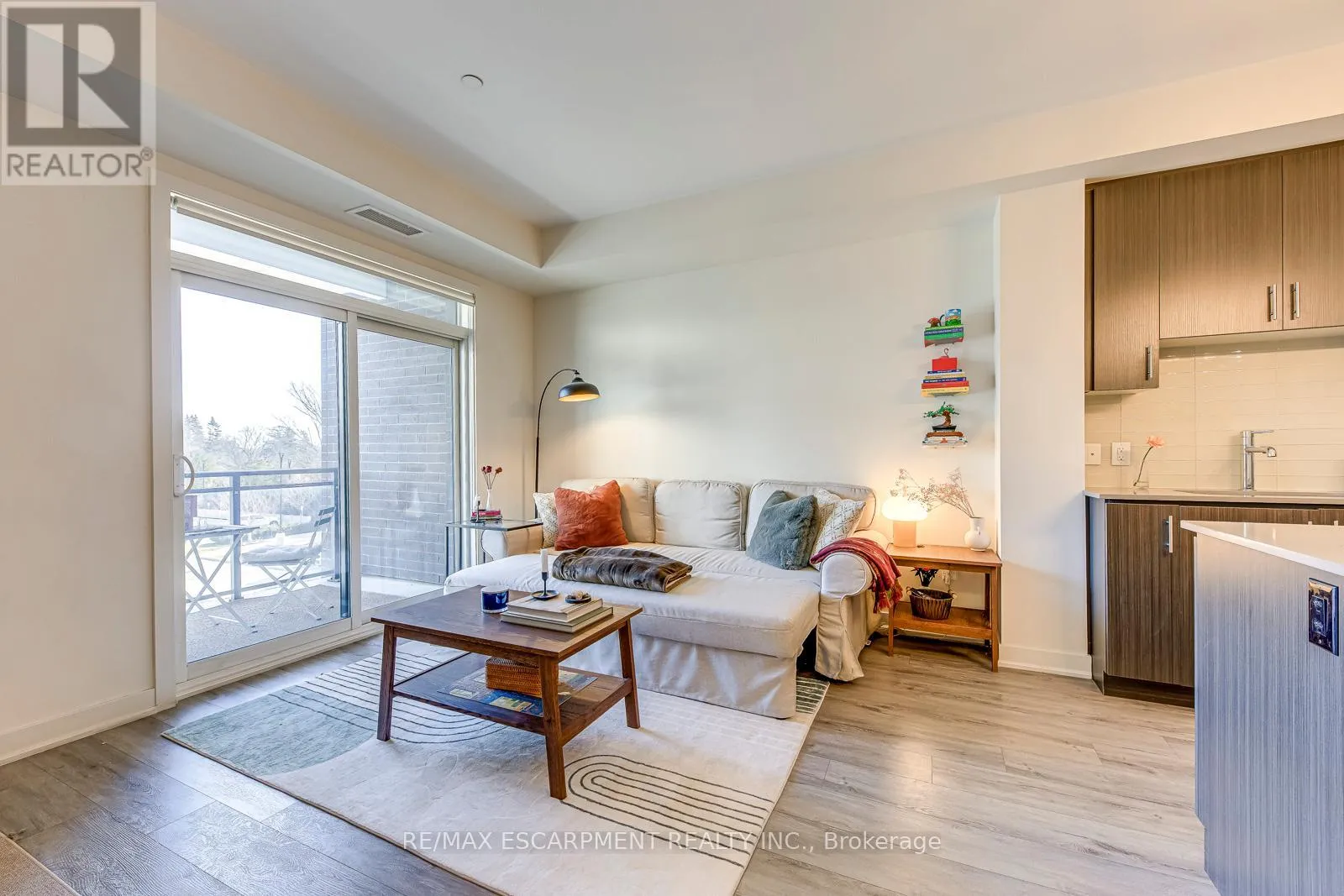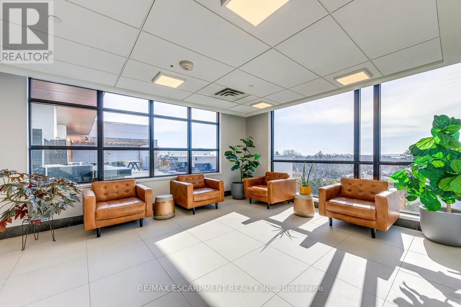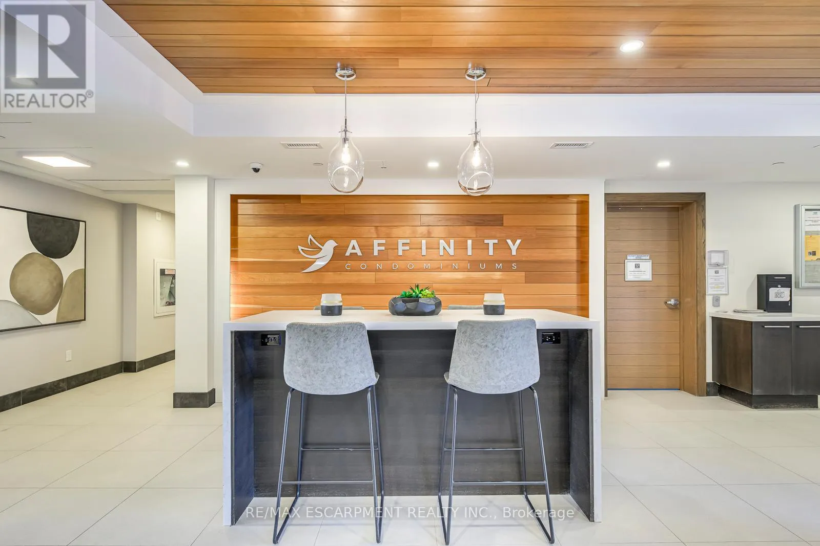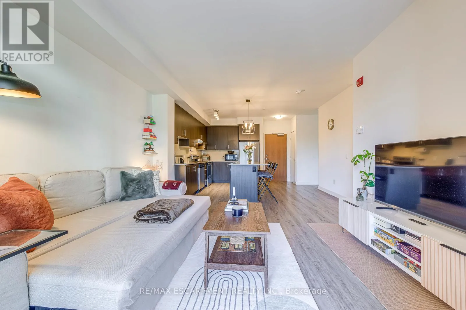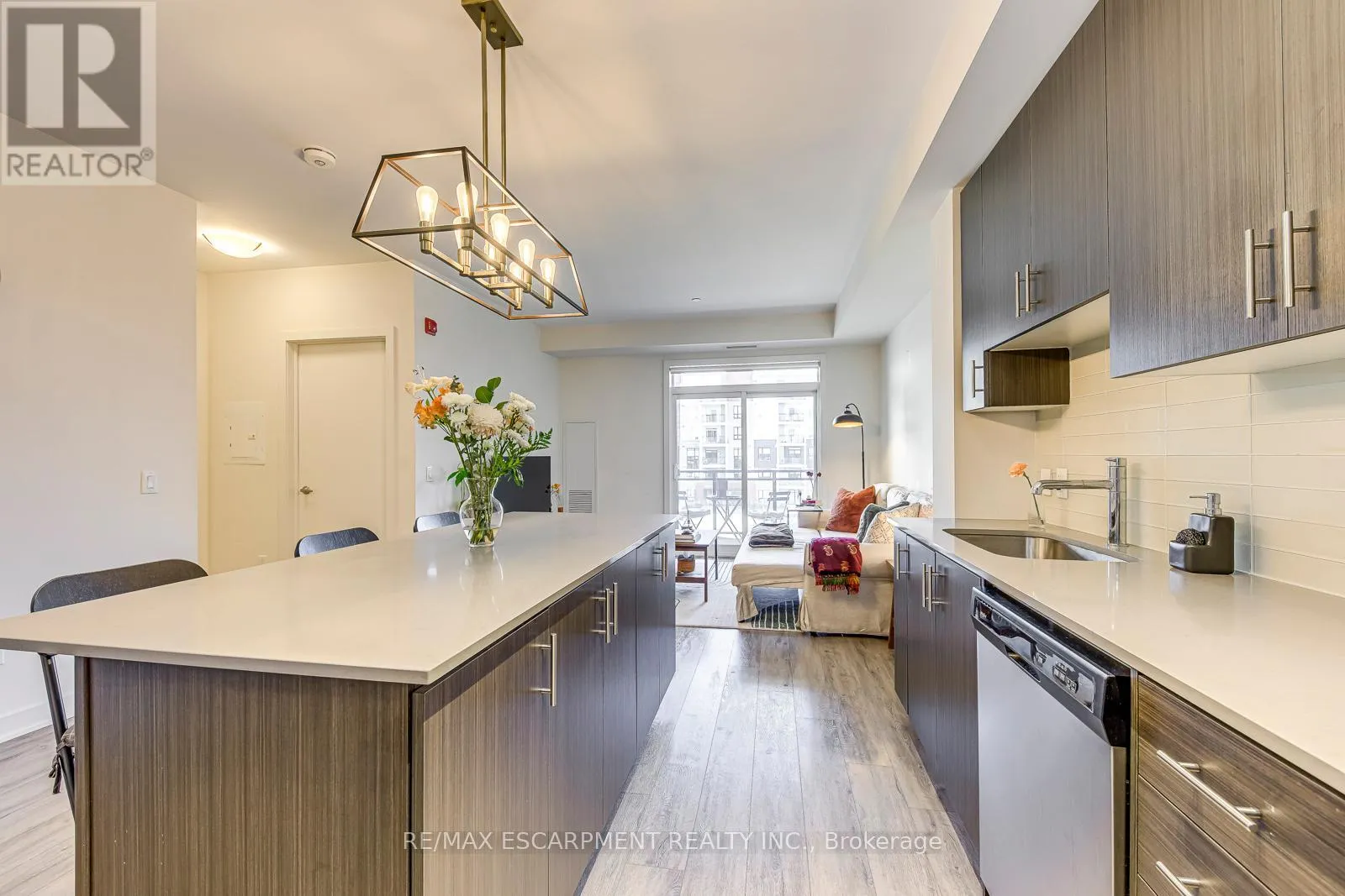 Plains Rd & Filmandale Rd Luxury living with breathtaking views at the Rosehaven built "Affinity" Condos! Experience modern elegance in this sun filled, bright and spacious 1 Bedroom + Den suite, beautifully appointed with premium laminate flooring and designer lighting throughout. The open-concept layout features a chef inspired kitchen with quartz counters, contemporary backsplash, large sink, and gorgeous island - truly an Entertainers delight. Enjoy morning coffee from your private balcony overlooking peaceful greenery, a true extension of living space. The primary bedroom includes a double door closet and boasts large windows, filling the space with natural light. The spa-inspired bathroom offers a built in vanity with plenty of storage and a beautifully tiled tub/shower combination for your relaxation. The versatile den provides ample space for a home office, hobby area, or reading nook-ideal for today's lifestyle. Residents enjoy award-winning amenities including a rooftop terrace with breathtaking views, fitness centre, party room, and much more. **EXTRAS** Premium Parking and Premium Locker included. Pride of ownership - this unit truly impresses! Prime Location with steps to shopping, schools, restaurants, transit, and minutes to highways and Aldershot GO. Location Location Location! (id:27476)