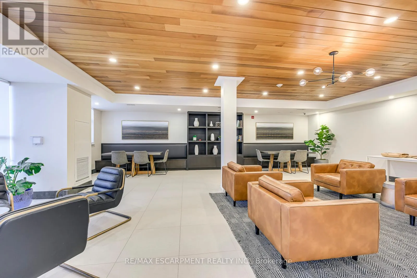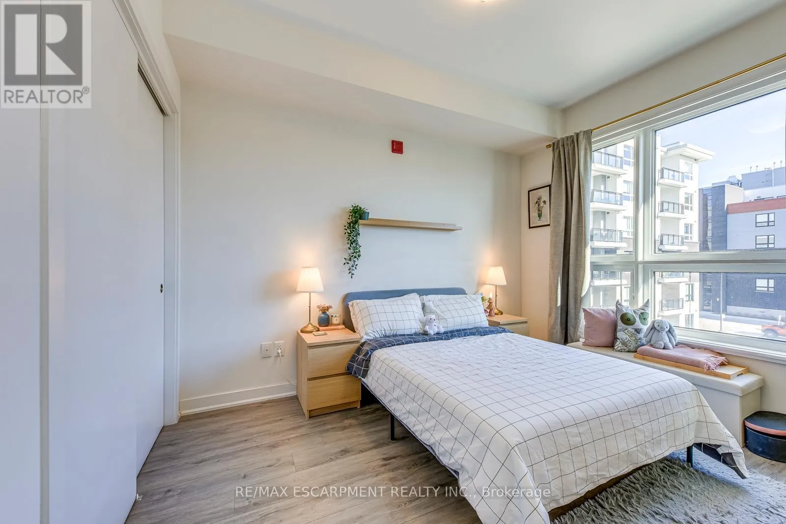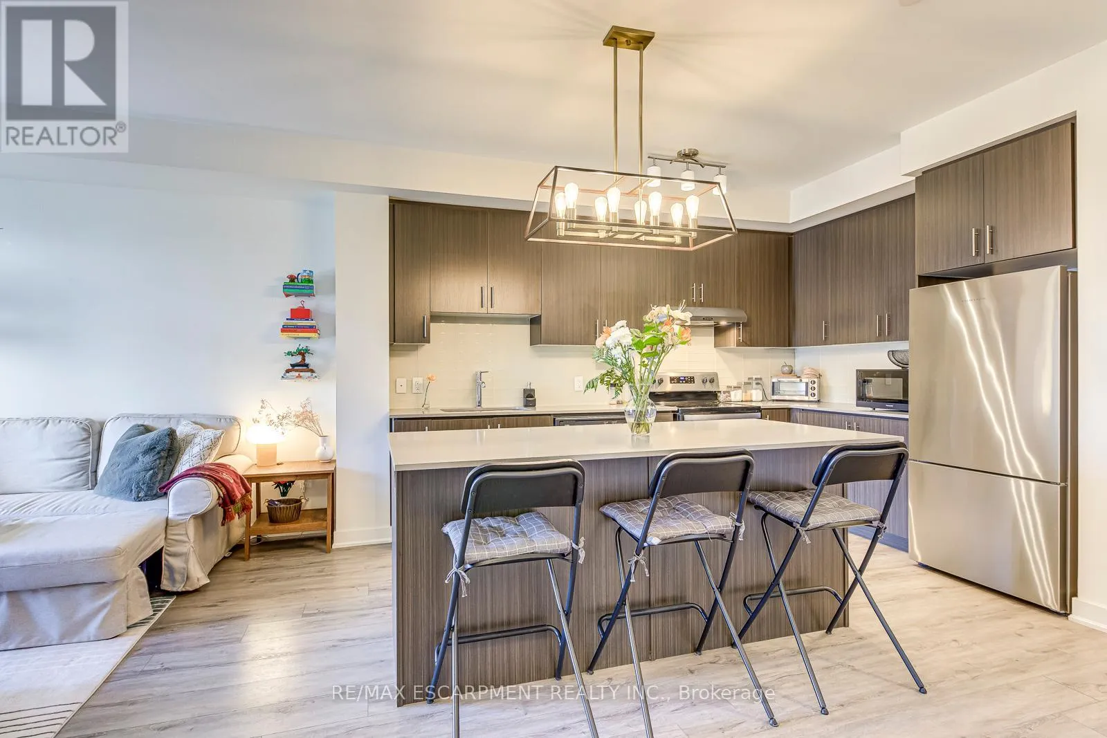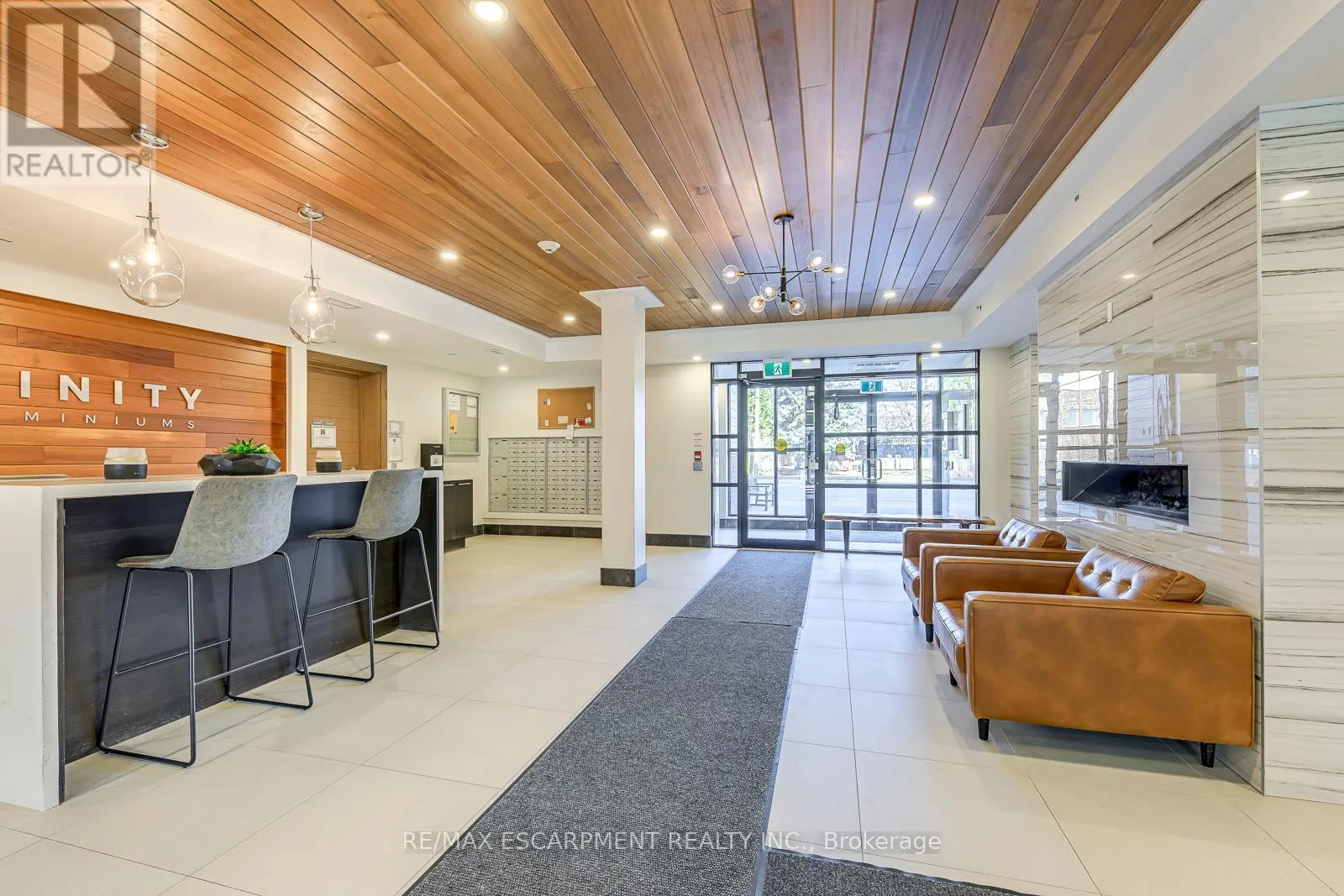 Plains Rd & Filmandale Rd Luxury living with breathtaking views at the Rosehaven built "Affinity" Condos! Experience modern elegance in this sun filled, bright and spacious 1 Bedroom + Den suite, beautifully appointed with premium laminate flooring and designer lighting throughout. The open-concept layout features a chef inspired kitchen with quartz counters, contemporary backsplash, large sink, and gorgeous island - truly an Entertainers delight. Enjoy morning coffee from your private balcony overlooking peaceful greenery, a true extension of living space. The primary bedroom includes a double door closet and boasts large windows, filling the space with natural light. The spa-inspired bathroom offers a built in vanity with plenty of storage and a beautifully tiled tub/shower combination for your relaxation. The versatile den provides ample space for a home office, hobby area, or reading nook-ideal for today's lifestyle. Residents enjoy award-winning amenities including a rooftop terrace with breathtaking views, fitness centre, party room, and much more. **EXTRAS** Premium Parking and Premium Locker included. Pride of ownership - this unit truly impresses! Prime Location with steps to shopping, schools, restaurants, transit, and minutes to highways and Aldershot GO. Location Location Location! (id:27476)