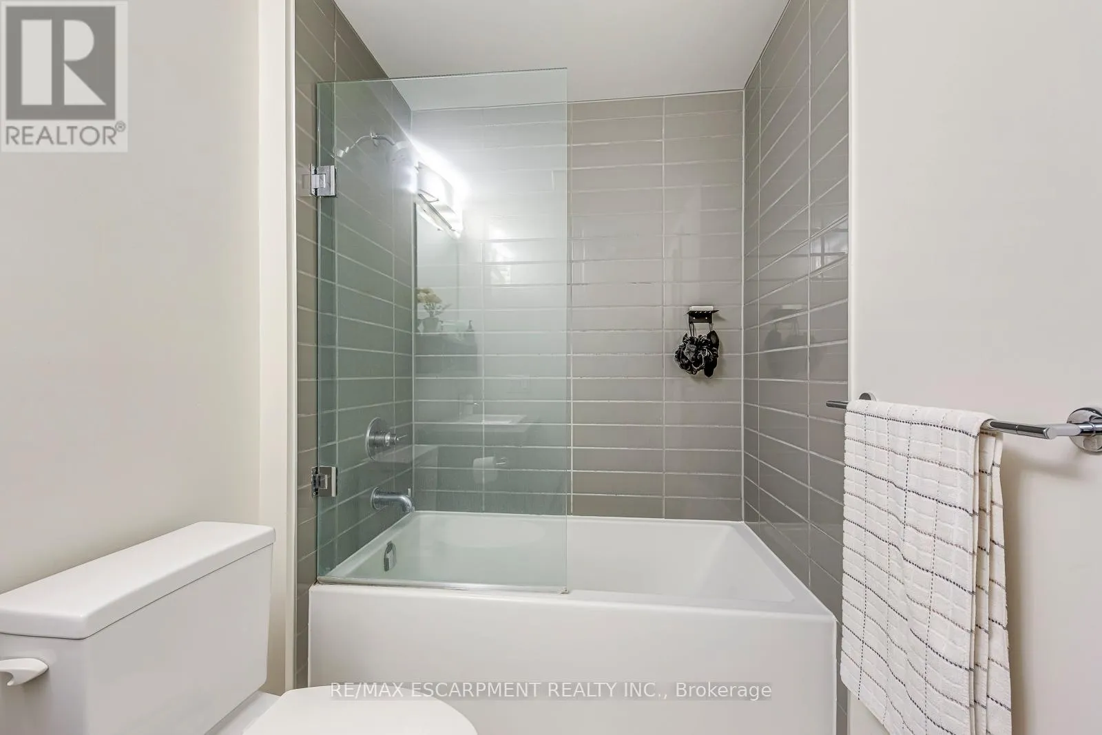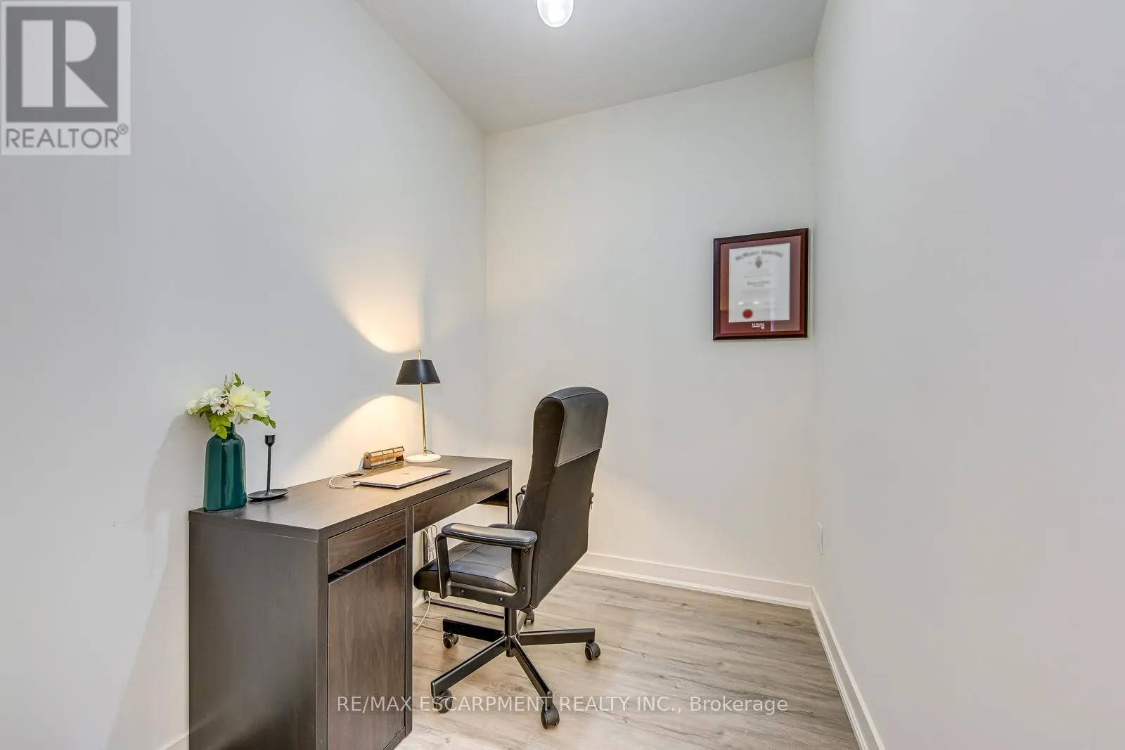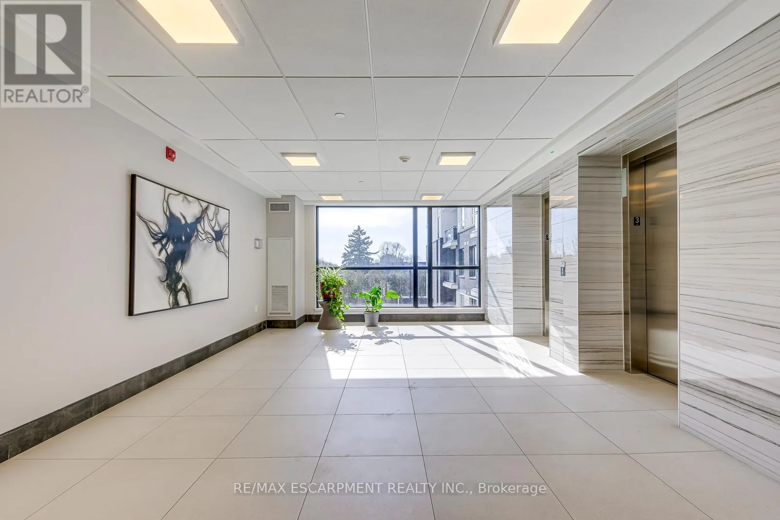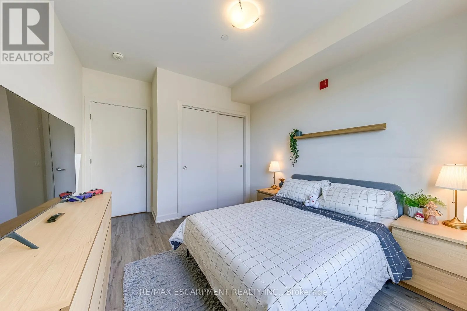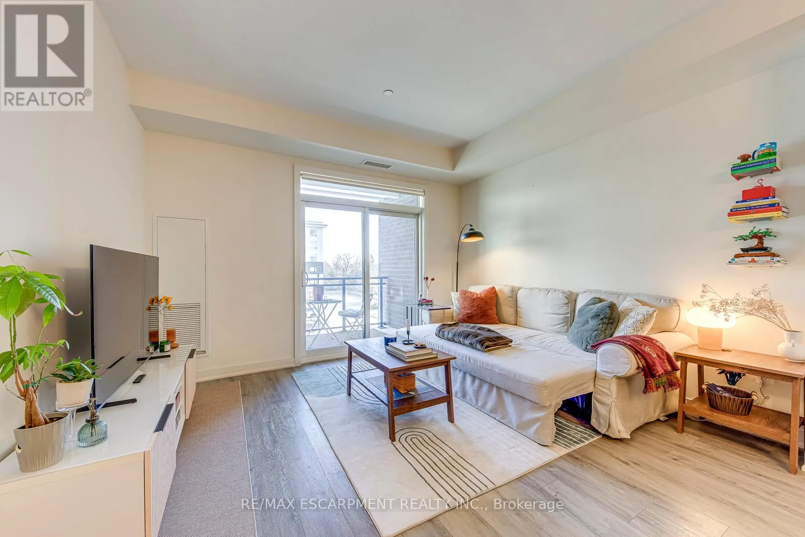 Plains Rd & Filmandale Rd Luxury living with breathtaking views at the Rosehaven built "Affinity" Condos! Experience modern elegance in this sun filled, bright and spacious 1 Bedroom + Den suite, beautifully appointed with premium laminate flooring and designer lighting throughout. The open-concept layout features a chef inspired kitchen with quartz counters, contemporary backsplash, large sink, and gorgeous island - truly an Entertainers delight. Enjoy morning coffee from your private balcony overlooking peaceful greenery, a true extension of living space. The primary bedroom includes a double door closet and boasts large windows, filling the space with natural light. The spa-inspired bathroom offers a built in vanity with plenty of storage and a beautifully tiled tub/shower combination for your relaxation. The versatile den provides ample space for a home office, hobby area, or reading nook-ideal for today's lifestyle. Residents enjoy award-winning amenities including a rooftop terrace with breathtaking views, fitness centre, party room, and much more. **EXTRAS** Premium Parking and Premium Locker included. Pride of ownership - this unit truly impresses! Prime Location with steps to shopping, schools, restaurants, transit, and minutes to highways and Aldershot GO. Location Location Location! (id:27476)