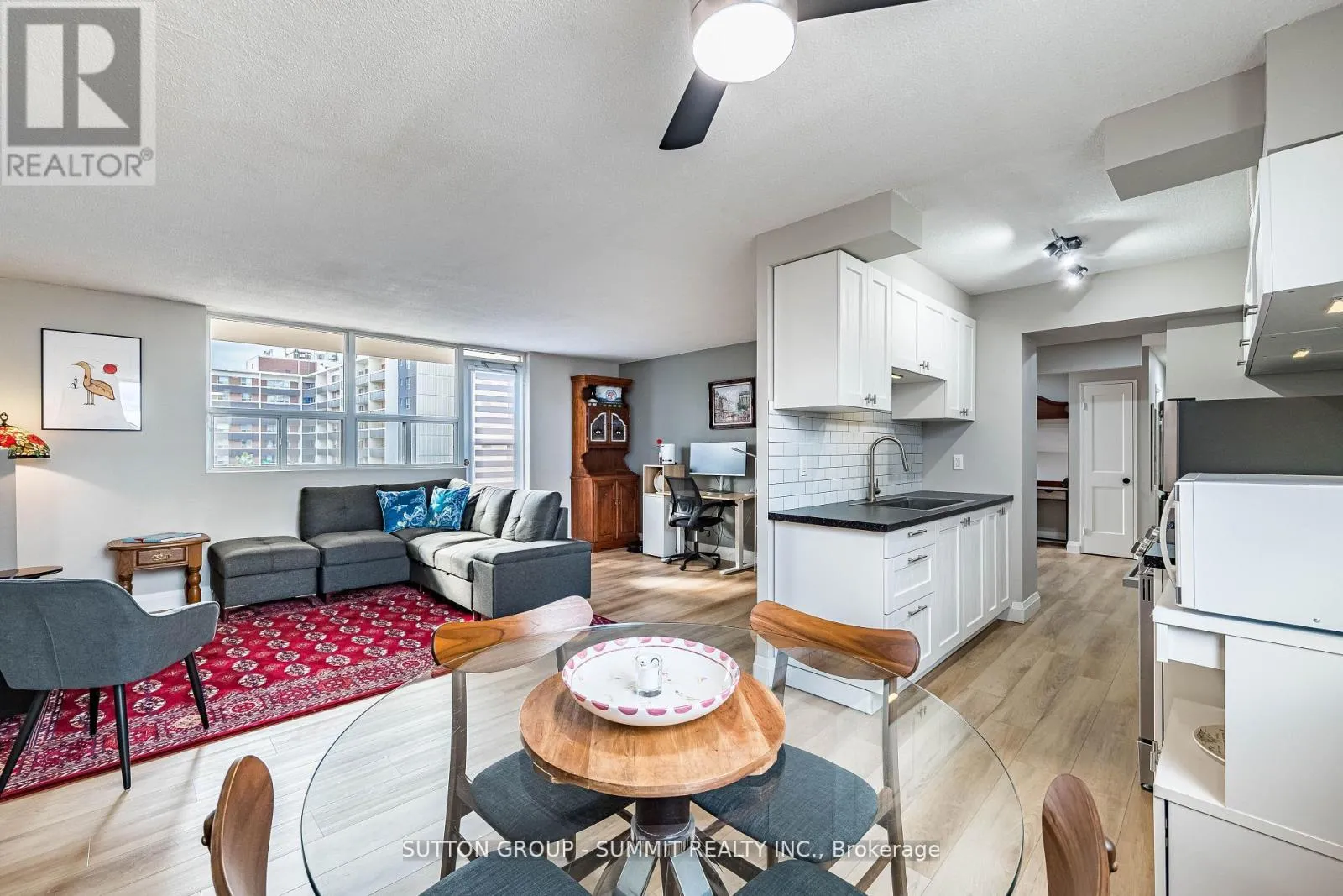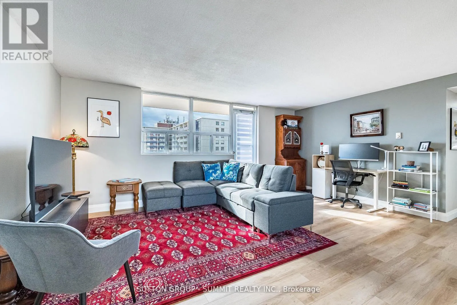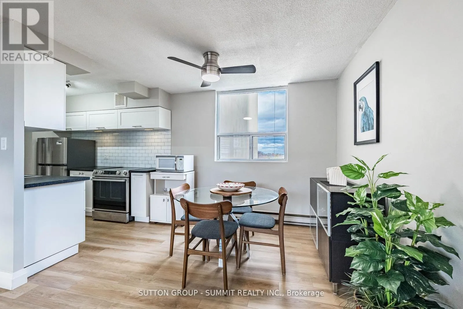 DYNES/PROSPECT Beautifully Renovated & Move-In Ready! Located in The Empress, one of Burlington's most sought-after condominium communities. This oversized 1-bedroom + den suite is the largestone-bedroom layout in the building, offering over 1,000 sq. ft. of bright, open living space with east and west exposures - perfect for enjoying both sunrise and sunset views. Completely renovated in 2023-2024, this suite features new flooring and baseboards throughout, freshly painted walls and ceilings, new doors, modern light fixtures, and ceiling fans. The custom kitchen shines with sleek cabinetry, extended counter space, and stainless steel appliances -ideal for cooking and entertaining. The updated bathroom offers a new tub, toilet, vanity, and elegant touch-light mirror for a spa-like feel. The bright living and dining area opens to a large private balcony, perfect for relaxing outdoors. The spacious bedroom includes two large double closets, while the versatile den is ideal for a home office. In-suite laundry and one underground parking space complete this exceptional home. Building Amenities include: 24-hour concierge, outdoor pool, fitness centre, sauna, party room, library, car wash bay, workshop, barbecues, EV charging station, and ample visitor parking. Enjoy comfort, security, and convenience just steps from shopping, dining, transit, and the Burlington Centre Mall. (id:27476)