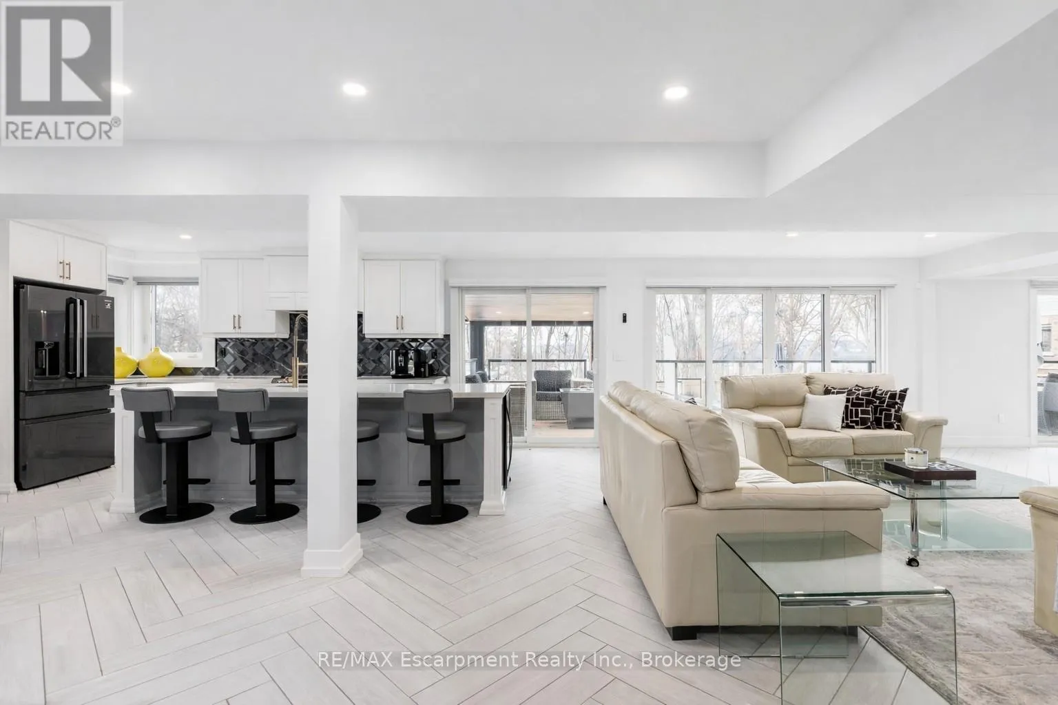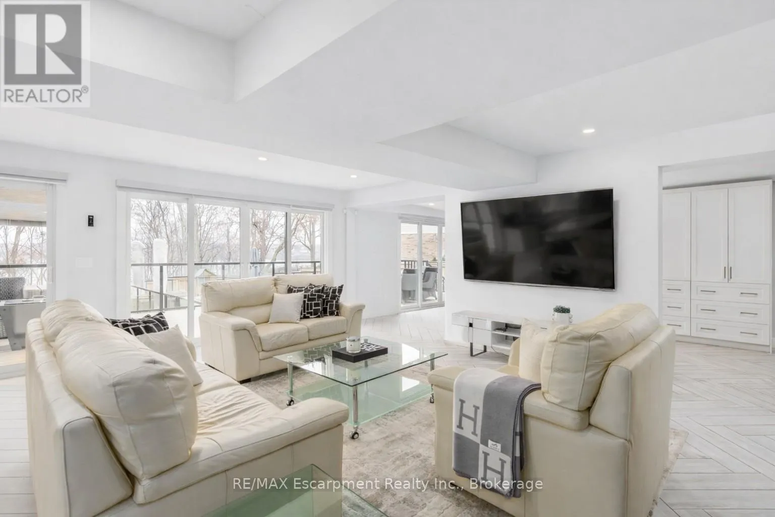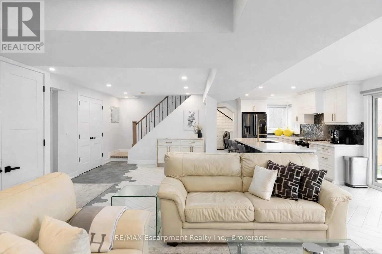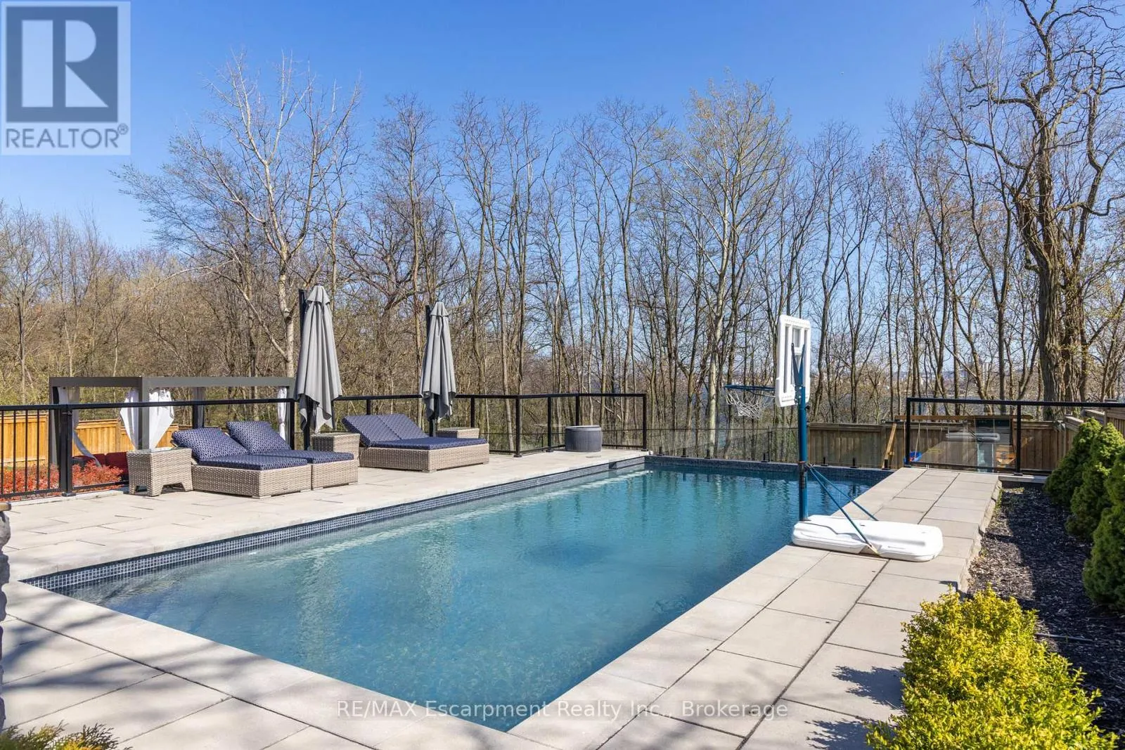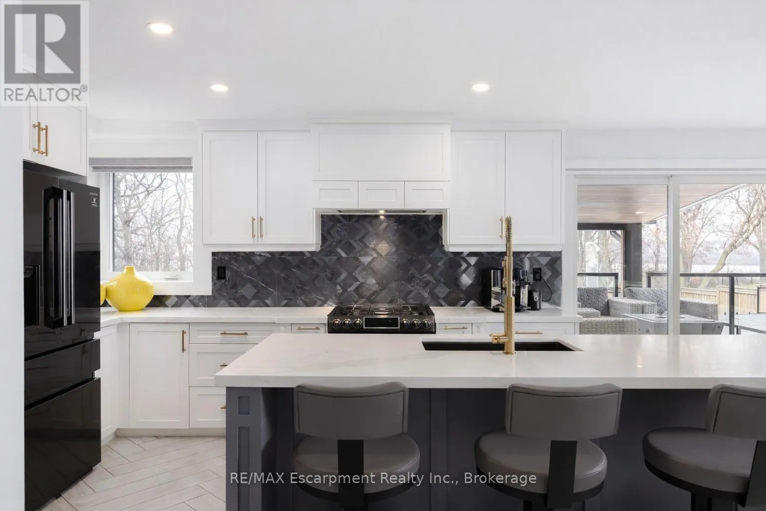 Cross Streets: SPRING GARDENS & PARKHILL. ** Directions: PLAINS RD W TO SPRING GARDENS RD TO TO PARKHILL RD TO BAYSHORE BLVD. Tucked at the end of a quiet cul-de-sac in Burlington's highly sought-after Aldershot community, this beautifully renovated (2019) home offers an exceptional lifestyle for families and downsizers alike. The sun-filled main floor features an open-concept layout, seamlessly connecting the spacious kitchen with centre island, living room, and formal dining area-all framed by stunning bay views. Floor-to-ceiling windows flood the space with natural light while showcasing picturesque vistas of Burlington Bay and surrounding greenspace. This level also includes a convenient main floor bedroom, laundry room, versatile office, and a stylish 3-piece bath. Upstairs, you'll find three generous bedrooms, including a serene primary retreat complete with a spa-inspired ensuite featuring a soaker tub and skylights. Ideal for multi-generational living, the fully finished lower level offers a secondary kitchen, comfortable living area, 3-piece bath, and a fifth bedroom-perfect for in-laws or a nanny suite-with a walk-up to the backyard. Step outside to a professionally landscaped oasis designed for entertaining, featuring a covered upper porch, spacious dining area, in-ground concrete pool, and a lower-level fire pit lounge. Conveniently located minutes from shopping, top-rated schools, highways, Aldershot GO Station, Royal Botanical Gardens, and golf courses. A rare opportunity to own a turnkey home that blends modern living with nature and tranquility. (id:27476)