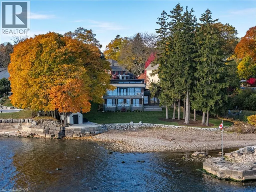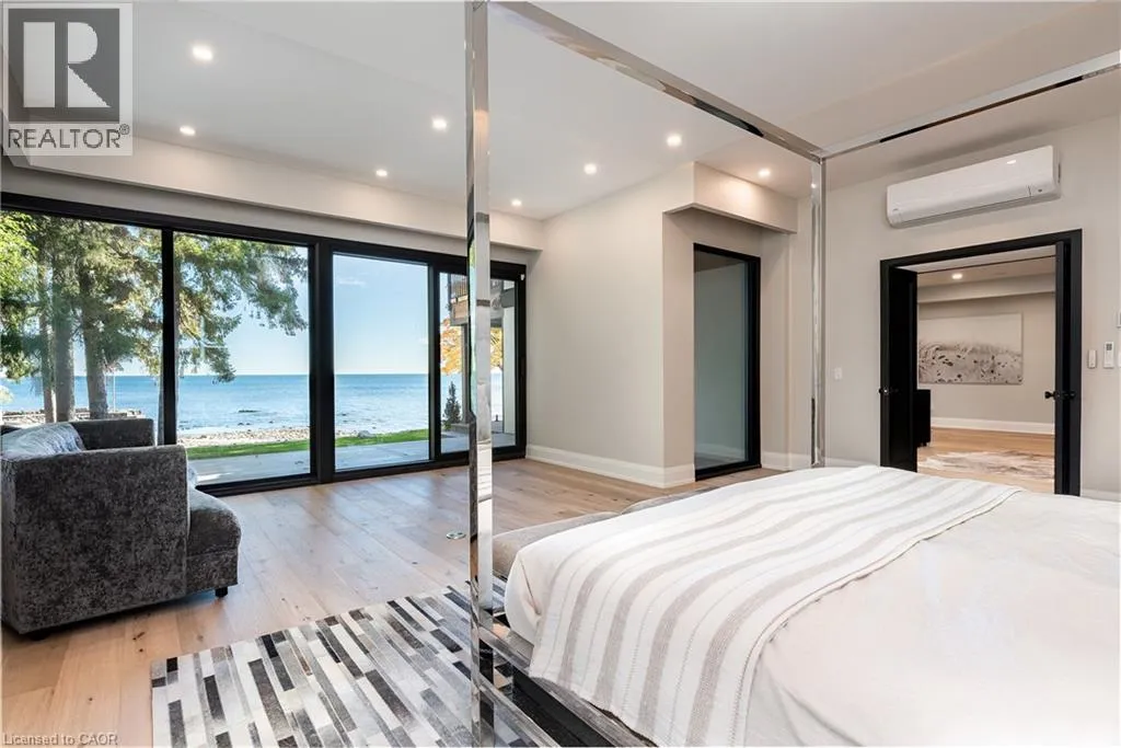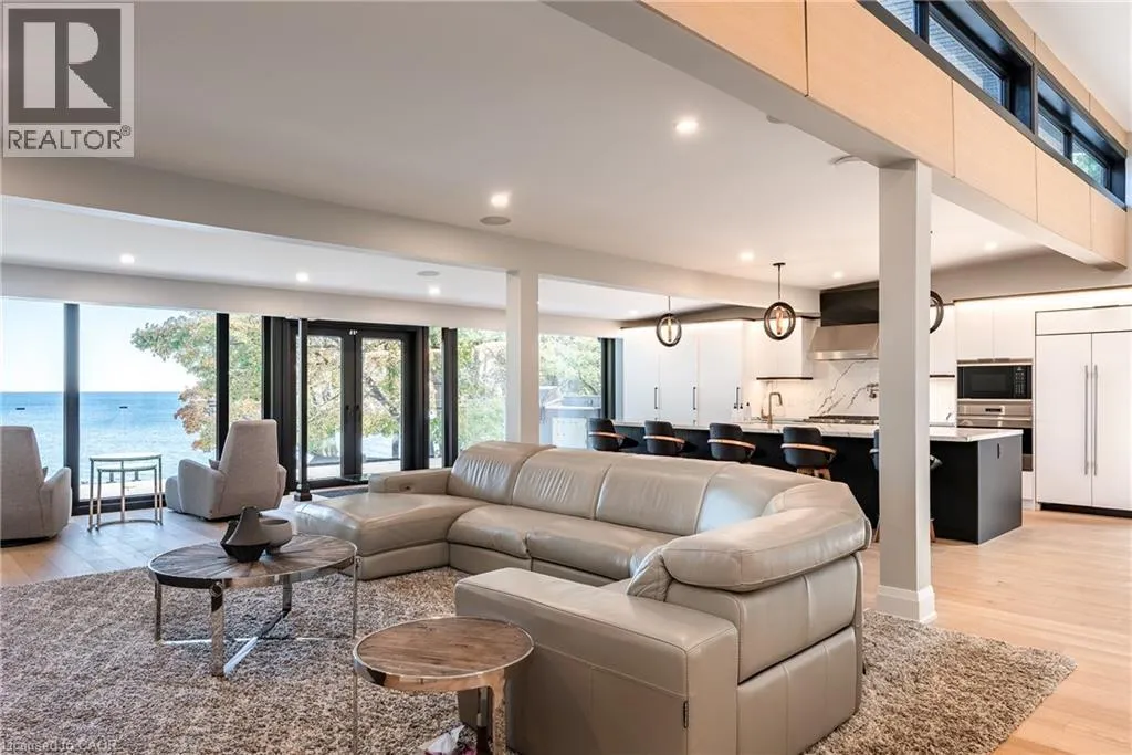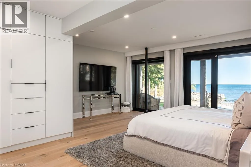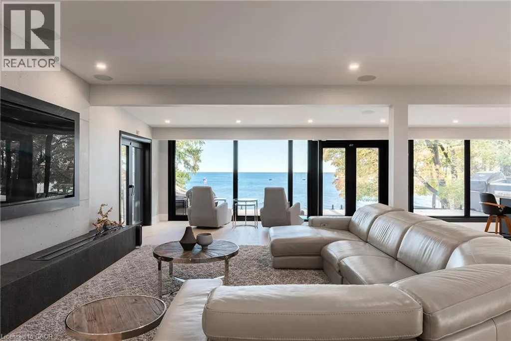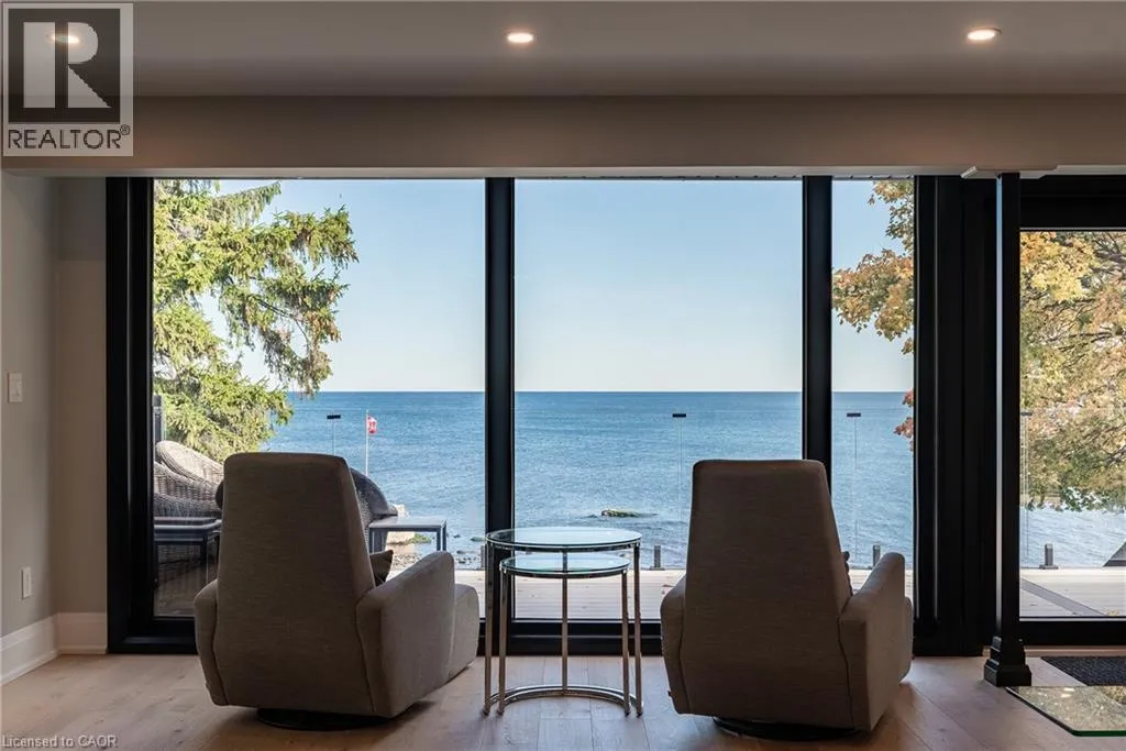 Lakeshore/Edgecliffe Natural serenity meets modern design at 121 Edgecliffe Place. Set on a rare 29,000 sq. ft. pie-shaped lakefront lot where Appleby Creek meets Lake Ontario, this exceptional property offers 105 feet of direct waterfront and 130 feet along the creek with riparian rights, creating an irreplaceable natural setting in the city. This fully renovated home offers over 5,200 sq. ft. of finished living space with floor-to-ceiling windows that draw the lake and landscape into every room. The open-concept main level features 12-foot peaked ceilings, engineered light hardwood, and dark-framed windows that frame panoramic southern views. A chefâs kitchen anchors the space with a large island and top-tier appliances, ideal for entertaining. The walkout lower level accommodates four bedrooms, each with its own ensuite and ductless air conditioning unit. The primary suite opens directly to the lakeside deck, featuring a spa-inspired ensuite with dual rain showers and a massive walk-in closet with custom cabinetry. Radiant in-floor heating extends throughout the home for year-round comfort. Multiple outdoor living spaces blur the line between indoors and out. A covered lower deck and expansive upper terrace with built-in BBQ maximize lakefront enjoyment and capture the homeâs stunning setting. Modern. Peaceful. One of a kind on the water. (id:27476)