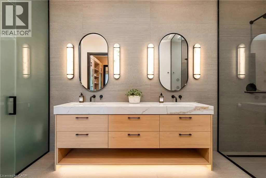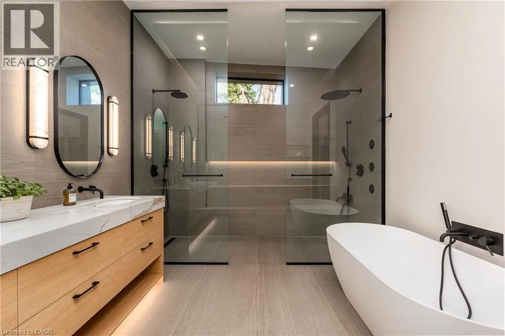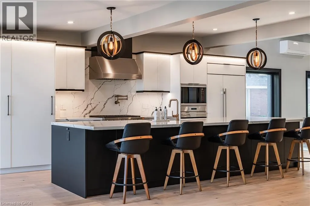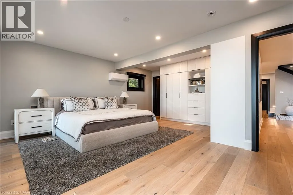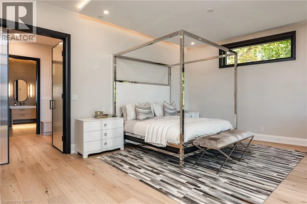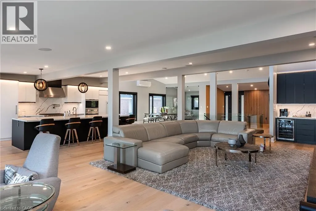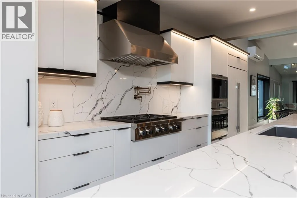 Lakeshore/Edgecliffe Natural serenity meets modern design at 121 Edgecliffe Place. Set on a rare 29,000 sq. ft. pie-shaped lakefront lot where Appleby Creek meets Lake Ontario, this exceptional property offers 105 feet of direct waterfront and 130 feet along the creek with riparian rights, creating an irreplaceable natural setting in the city. This fully renovated home offers over 5,200 sq. ft. of finished living space with floor-to-ceiling windows that draw the lake and landscape into every room. The open-concept main level features 12-foot peaked ceilings, engineered light hardwood, and dark-framed windows that frame panoramic southern views. A chefâs kitchen anchors the space with a large island and top-tier appliances, ideal for entertaining. The walkout lower level accommodates four bedrooms, each with its own ensuite and ductless air conditioning unit. The primary suite opens directly to the lakeside deck, featuring a spa-inspired ensuite with dual rain showers and a massive walk-in closet with custom cabinetry. Radiant in-floor heating extends throughout the home for year-round comfort. Multiple outdoor living spaces blur the line between indoors and out. A covered lower deck and expansive upper terrace with built-in BBQ maximize lakefront enjoyment and capture the homeâs stunning setting. Modern. Peaceful. One of a kind on the water. (id:27476)