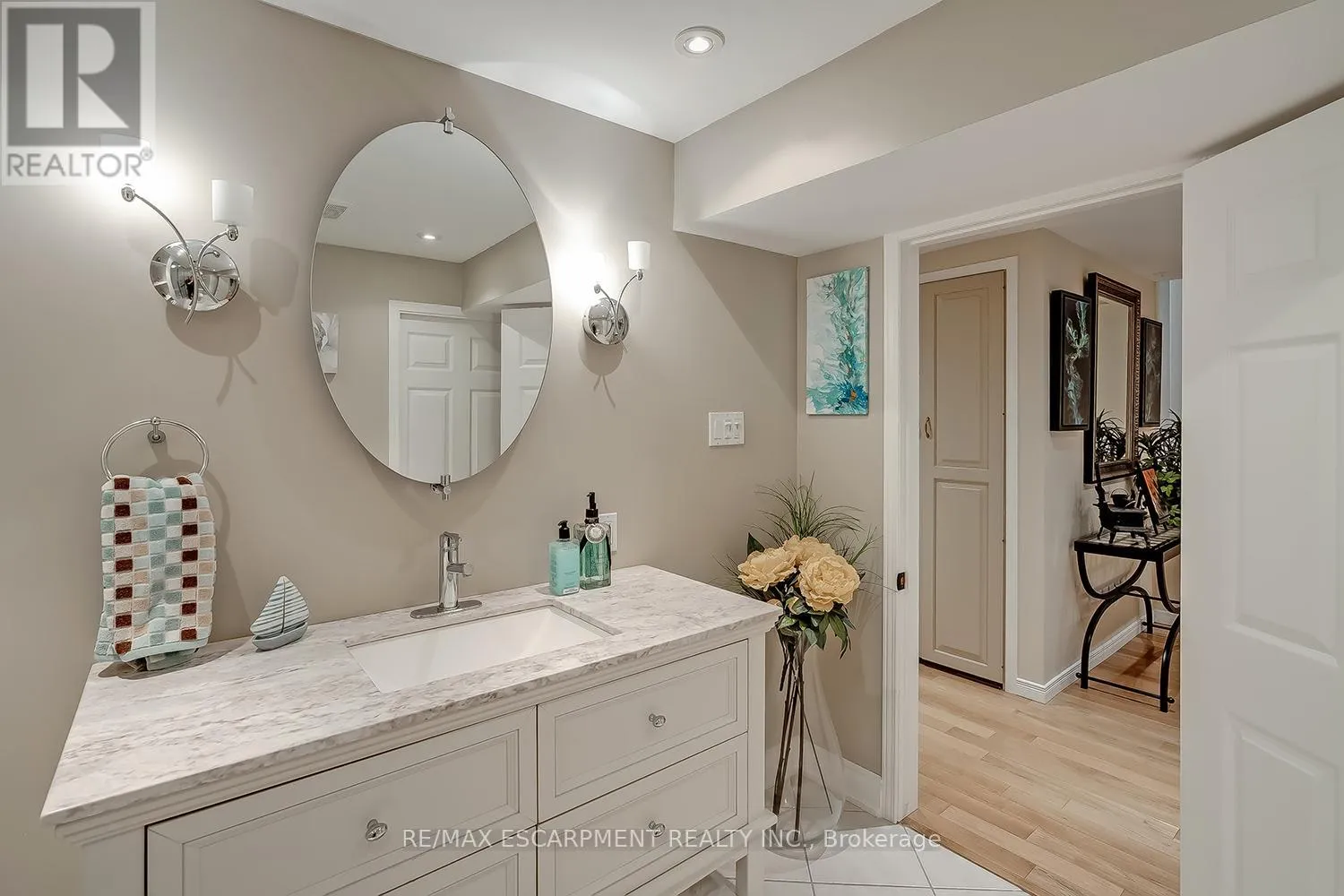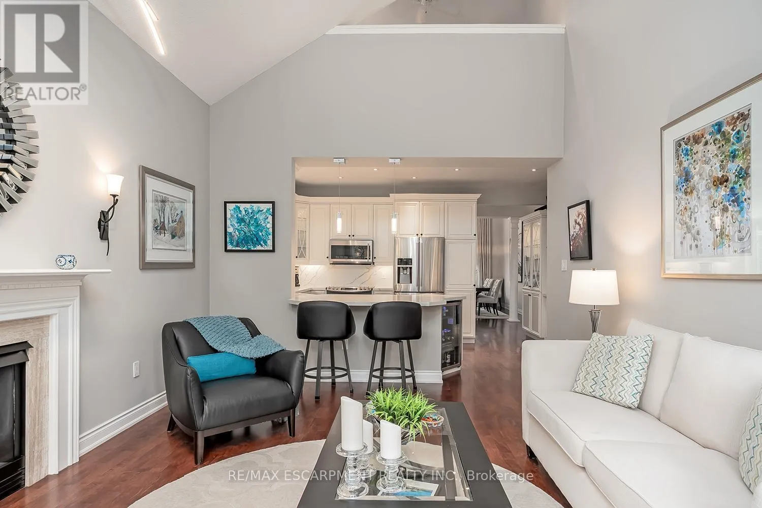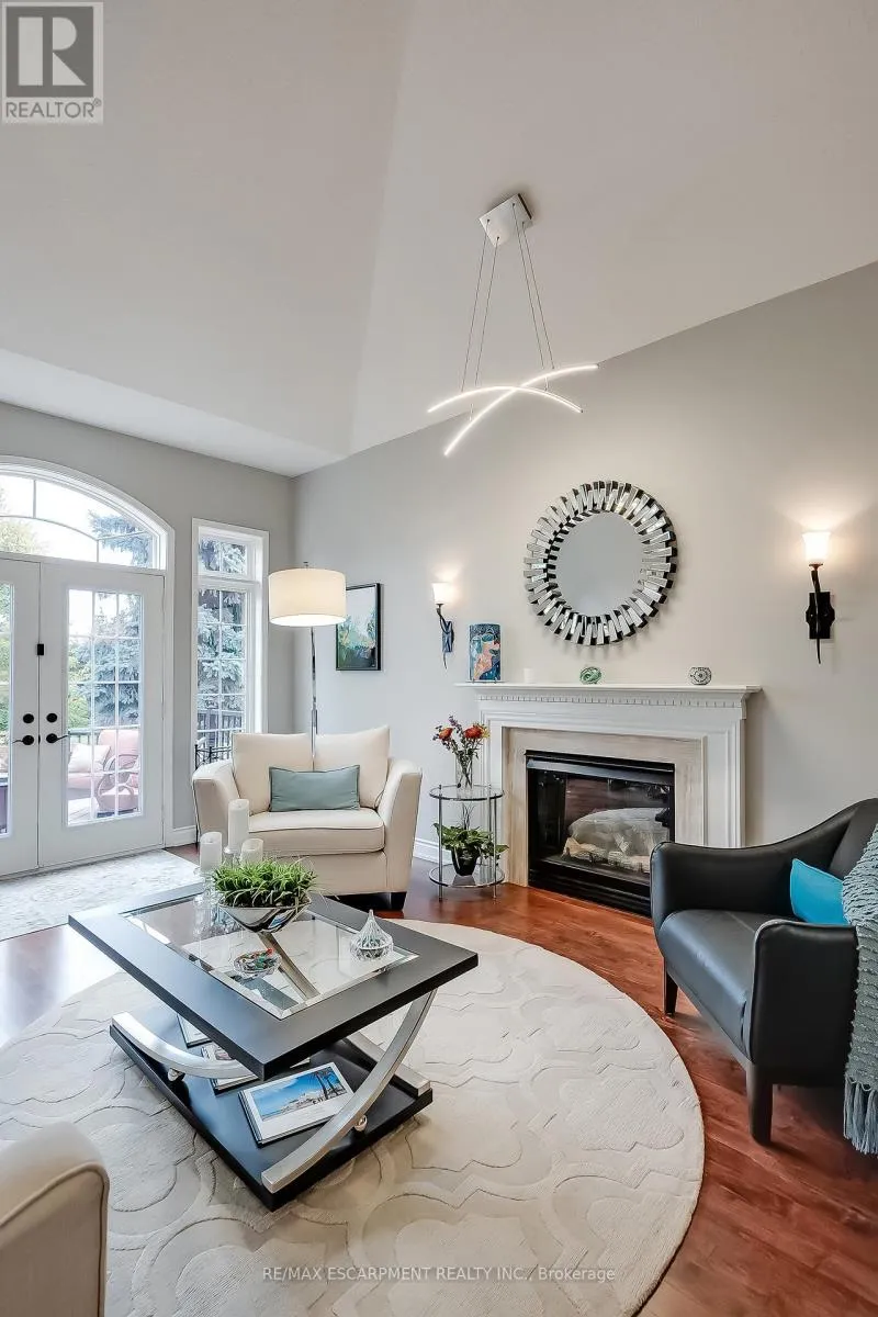 Appleby Line & Taywood Dr This COMPLETELY renovated / redesigned semi-detached BUNGALOFT backs onto the Millcroft Golf Course and has a DOUBLE car garage! Sitting in a quiet, boutique enclave, this home features 2 bedrooms, 3.5 bathrooms and quality designer finishes and fixtures throughout. This unit is approximately 1800 square feet PLUS a fully finished lower level. The open concept floorplan boasts 9-foot ceilings, hardwood flooring and plenty of natural light. The dramatic two-storey entry leads to an oversized dining room. The kitchen features custom white cabinetry, a large peninsula, quartz counters and stainless-steel appliances. The kitchen flows directly to the large family room- which includes vaulted ceilings, a gas fireplace and double doors leading to the low maintenance backyard overlooking the golf course. The large primary bedroom has a stunning 3-piece ensuite and a large walk-in closet. The main level also includes a separate powder room, laundry room and garage access! The 2nd level includes a large bedroom, den / loft and a 4-piece bathroom! The finished lower level features hardwood flooring, a large rec room with a gas fireplace, custom built-ins, wet bar, office, den, 3-piece bathroom and a cedar closet! The exterior of the home has been extensively landscaped and features a 2-tier composite deck, motorized awning and large stone patio. There is a PRIVATE double car driveway with parking for 4 vehicles plus a double car garage. (id:27476)
