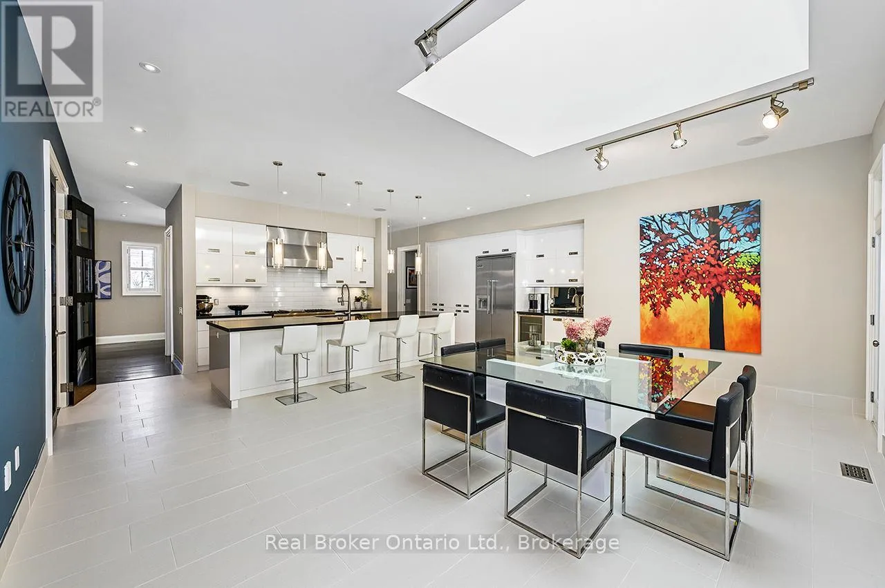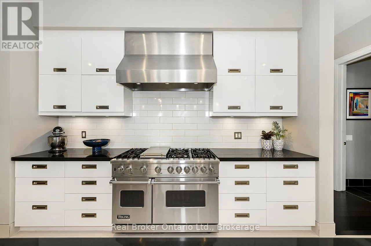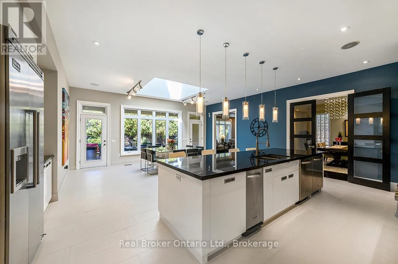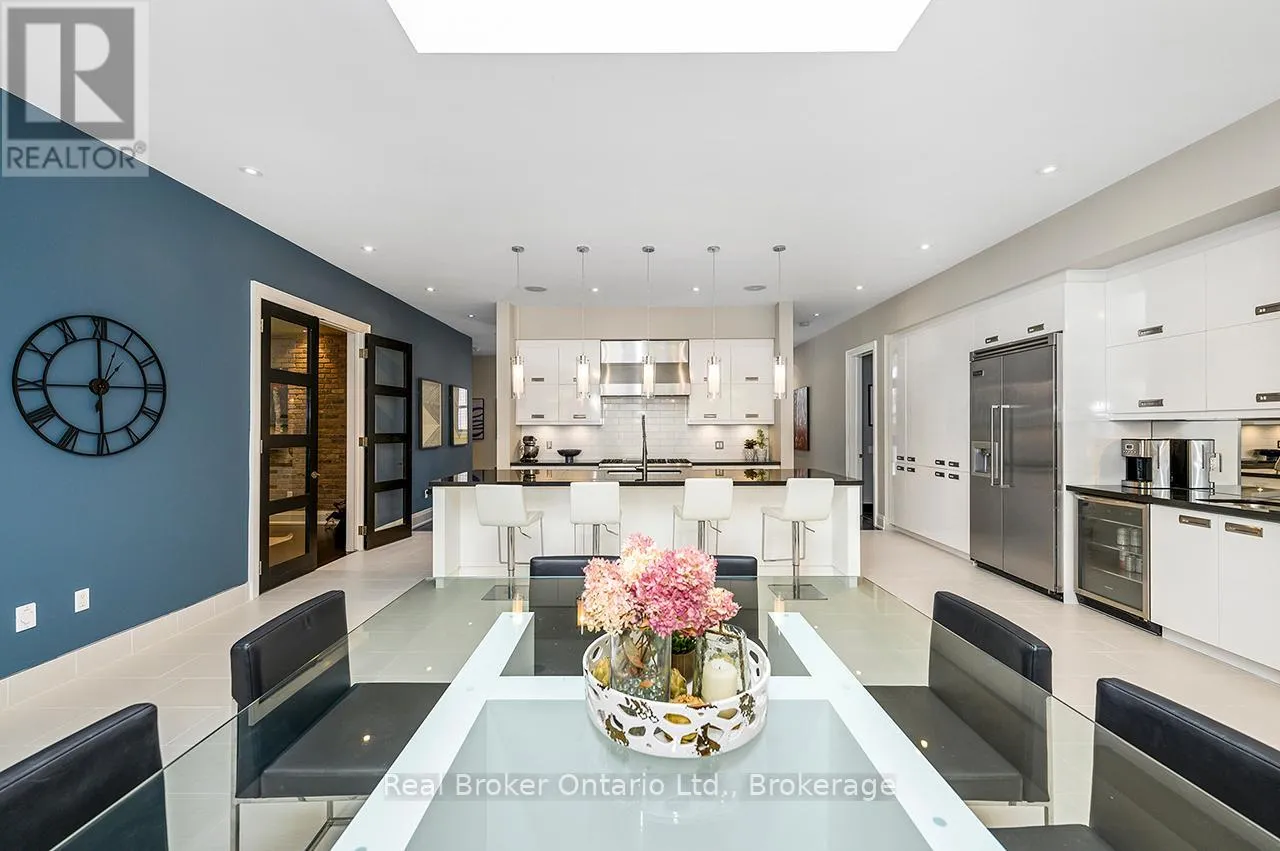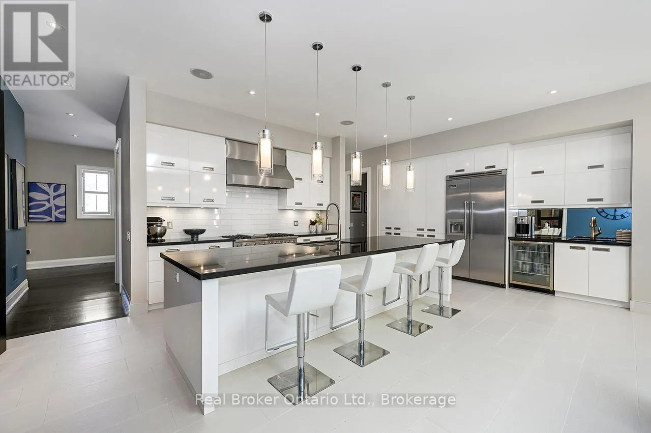 Cross Streets: Lakeshore Rd. and Appleby Line. ** Directions: Appleby line south to Lakeshore rd. Stunning modern elegance in this custom-built home offering over 7,300 sq. ft. of impeccable quality. The designer kitchen features top-of-theline Viking stainless steel appliances, white high-gloss cabinetry, and a 14-ft granite island with S.S. sink and custom faucet, flowing into a bright breakfast area with a massive skylight, multiple windows, and walkout to a covered porch with built-in BBQ and grill. A separate dining room with a light brick accent wall opens to the living/family room with gas fireplace, wall-mounted TV, pot lights, and built-in speakers. The main floor primary retreat offers access to an outdoor hot tub, a spa-like 6-piece ensuite with heated floors, jacuzzi tub, oversized shower, separate water closet, a dedicated dressing room, and convenient main floor laundry. Upstairs, two large bedrooms each feature their own 3-piece ensuites and ample closet storage, plus a barrel-vault family room perfect for kids or guests, with a rough-in for laundry. The lower level includes two additional bedrooms, a washroom, large gym, temperature-controlled wine cellar, recreation room with bar and tasting area, gas fireplace, and a dedicated games room. The epoxy-finished oversized 2-car garage is ideal for car enthusiasts! Complete with a security system (including exterior security cameras), a private fenced yard with mature gardens and in-ground sprinkler system, ample parking, and perfectly located just steps to the lake, close to schools, shopping, and minutes to the GO. Estates like this don't hit the market often in the prestigious Shoreacres neighbourhood! (id:27476)
