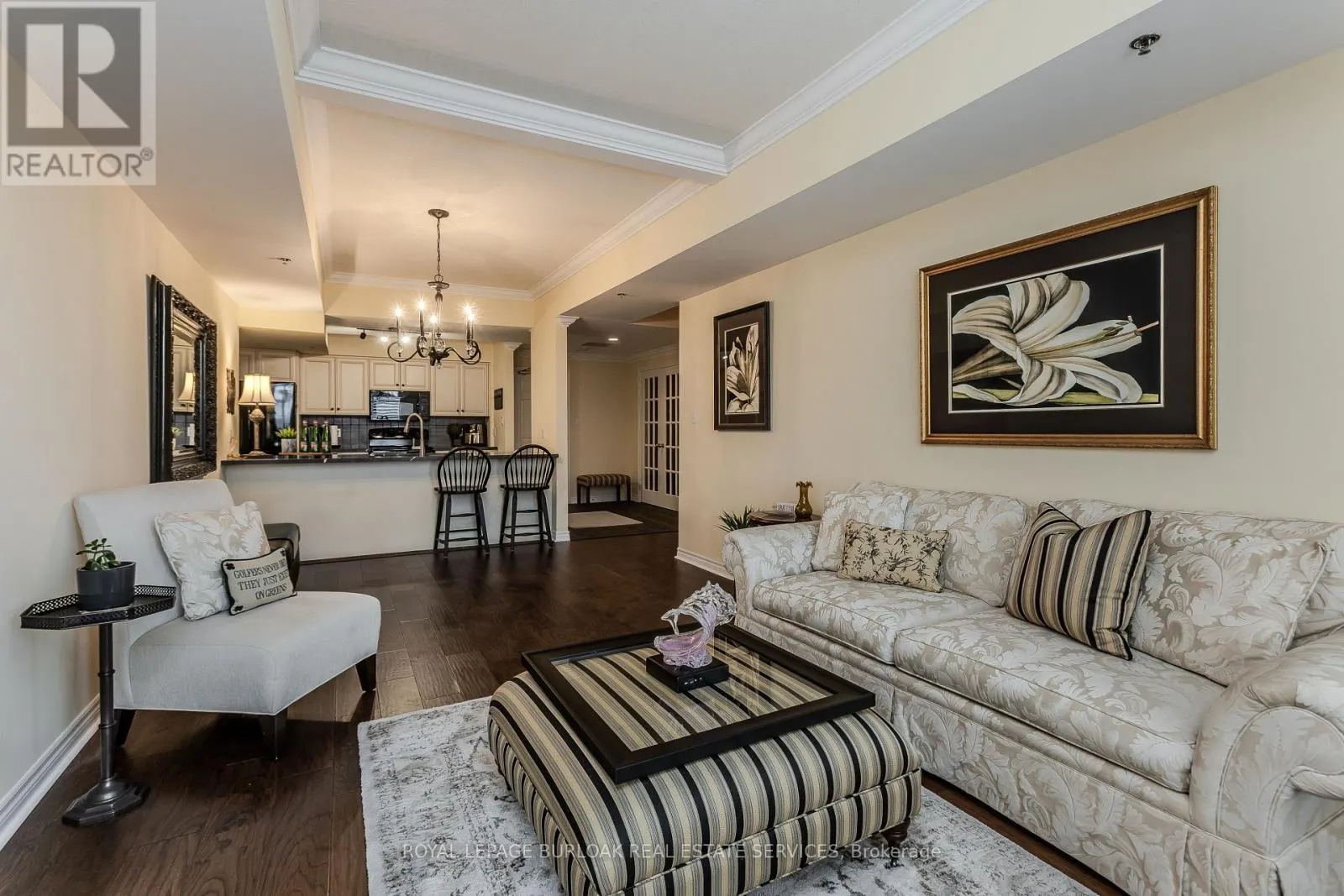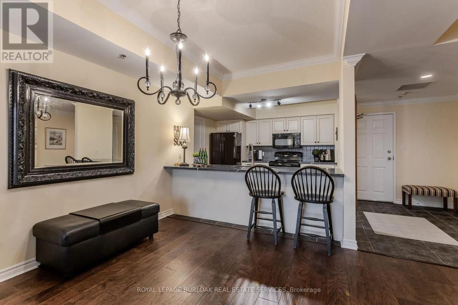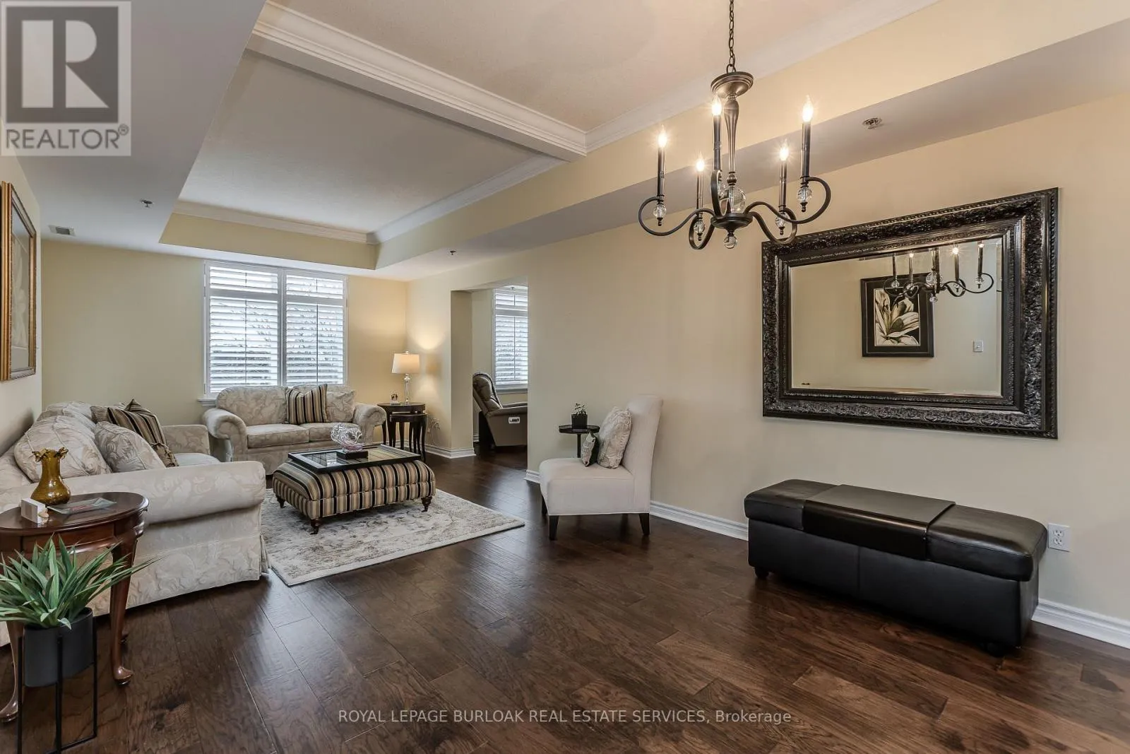 Plains Rd E & King Rd Welcome to this beautifully designed condo in The Dovercourt, a well-maintained low-rise building nestled in the sought-after Aldershot community. Offering one of the larger custom layouts in the building, this customized suite blends space, functionality, and style in a prime location-just mins to the GO Station, QEW, Royal Botanical Gardens, Burlington Golf & Country Club, and everyday amenities. Step inside to discover a bright and inviting open-concept layout, with hardwood flooring throughout the main living areas. The kitchen is a true focal point, featuring quartz countertops, an oversized breakfast bar perfect for casual dining or gathering with guests, a stylish tile backsplash, black stainless steel appliances, and ample cabinetry to meet all your storage needs. Overlooking the main living space, it connects beautifully to the dining and living areas. The spacious living room is filled with natural light and showcases a tray ceiling with a beam accent, along with walkout access to a private balcony. A versatile den offers the potential to convert into an additional bedroom, while a separate home office with French doors provides the ideal work-from-home setup. The primary bedroom is generously sized and designed as a private retreat, complete with dual closets and a well-appointed 3-piece ensuite featuring an oversized granite vanity and a walk-in shower. A second bedroom also offers direct access to the balcony, creating a bright and airy space for family or guests. A 4-piece main bathroom adds further convenience. Additional features include a storage locker and two parking spaces-one underground and one surface. Residents enjoy access to a party/media room within this well-managed building. This is a rare opportunity to own a spacious, move-in-ready condo with a flexible layout in one of Burlington's most convenient and connected locations-perfect for professionals, downsizers, or those seeking low-maintenance living without compromising on space. (id:27476)