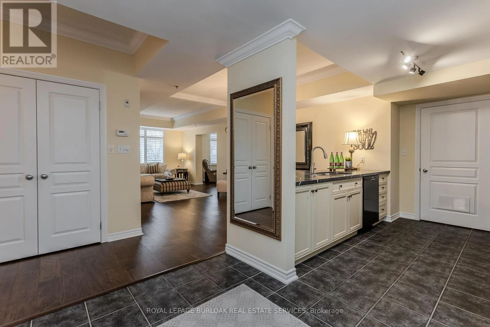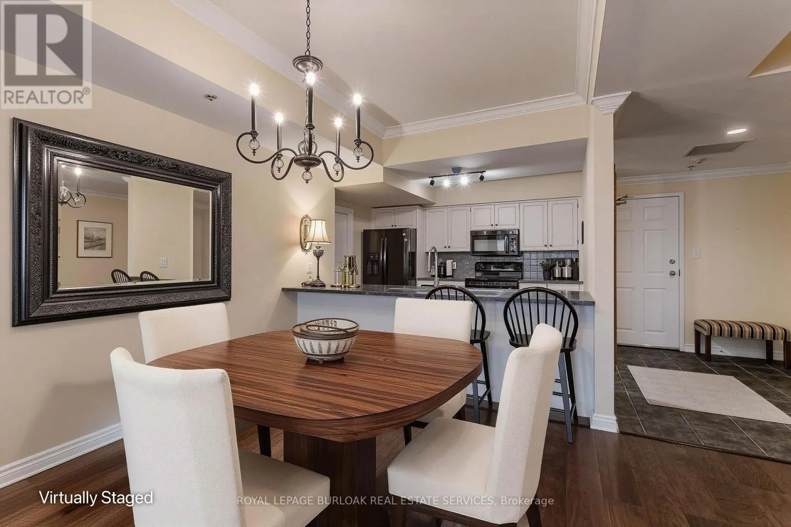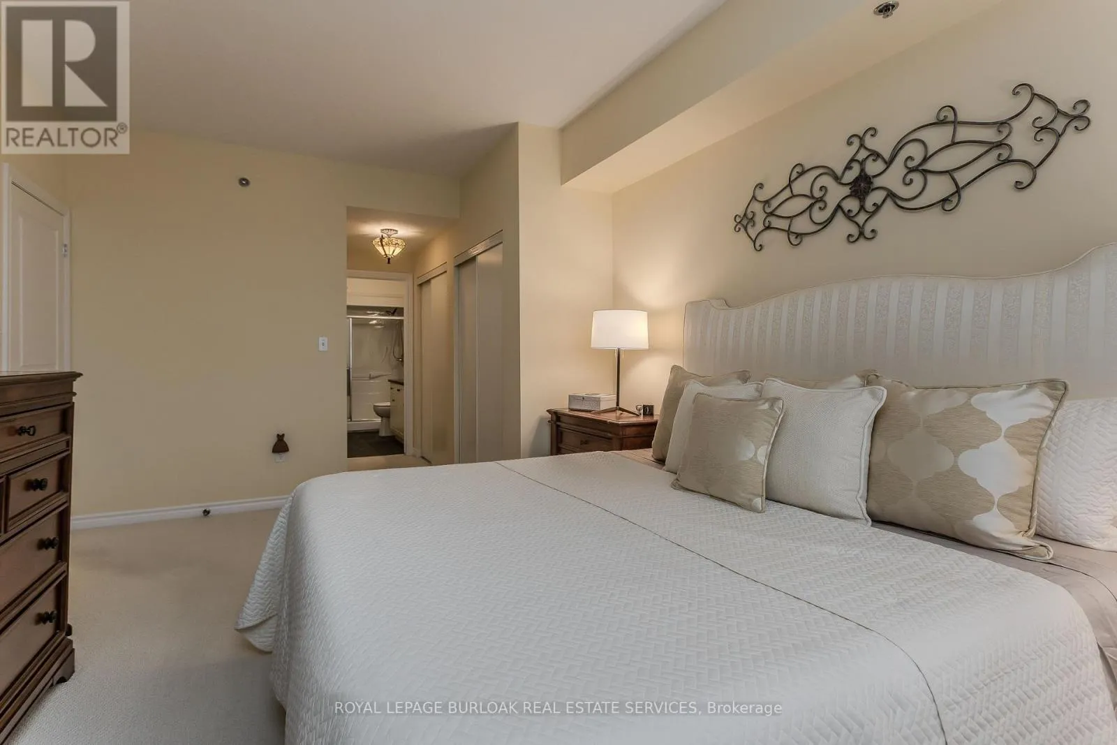 Plains Rd E & King Rd Welcome to this beautifully designed condo in The Dovercourt, a well-maintained low-rise building nestled in the sought-after Aldershot community. Offering one of the larger custom layouts in the building, this customized suite blends space, functionality, and style in a prime location-just mins to the GO Station, QEW, Royal Botanical Gardens, Burlington Golf & Country Club, and everyday amenities. Step inside to discover a bright and inviting open-concept layout, with hardwood flooring throughout the main living areas. The kitchen is a true focal point, featuring quartz countertops, an oversized breakfast bar perfect for casual dining or gathering with guests, a stylish tile backsplash, black stainless steel appliances, and ample cabinetry to meet all your storage needs. Overlooking the main living space, it connects beautifully to the dining and living areas. The spacious living room is filled with natural light and showcases a tray ceiling with a beam accent, along with walkout access to a private balcony. A versatile den offers the potential to convert into an additional bedroom, while a separate home office with French doors provides the ideal work-from-home setup. The primary bedroom is generously sized and designed as a private retreat, complete with dual closets and a well-appointed 3-piece ensuite featuring an oversized granite vanity and a walk-in shower. A second bedroom also offers direct access to the balcony, creating a bright and airy space for family or guests. A 4-piece main bathroom adds further convenience. Additional features include a storage locker and two parking spaces-one underground and one surface. Residents enjoy access to a party/media room within this well-managed building. This is a rare opportunity to own a spacious, move-in-ready condo with a flexible layout in one of Burlington's most convenient and connected locations-perfect for professionals, downsizers, or those seeking low-maintenance living without compromising on space. (id:27476)