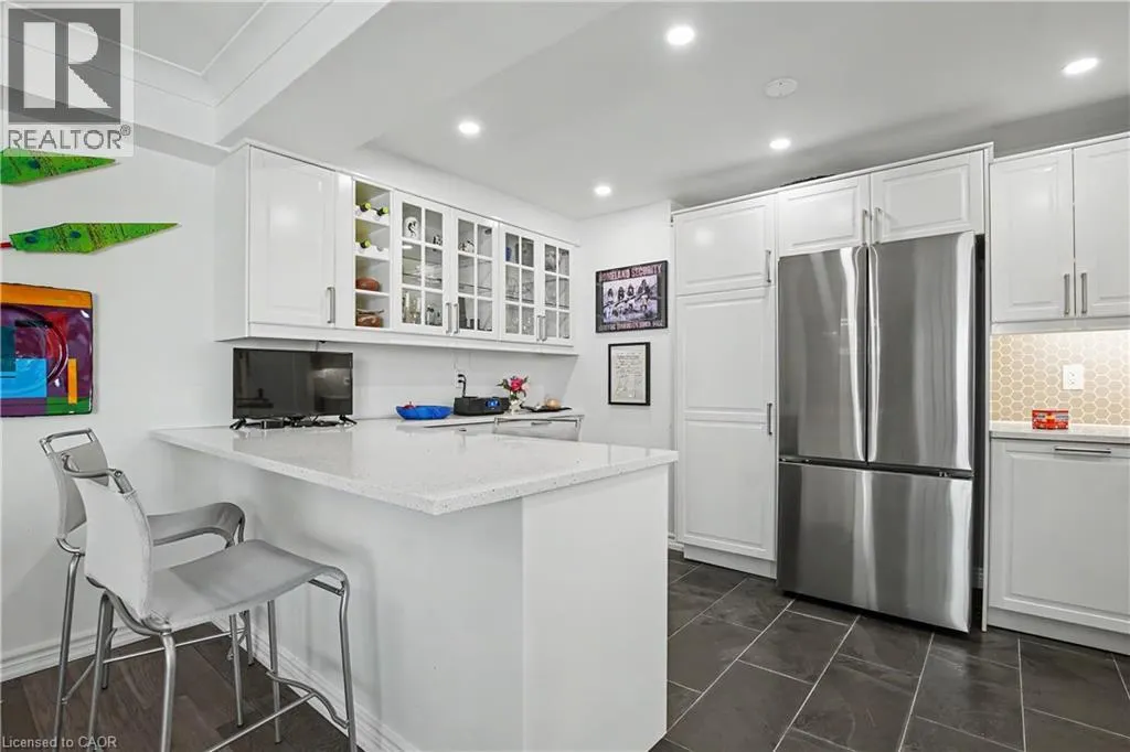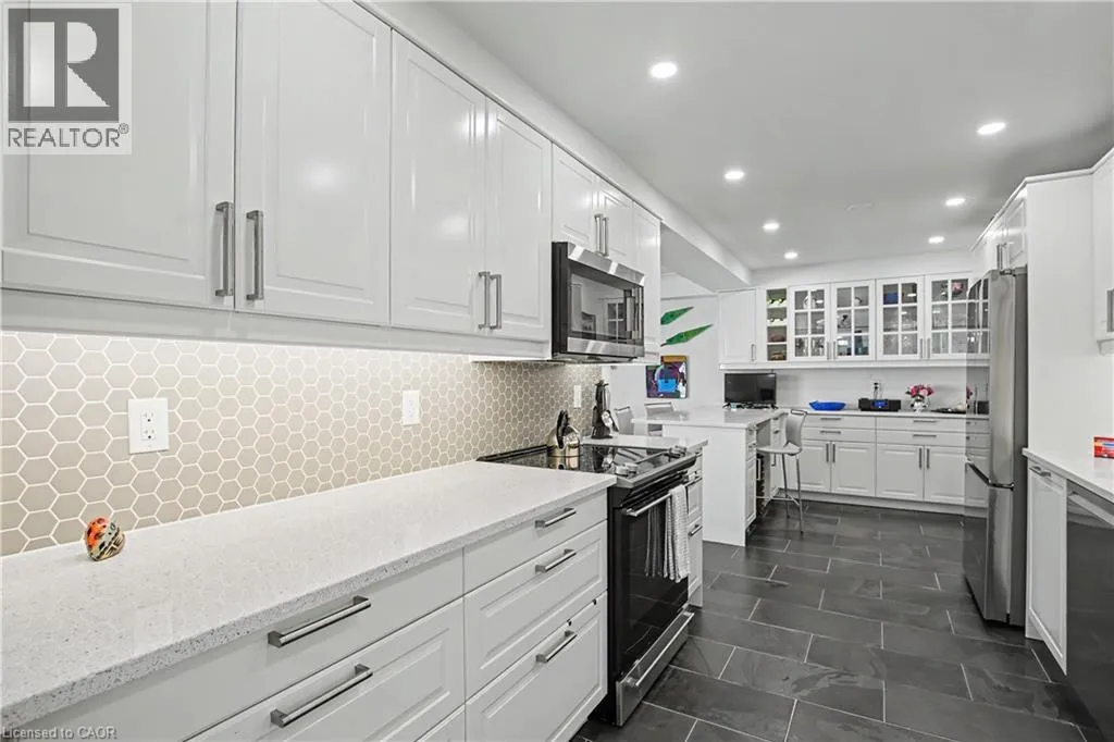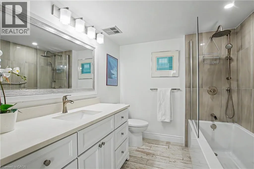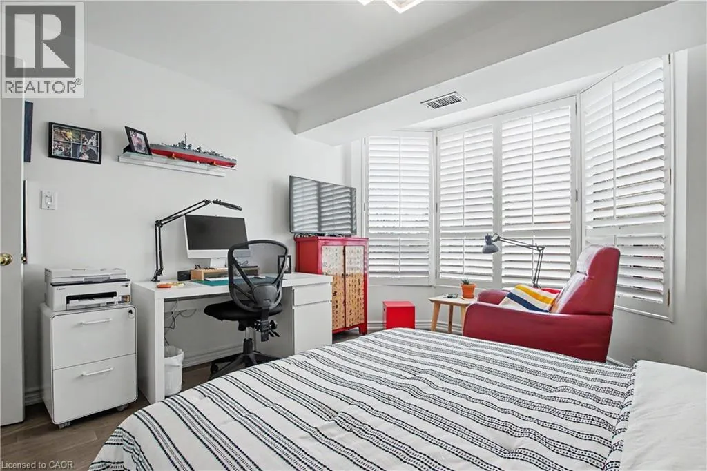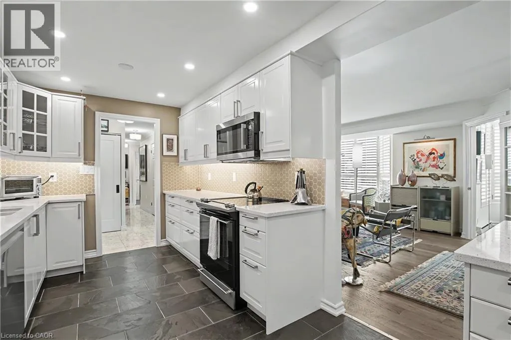 Brant Street to Lakeshore Rd, East of Martha St Ideally located steps from Burlingtonâs vibrant downtown. 2121 Lakeshore Road, 'Village Gate', is an exclusive boutique condominium with just 39 units. A well-managed and meticulously maintained building offering a welcoming lobby with intercom and hands-free entry. Welcome to SUITE 405 a fully renovated 2-bedroom, 2 bath plus Den. The galley-style kitchen with breakfast bar is open to the dining room. Features include: white cabinetry offering abundant storage, glass display cabinets, quartz countertops, stylish backsplash, stainless steel appliances, pot lights, and slate flooring. The open-concept living, dining, and den are bright and inviting, highlighted by bay windows, California shutters, smooth ceilings and engineered hardwood flooring. Thoughtfully curated and full of character., each space flows seamlessly into the next, creating an inviting atmosphere that feels both stylish and personal. The result is a warm, gallery-like setting that celebrates creativity while maintaining comfort and functionality. The Spacious Principal Bedroom includes a bay window, engineered hardwood flooring, California shutters, and a walk-in closet, along with a private 4-piece Ensuite featuring an updated vanity and tub/shower combination. The second bedroom also features a bay window and engineered hardwood flooring. A 3-piece main bath offers a glass-enclosed shower and vanity. Laundry w/stacking washer & dryer and additional storage space. Neutral paint, Smooth Ceilings throughout, Engineered Hardwood flooring, Linen Closet, Utility Closet. 1 Parking and 1 Locker. The outdoor spaces beautifully landscaped with benches to relax and enjoy the gardens and fresh air. Steps to downtown shops, cafes waterfront, arts, Hospital, grocery, malls, GO, local transit and so much more. Welcome Home to Unit 405 - 2121 Lakeshore Road, Burlington. (id:27476)
