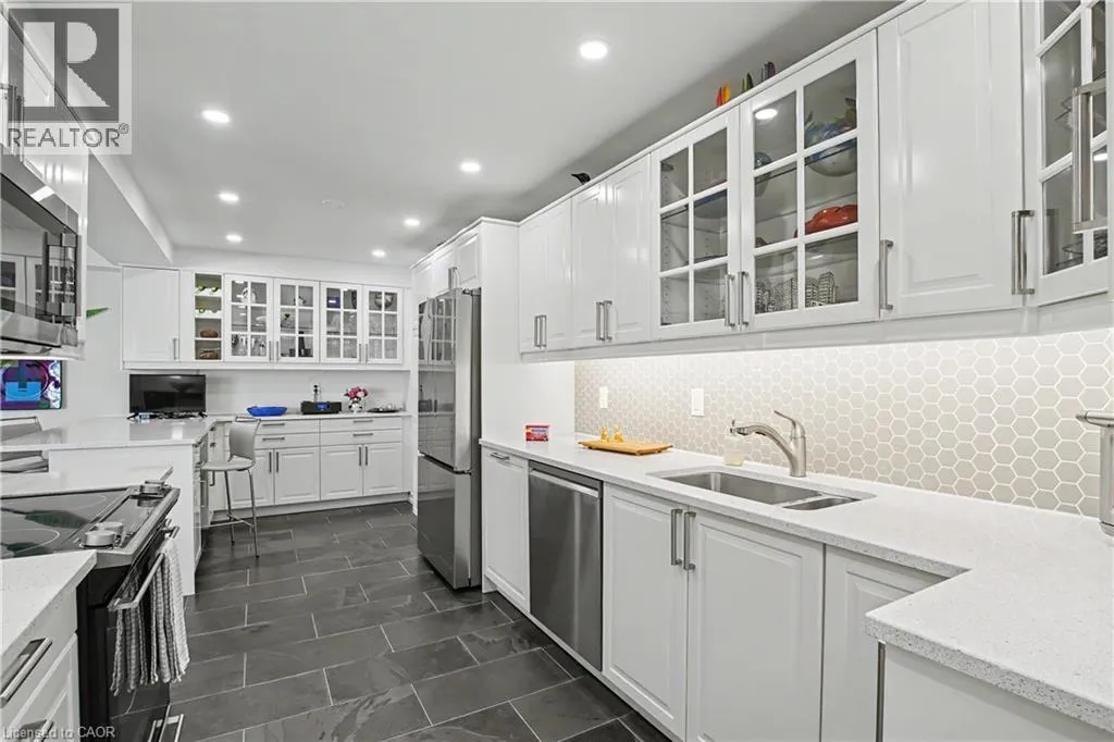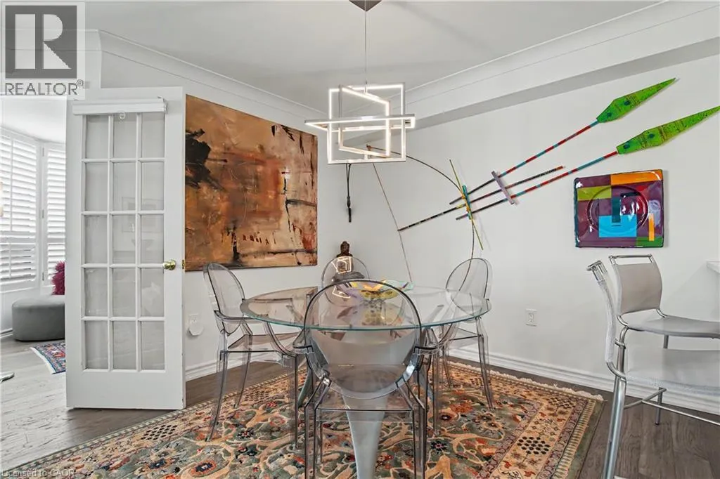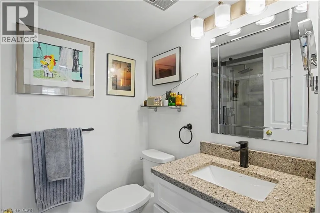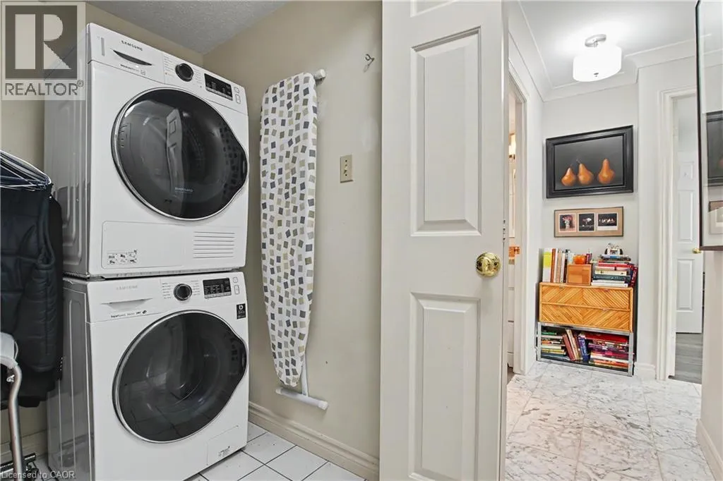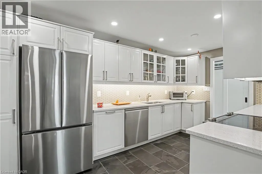 Brant Street to Lakeshore Rd, East of Martha St Ideally located steps from Burlingtonâs vibrant downtown. 2121 Lakeshore Road, 'Village Gate', is an exclusive boutique condominium with just 39 units. A well-managed and meticulously maintained building offering a welcoming lobby with intercom and hands-free entry. Welcome to SUITE 405 a fully renovated 2-bedroom, 2 bath plus Den. The galley-style kitchen with breakfast bar is open to the dining room. Features include: white cabinetry offering abundant storage, glass display cabinets, quartz countertops, stylish backsplash, stainless steel appliances, pot lights, and slate flooring. The open-concept living, dining, and den are bright and inviting, highlighted by bay windows, California shutters, smooth ceilings and engineered hardwood flooring. Thoughtfully curated and full of character., each space flows seamlessly into the next, creating an inviting atmosphere that feels both stylish and personal. The result is a warm, gallery-like setting that celebrates creativity while maintaining comfort and functionality. The Spacious Principal Bedroom includes a bay window, engineered hardwood flooring, California shutters, and a walk-in closet, along with a private 4-piece Ensuite featuring an updated vanity and tub/shower combination. The second bedroom also features a bay window and engineered hardwood flooring. A 3-piece main bath offers a glass-enclosed shower and vanity. Laundry w/stacking washer & dryer and additional storage space. Neutral paint, Smooth Ceilings throughout, Engineered Hardwood flooring, Linen Closet, Utility Closet. 1 Parking and 1 Locker. The outdoor spaces beautifully landscaped with benches to relax and enjoy the gardens and fresh air. Steps to downtown shops, cafes waterfront, arts, Hospital, grocery, malls, GO, local transit and so much more. Welcome Home to Unit 405 - 2121 Lakeshore Road, Burlington. (id:27476)