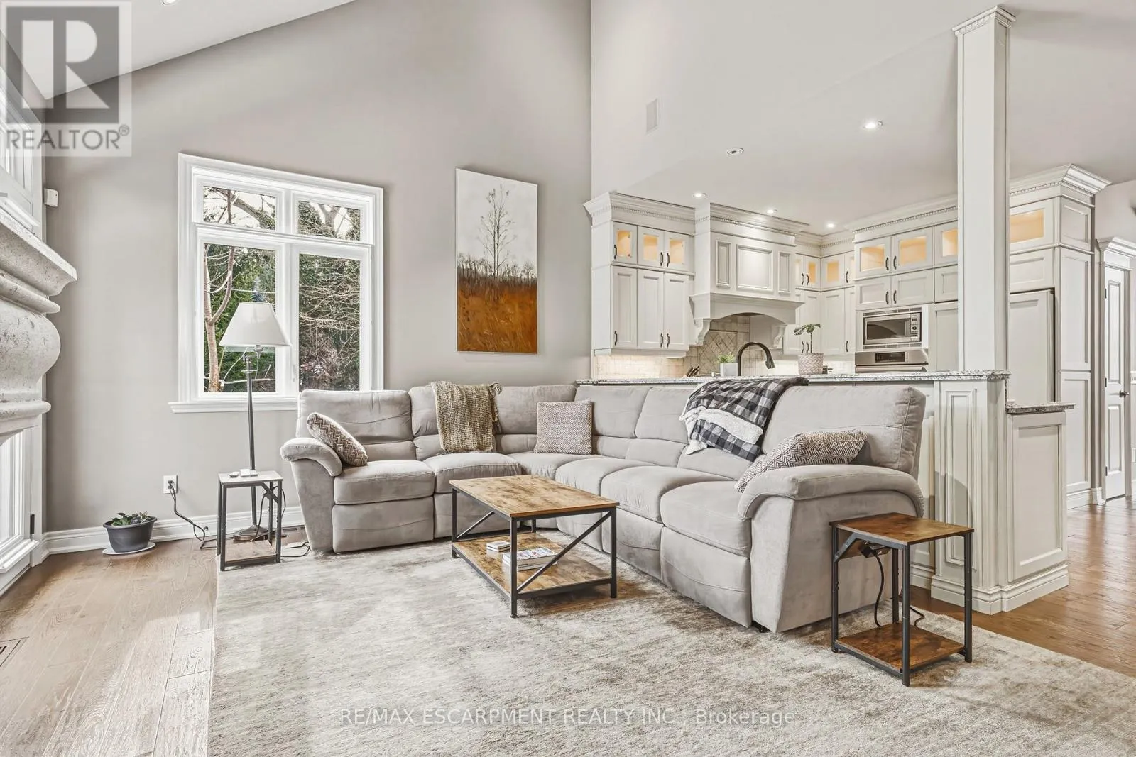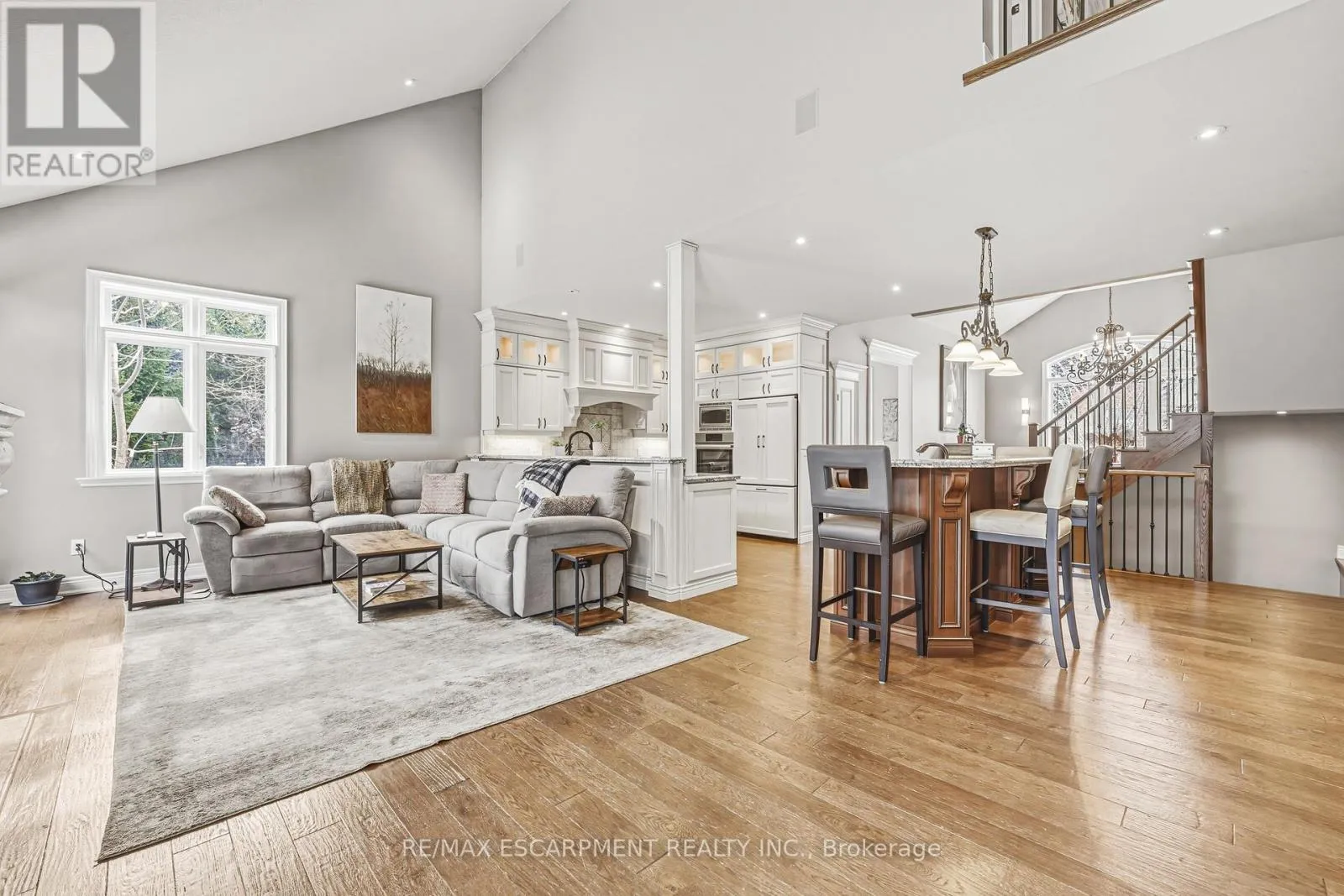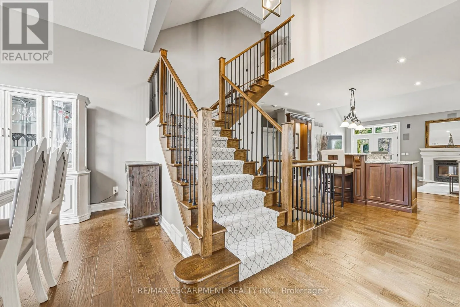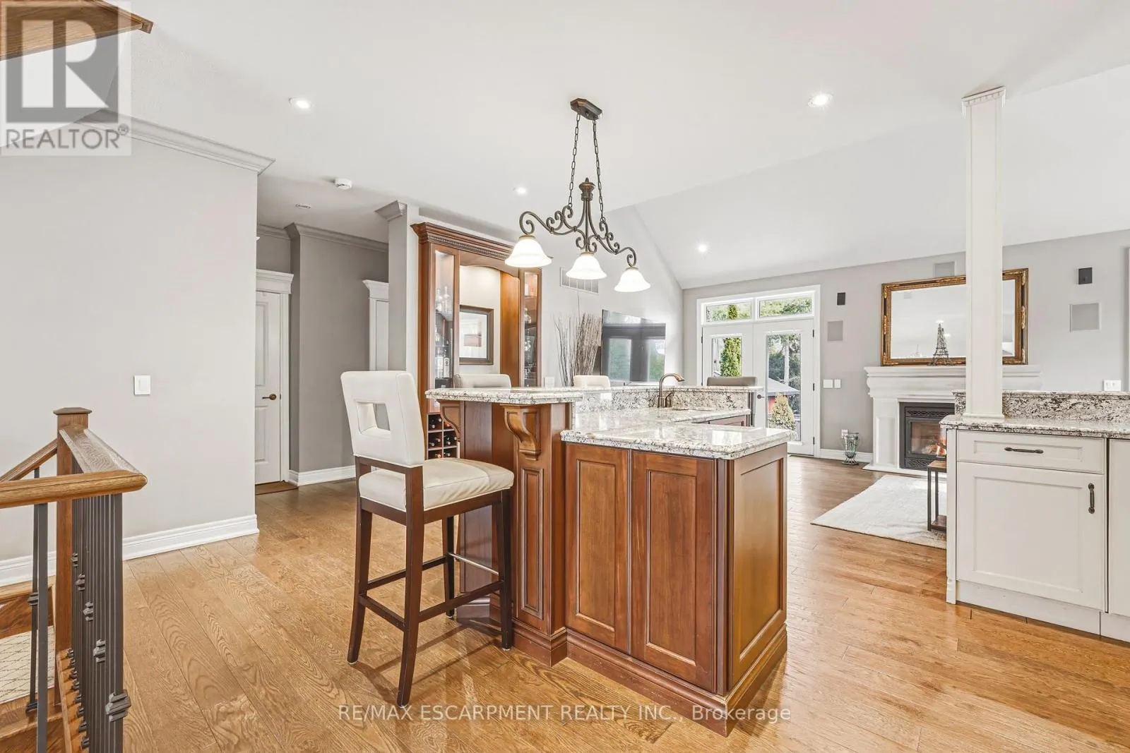 Plains Rd E & Shadeland Ave This STUNNING renovated, detached BUNGALOFT sits in a quiet enclave in Aldershot. Featuring 3+2 bedrooms, 3.5 bathrooms, over 2400 square feet PLUS a fully finished lower level and a DOUBLE car garage! The home features quality designer finishes and fixtures throughout. The open concept floor plan boasts vaulted ceilings, hardwood flooring and plenty of natural light. The large foyer opens to the dramatic, oversized dining room with 14' ceilings. The incredible kitchen features custom cabinetry, a large accent island, granite counters and top-quality appliances. The kitchen flows directly to the large 2-storey family room which includes custom built-ins, a gas fireplace, in-wall speakers and two sets of french doors leading to the private backyard. The large primary bedroom has a walk-in closet and a spa-like 4-piece ensuite with heated flooring. The main level also includes a separate powder room and garage access! The 2nd level includes 2 spacious bedrooms, a beautiful 4-piece bathroom and laundry room. The professionally finished lower level features 9 ft ceilings, radiant in-floor heat flooring throughout, 2 bedrooms AND a den, a 3-piece bathroom, large rec room / media room and plenty of storage space! The exterior of the home has been extensively landscaped and features a private low maintenance backyard with a large deck and turf! Amazing location- close to all amenities and transportation! (id:27476)