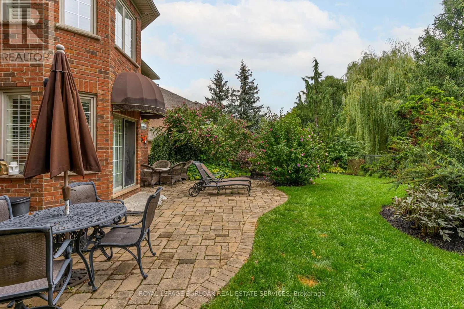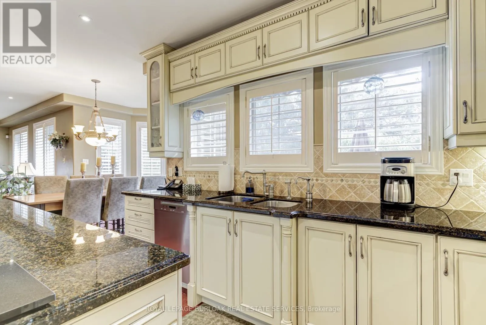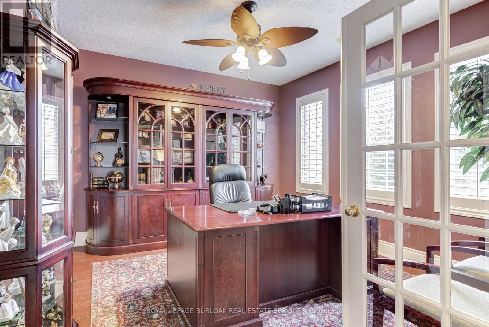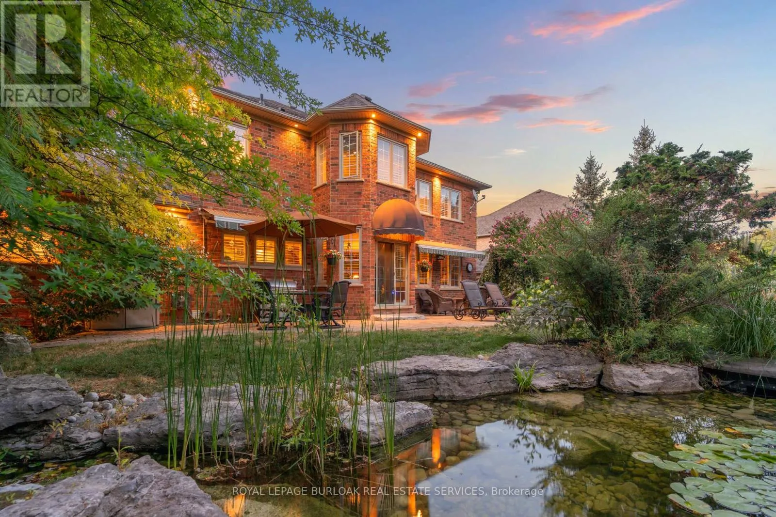 Cross Streets: Millcroft Park Drive. ** Directions: Millcroft Park Drive to Clubview Drive. A home built to last, set on a large lot in prestigious Millcroft. This impressive two-storey residence offers over 5,300 sq. ft. of living space, including a fully finished basement, and backs onto the scenic Millcroft Golf Course for ultimate privacy. Designed for those who appreciate a classic layout, the main floor features a formal living room and a private home office off the spacious foyer. The heart of the home spans the rear, where the kitchen, dining, and family room create a seamless space ideal for both entertaining and everyday living. The gourmet eat-in kitchen showcases solid cabinetry with detailed millwork, stone countertops, and stainless steel appliances. A custom laundry room with access to the tandem garage, along with a powder room, completes the main level. Upstairs, you'll find four generously sized bedrooms, two with ensuite access. The west-facing primary suite is filled with natural light and includes a luxurious 5-piece ensuite with double vanity, soaker tub, walk-in shower, water closet, and dedicated makeup area. A large walk-in closet and cozy gas fireplace add both function and comfort. The finished lower level adds over 1,700 sq. ft., featuring a spacious recreation area, 3-piece bath with sauna, a den with potential for a fifth bedroom, and walk-up access to the garage. Step outside to a private backyard retreat with an interlock patio, multiple seating areas, and a custom water garden with a two-tier waterfall overlooking the ravine. Additional highlights include heated floors in all upstairs bathrooms, a tandem garage with parking for four cars, and a four-car driveway. Built by Monarch, this home offers exceptional quality and craftsmanship on a quiet corner lot. (id:27476)