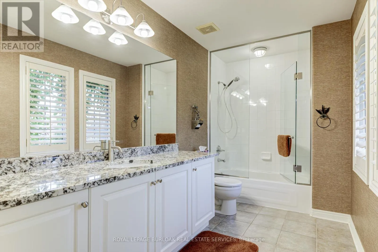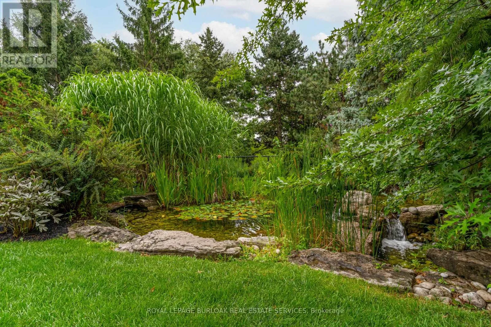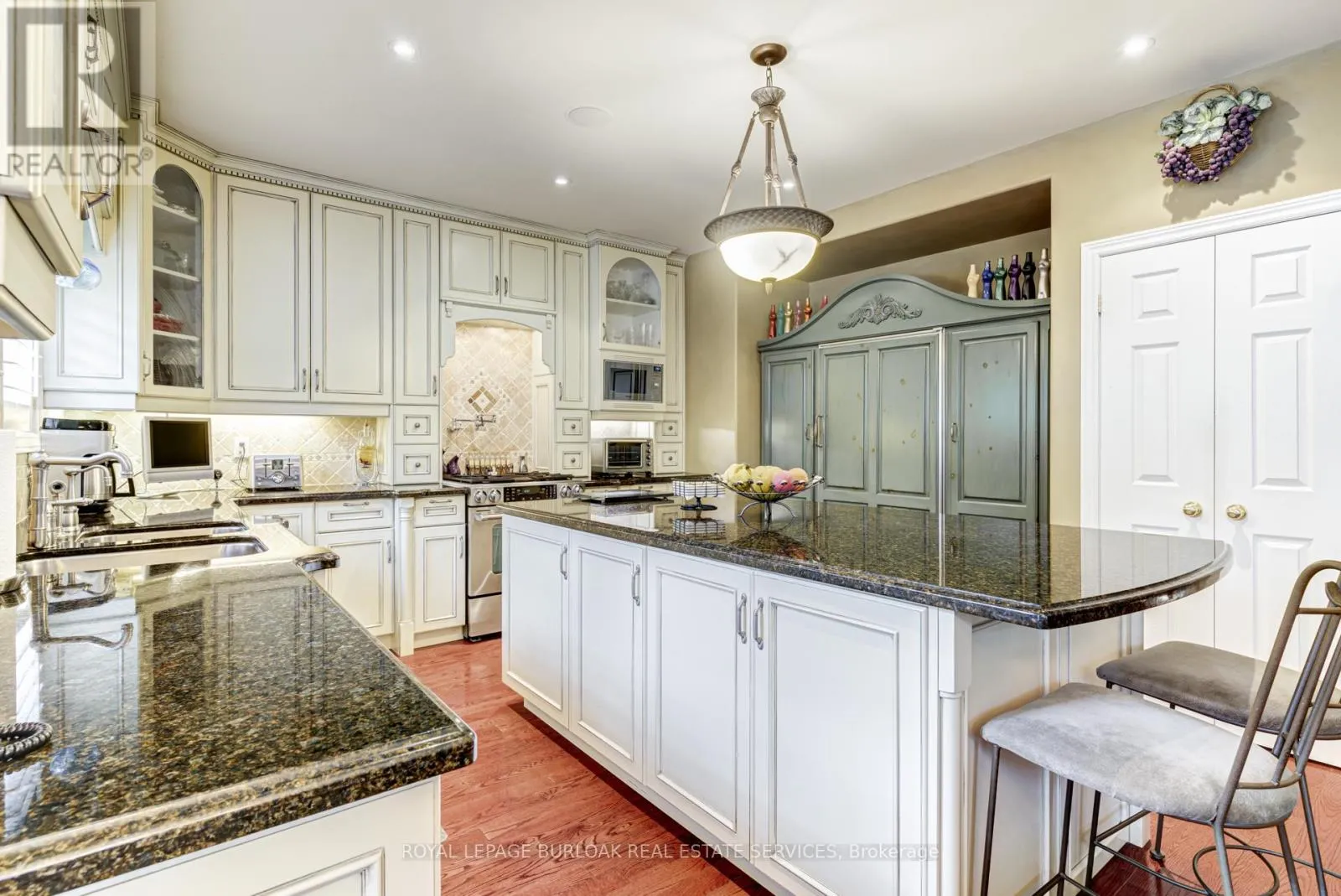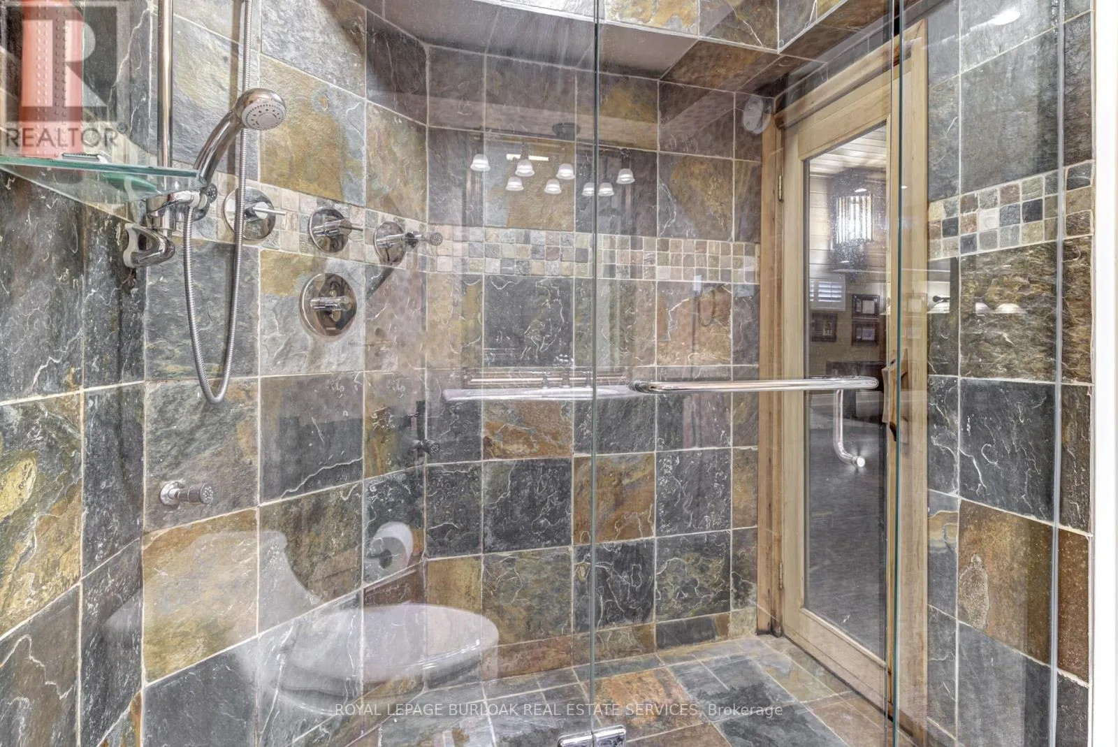Cross Streets: Millcroft Park Drive. ** Directions: Millcroft Park Drive to Clubview Drive. A home built to last, set on a large lot in prestigious Millcroft. This impressive two-storey residence offers over 5,300 sq. ft. of living space, including a fully finished basement, and backs onto the scenic Millcroft Golf Course for ultimate privacy. Designed for those who appreciate a classic layout, the main floor features a formal living room and a private home office off the spacious foyer. The heart of the home spans the rear, where the kitchen, dining, and family room create a seamless space ideal for both entertaining and everyday living. The gourmet eat-in kitchen showcases solid cabinetry with detailed millwork, stone countertops, and stainless steel appliances. A custom laundry room with access to the tandem garage, along with a powder room, completes the main level. Upstairs, you'll find four generously sized bedrooms, two with ensuite access. The west-facing primary suite is filled with natural light and includes a luxurious 5-piece ensuite with double vanity, soaker tub, walk-in shower, water closet, and dedicated makeup area. A large walk-in closet and cozy gas fireplace add both function and comfort. The finished lower level adds over 1,700 sq. ft., featuring a spacious recreation area, 3-piece bath with sauna, a den with potential for a fifth bedroom, and walk-up access to the garage. Step outside to a private backyard retreat with an interlock patio, multiple seating areas, and a custom water garden with a two-tier waterfall overlooking the ravine. Additional highlights include heated floors in all upstairs bathrooms, a tandem garage with parking for four cars, and a four-car driveway. Built by Monarch, this home offers exceptional quality and craftsmanship on a quiet corner lot. (id:27476)