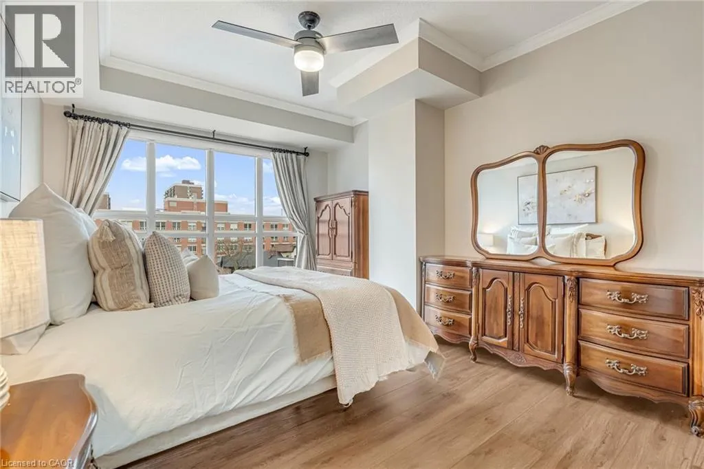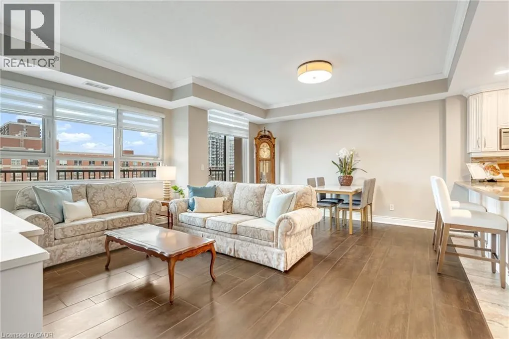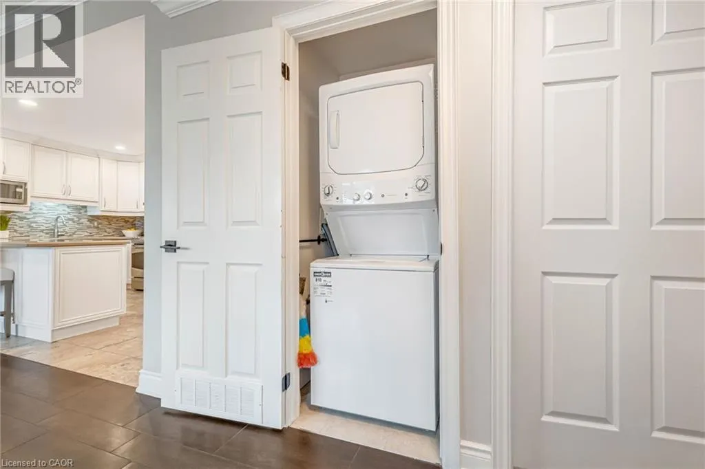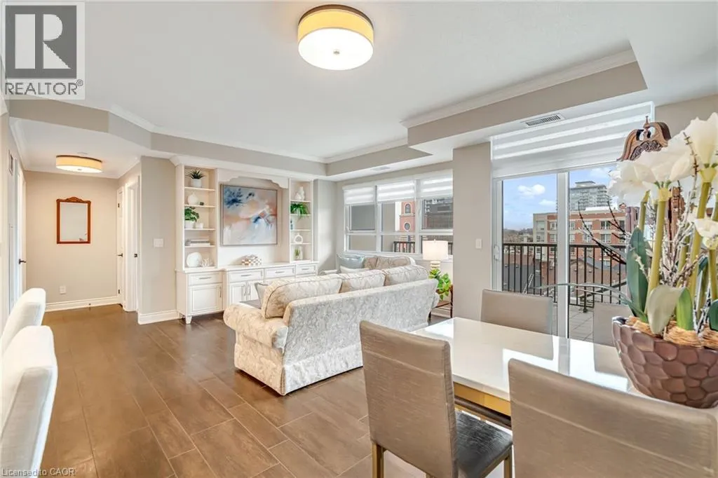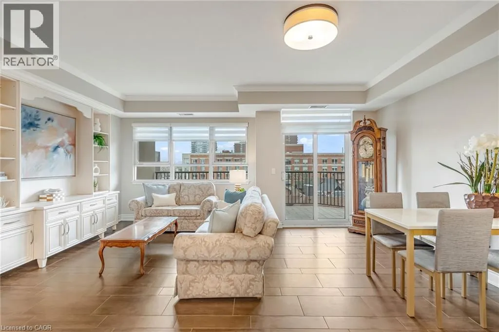 Lakeshore Road to Elizabeth Street Location, location. Welcome to The Baxter, one of downtown Burlingtonâs most desirable condo residences, where everything you need is right at your doorstep; restaurants, boutique shopping, grocery stores, the lakefront, Spencer Smith Park, and scenic walking and biking trails. This spacious and beautifully updated one-bed, one-bath suite offers approximately 871 sq ft. of thoughtfully designed living space. The unit has been tastefully renovated with a custom kitchen featuring soft-close cabinetry, Caesarstone countertops, pot drawers, and custom millwork, complemented by new flooring and updated lighting throughout. A large north-facing balcony extends your living space outdoors and overlooks The Village Square. Additional highlights include ensuite laundry, an oversized storage locker conveniently located just across the hall, and secure underground parking. Residents enjoy recently renovated common areas, concierge service, and exceptional value with all-inclusive maintenance fees covering heat, hydro, water, parking, locker, and as of June 1, 2026 will also include high-speed internet and cable with streaming services. An ideal opportunity to enjoy a low-maintenance lifestyle in Burlingtonâs vibrant and ever-growing downtown core. (id:27476)