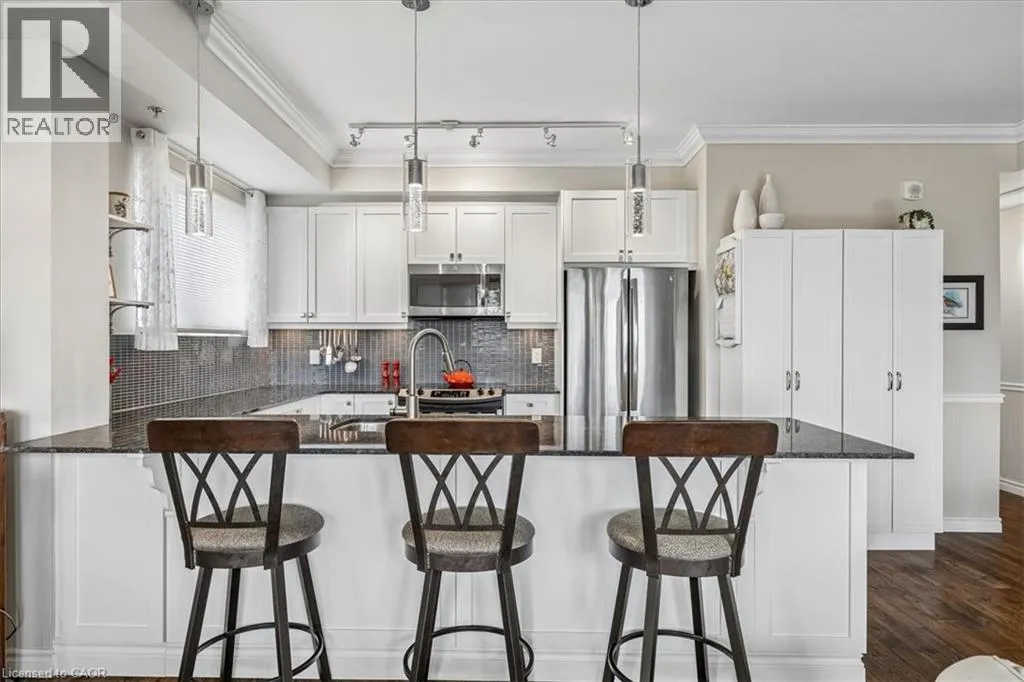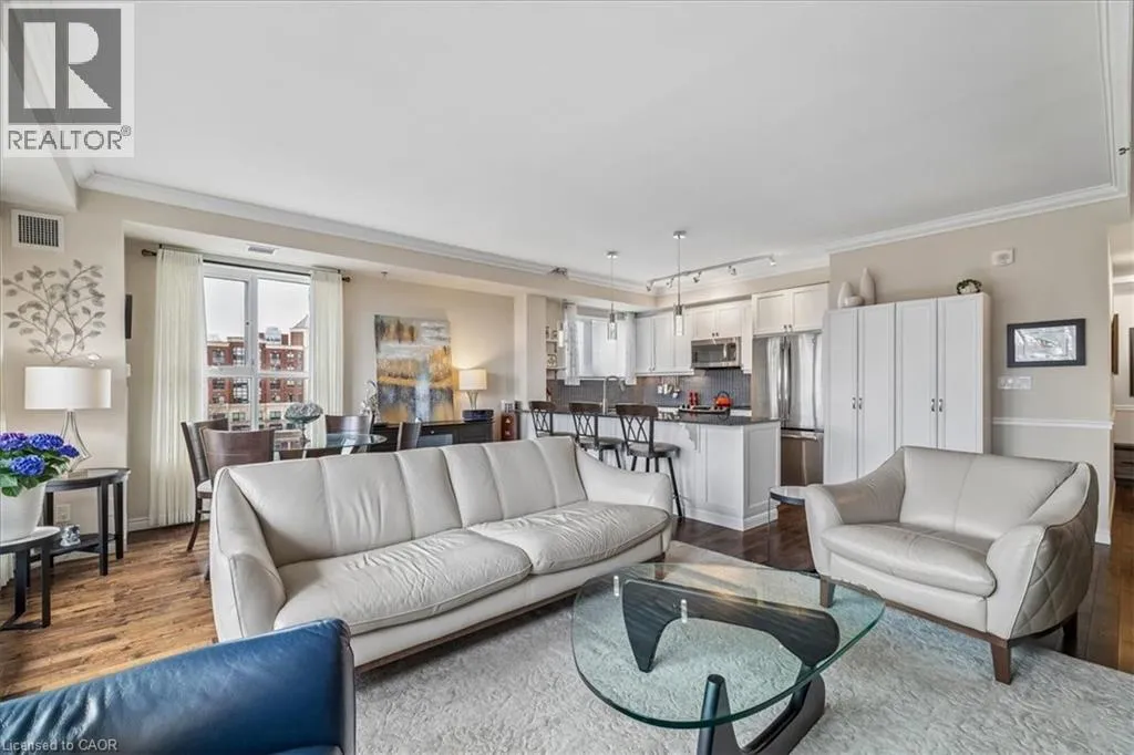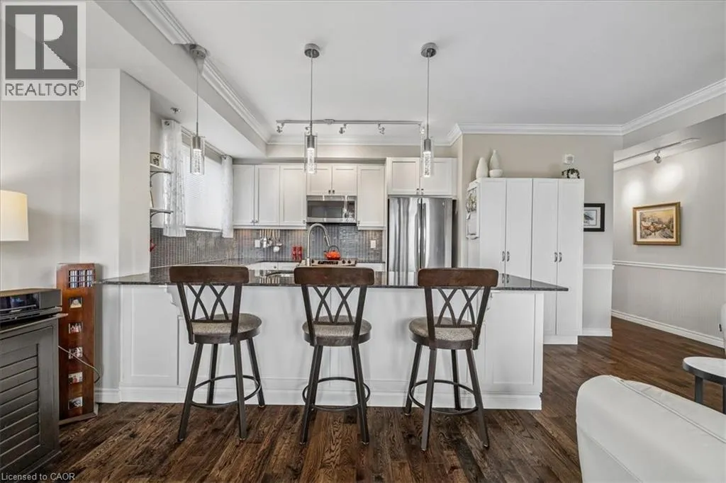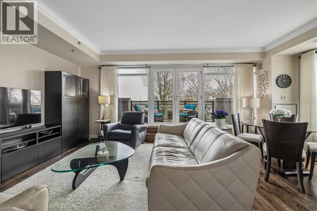 403 East, South on Waterdown Road, East onto Plains Road East Welcome to Suite 408 @ 34 Plains Road East in Aldershot. A gorgeous Boutique styled 1,147 sq ft condo with South West exposure to beautifully landscaped backyards - just like having your own backyard, with no maintenance required! Huge living and dining area that holds a large built-in entertainment/TB console. Step out of the entertainment area thru French doors onto a 220 sq ft outdoor Retreat with retractable screen doors and a semi-covered roof, for rainy evenings. 2 spacious bedrooms with lots of light and escarpment views and 2 bathrooms supply lots of alternatives for guests. Chef's style upgraded kitchen with squeaky-clean Stainless Steel appliances, all soft close cupboards and drawers and granite counters. Note: bed in the master is a Murphy bed, which can be included. Mint condition. Hardwood throughout this unit, except for the 2 beds and 2 baths. Short stroll to LaSalle Park and the Marina. Also short walk to the Aldershot GO and quick driving access to the 403. Large storage locker and 2 parking spots make it a wonderful home in a wonderful location! (id:27476)