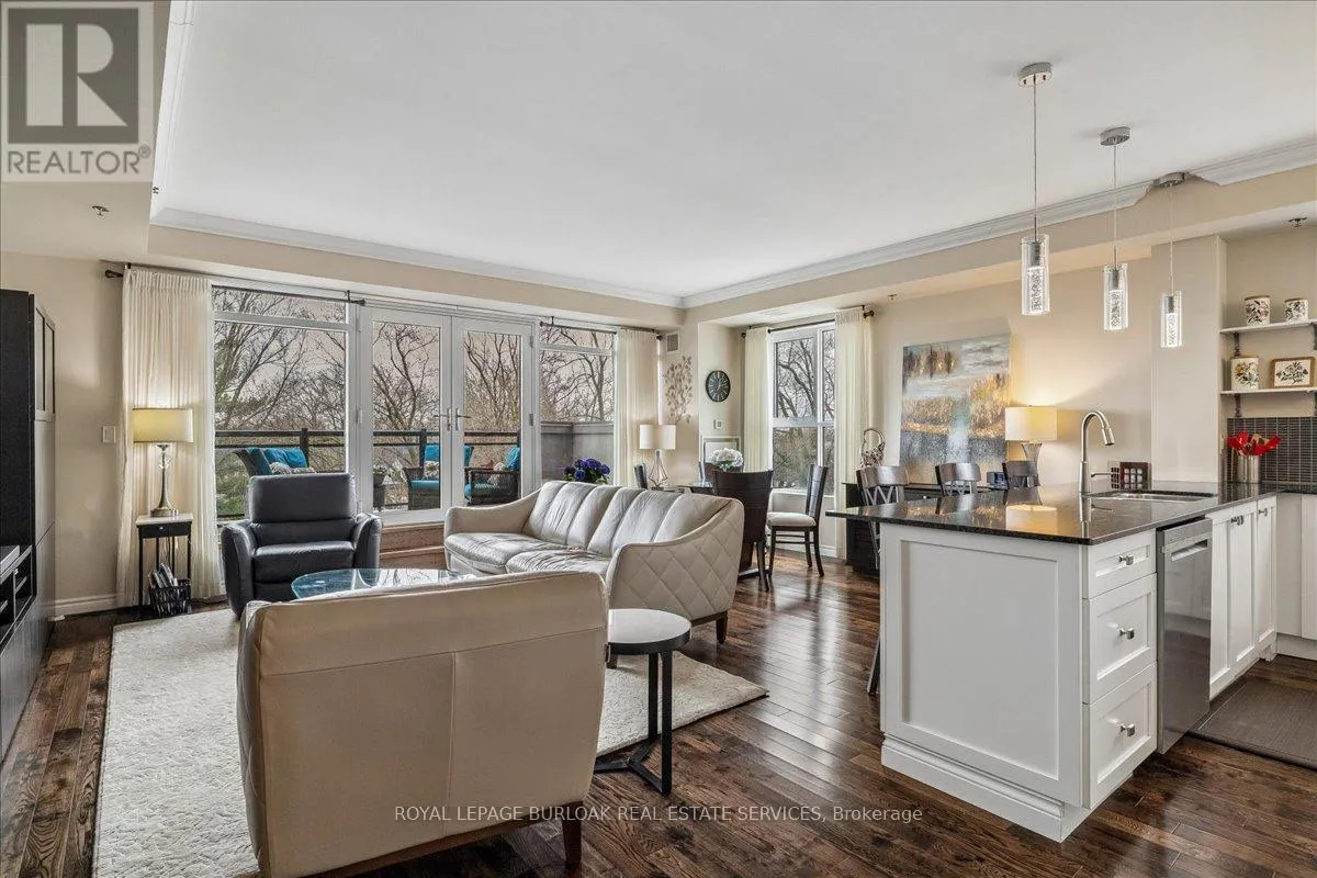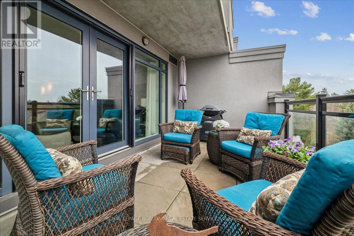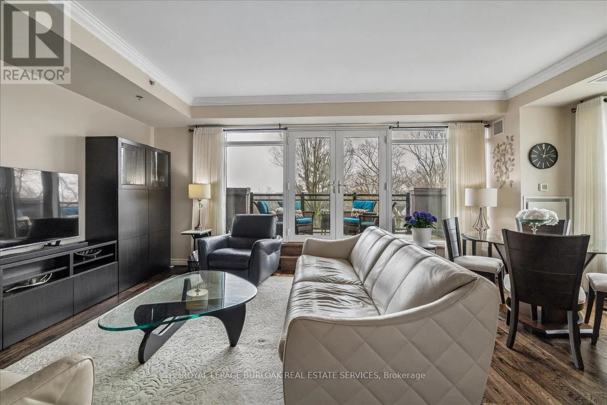 Cross Streets: Waterdown and LaSalle Park Road. ** Directions: Waterdown Road south to Plains Road and turn East. Welcome to Suite 408 @ 34 Plains Road East in Aldershot. A gorgeous "Boutique styled" 1,147 sq ft condo with South West exposure to beautifully landscaped backyards - just like having your own backyard, with no maintenance required! Huge living and dining area that holds a large built-in entertainment/TB console. Step out of the entertainment area thru French doors onto a 220 sq ft outdoor "Retreat" with retractable screen doors and a semi-covered roof, for rainy evenings. 2 spacious bedrooms with lots of light and escarpment views and 2 bathrooms supply lots of alternatives for guests. Chef's style upgraded kitchen with squeaky-clean Stainless Steel appliances, all soft close cupboards and drawers and granite counters. Note: bed in the master is a Murphy bed, which can be included. Mint condition. Hardwood throughout this unit, except for the 2 beds and 2 baths. Short stroll to LaSalle Park and the Marina. Also short walk to the Aldershot GO and quick driving access to the 403. Large storage locker and 2 parking spots make it a wonderful home in a wonderful location! (id:27476)